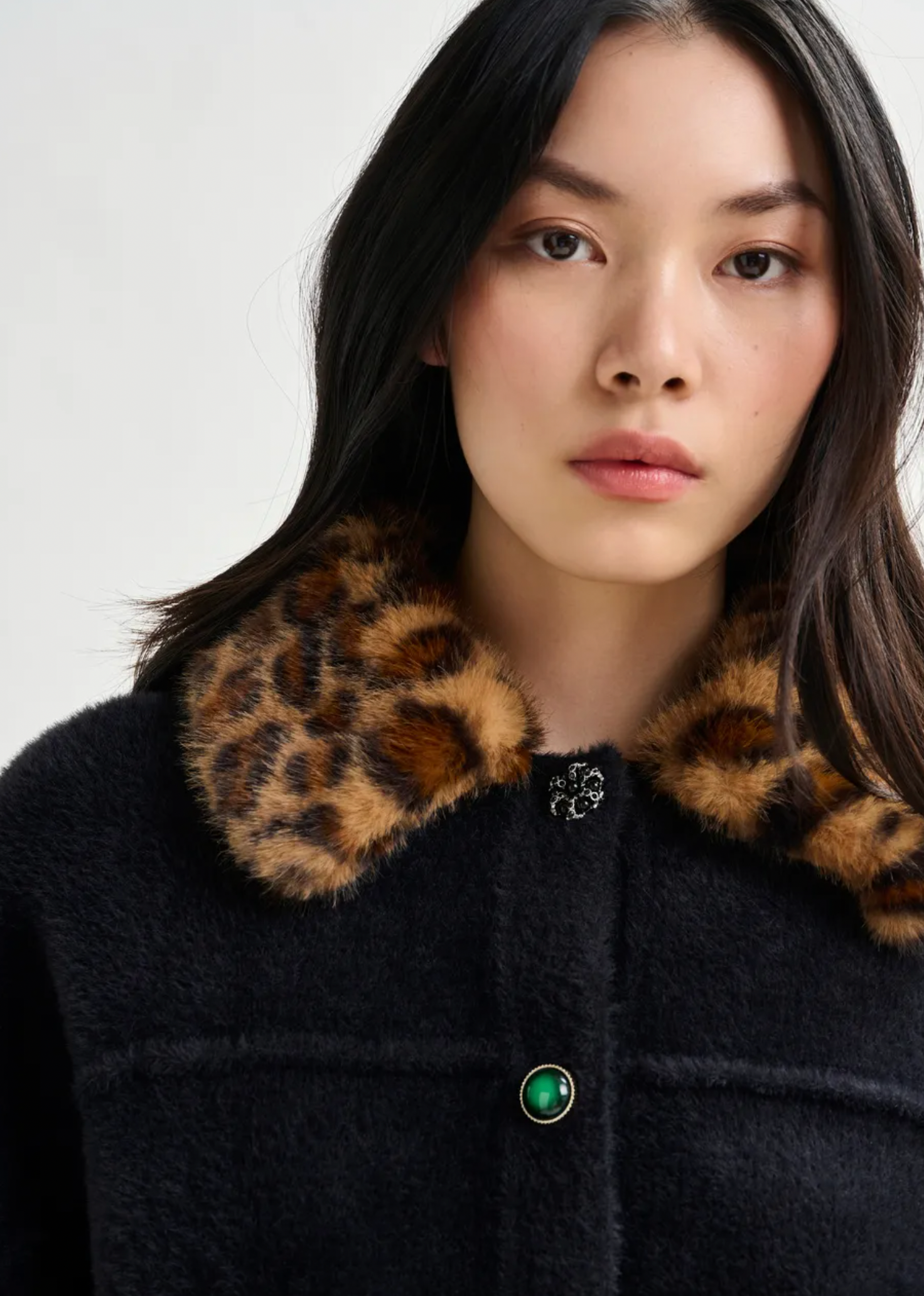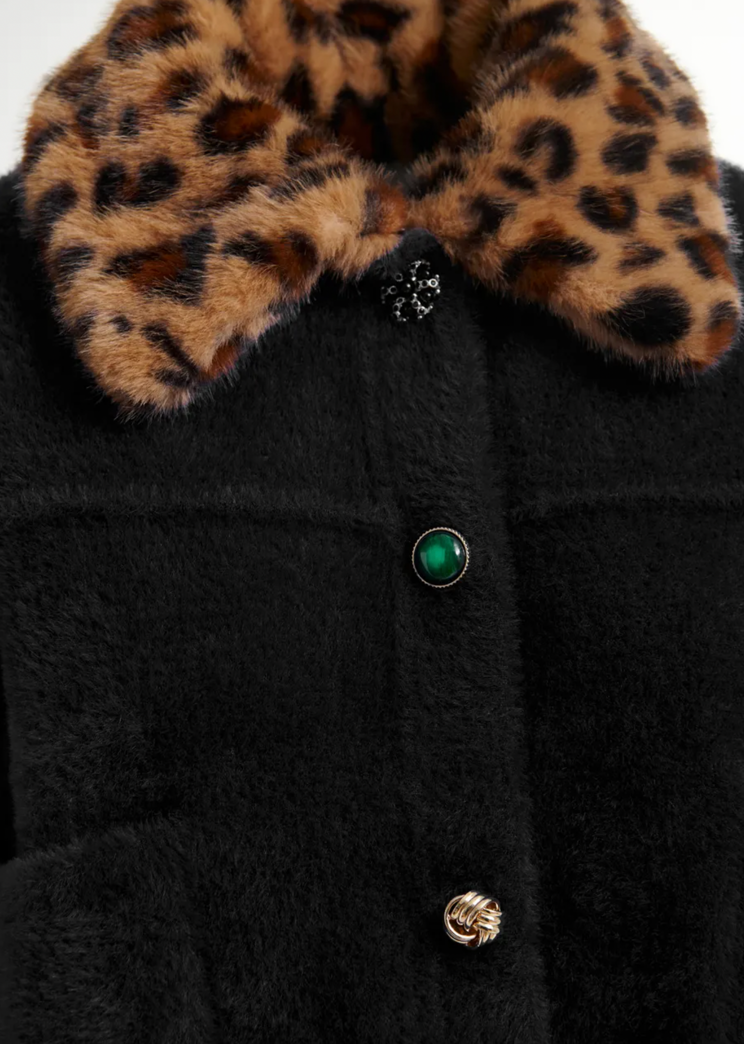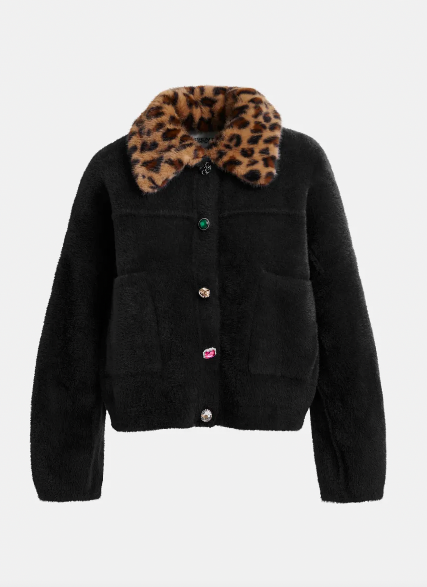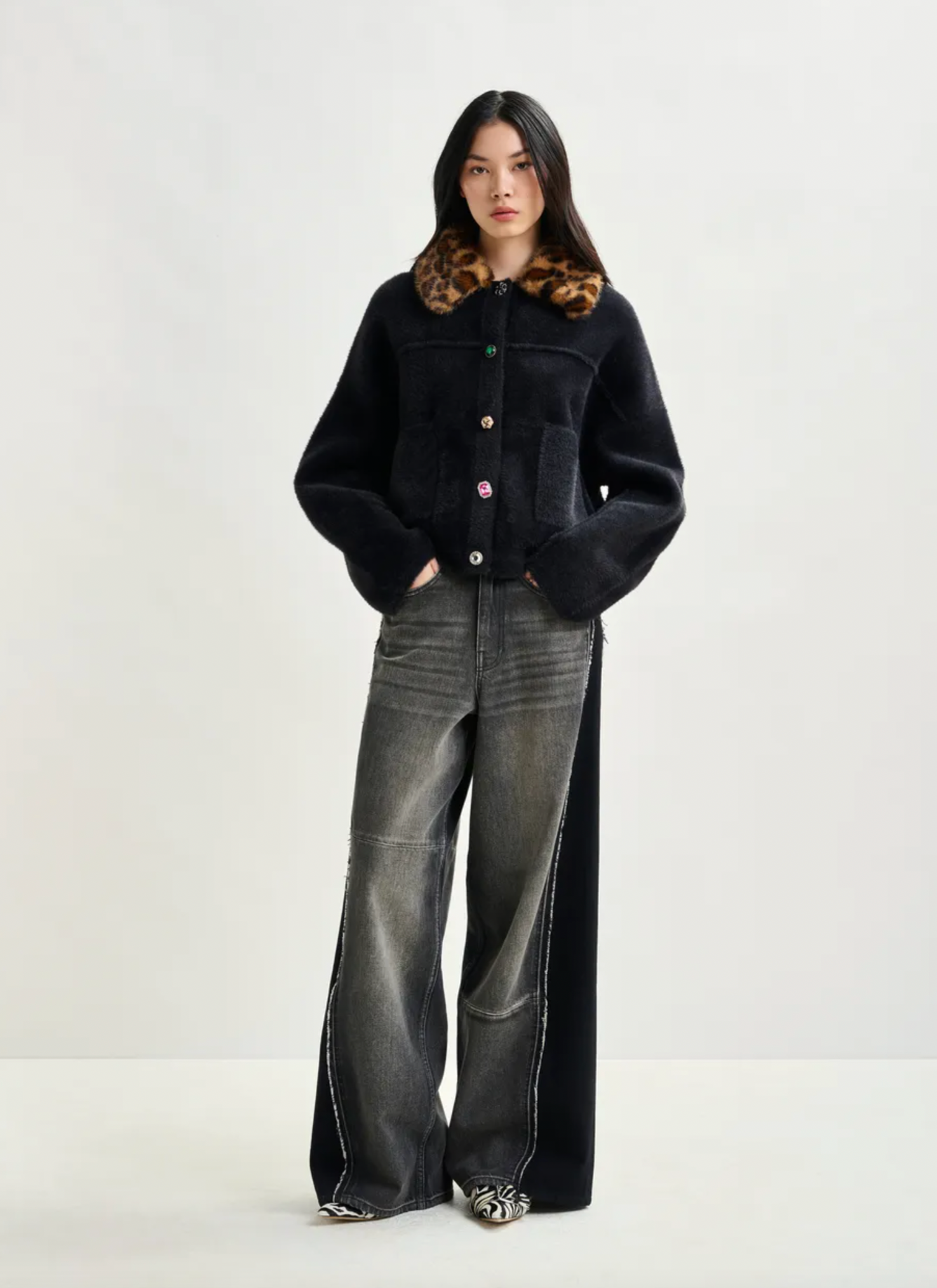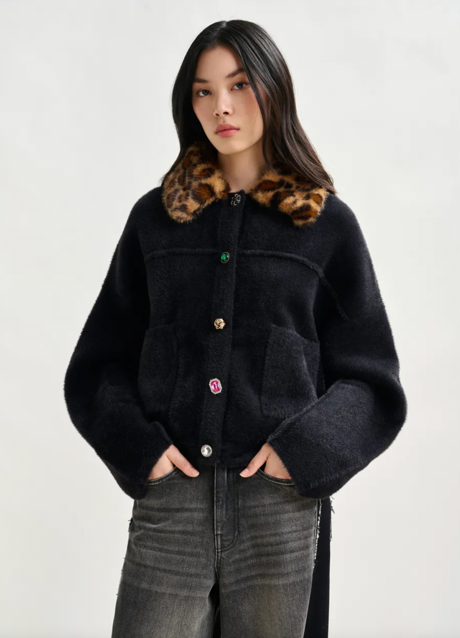 Eye-catching cardigan is designed for a relaxed fit. Featuring a mix of playful, mismatched buttons along with two functional patch pockets. This piece blends quirky charm with everyday comfort. The standout feature? A removable leopard-print faux fur collar that lets you switch up your style on a whim. Perfect for layering or making a statement all on its own.