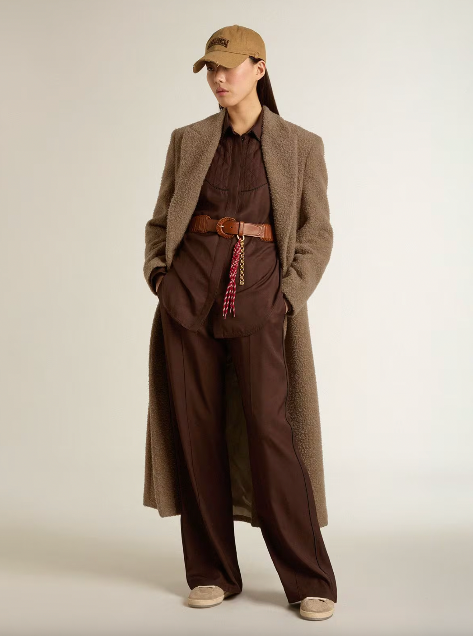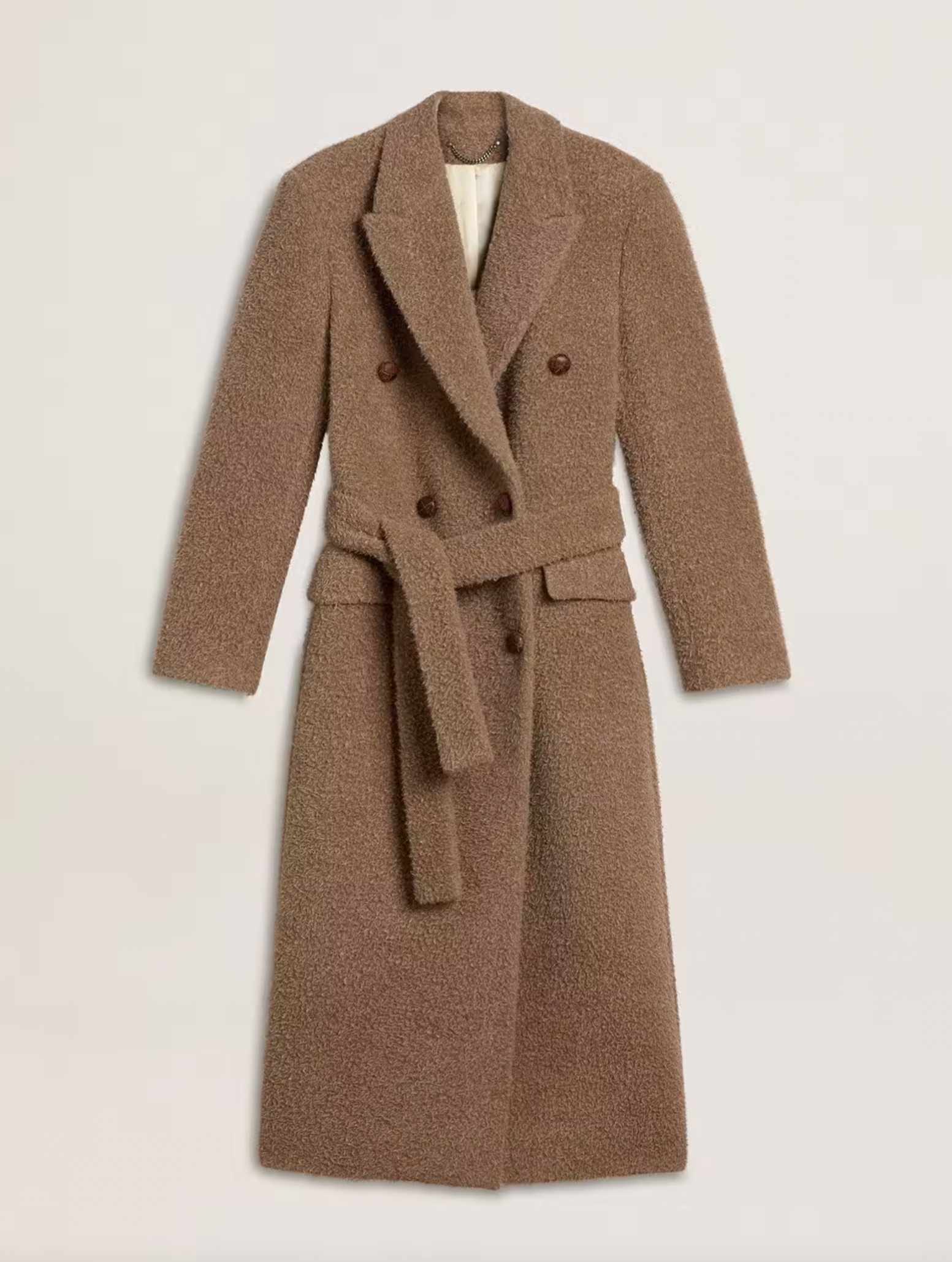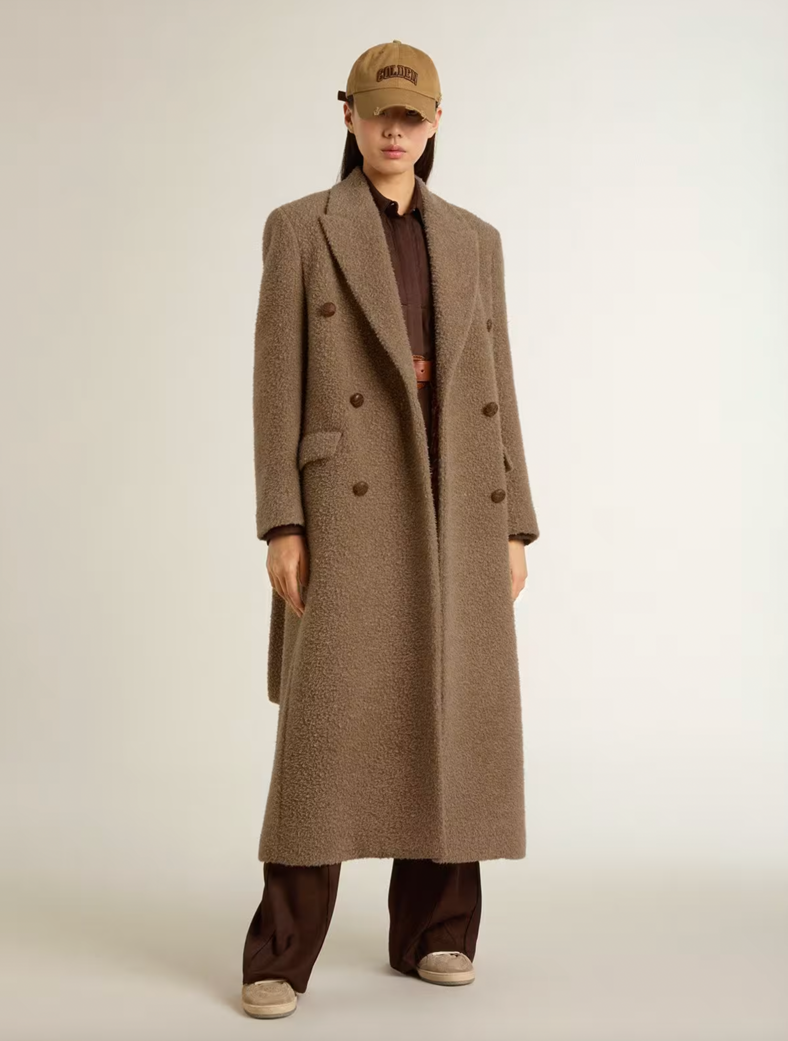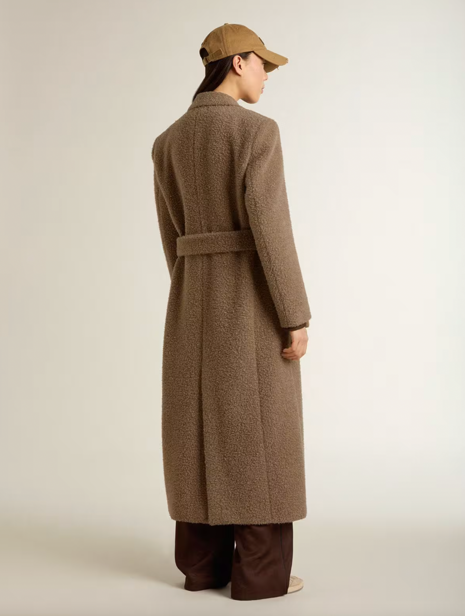 The second drop in the Fall/Winter 25 collection unfolds like a relaxed and refreshing journey, woven into the fabric of each and every piece. This double-breasted coat in a beige wool blend features a brown button fastening, two front pockets and a belt at the waist.