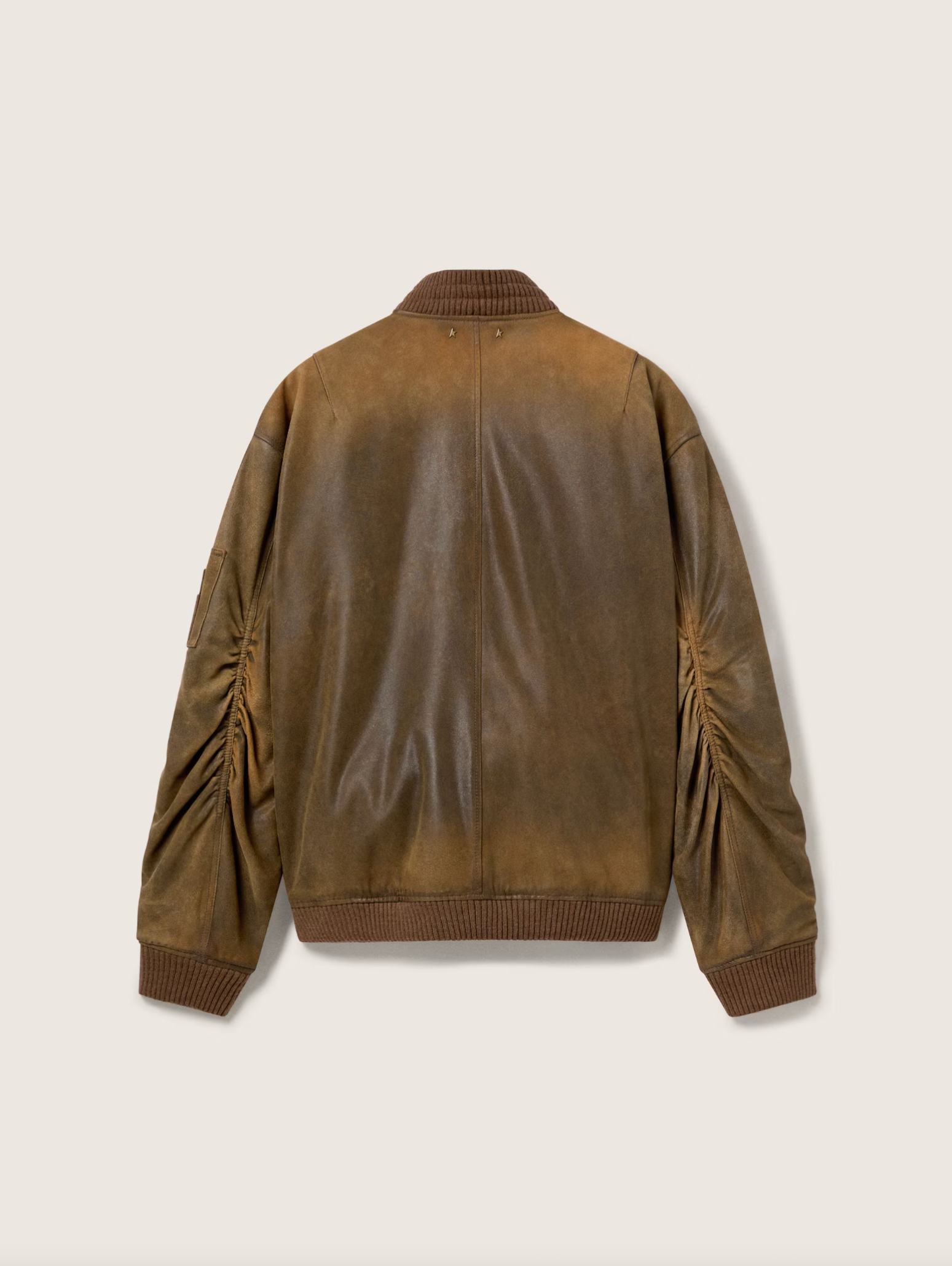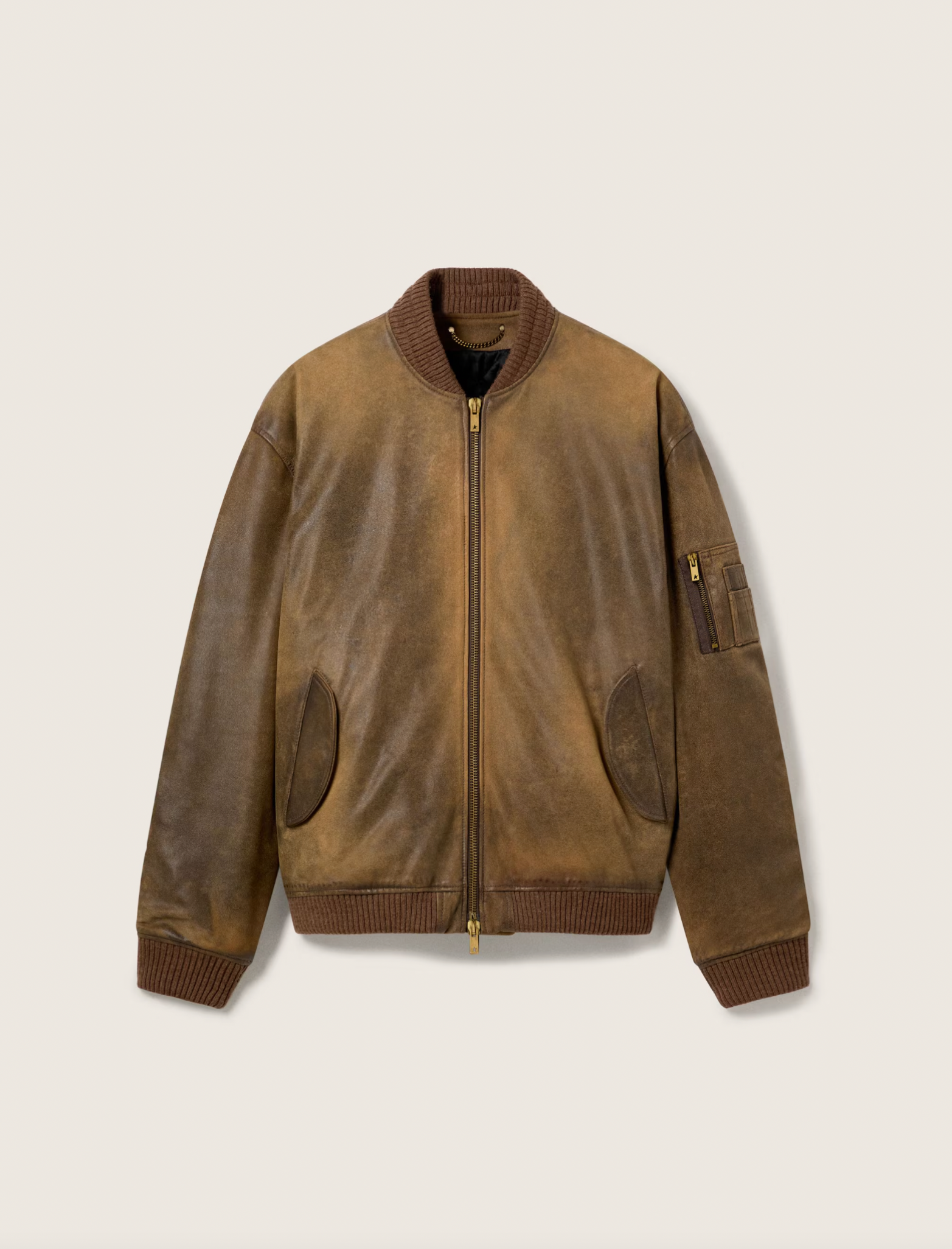 The third drop in our Fall/Winter 25 collection channels the funky glamor of the 1970s, a time when the night transformed into a canvas for unapologetic self-expression. Made of brown leather with a lived-in effect, this unisex biker jacket features a brown ribbed insert on the trims and neckline. Two pockets and a zip fastening add the finishing touch.