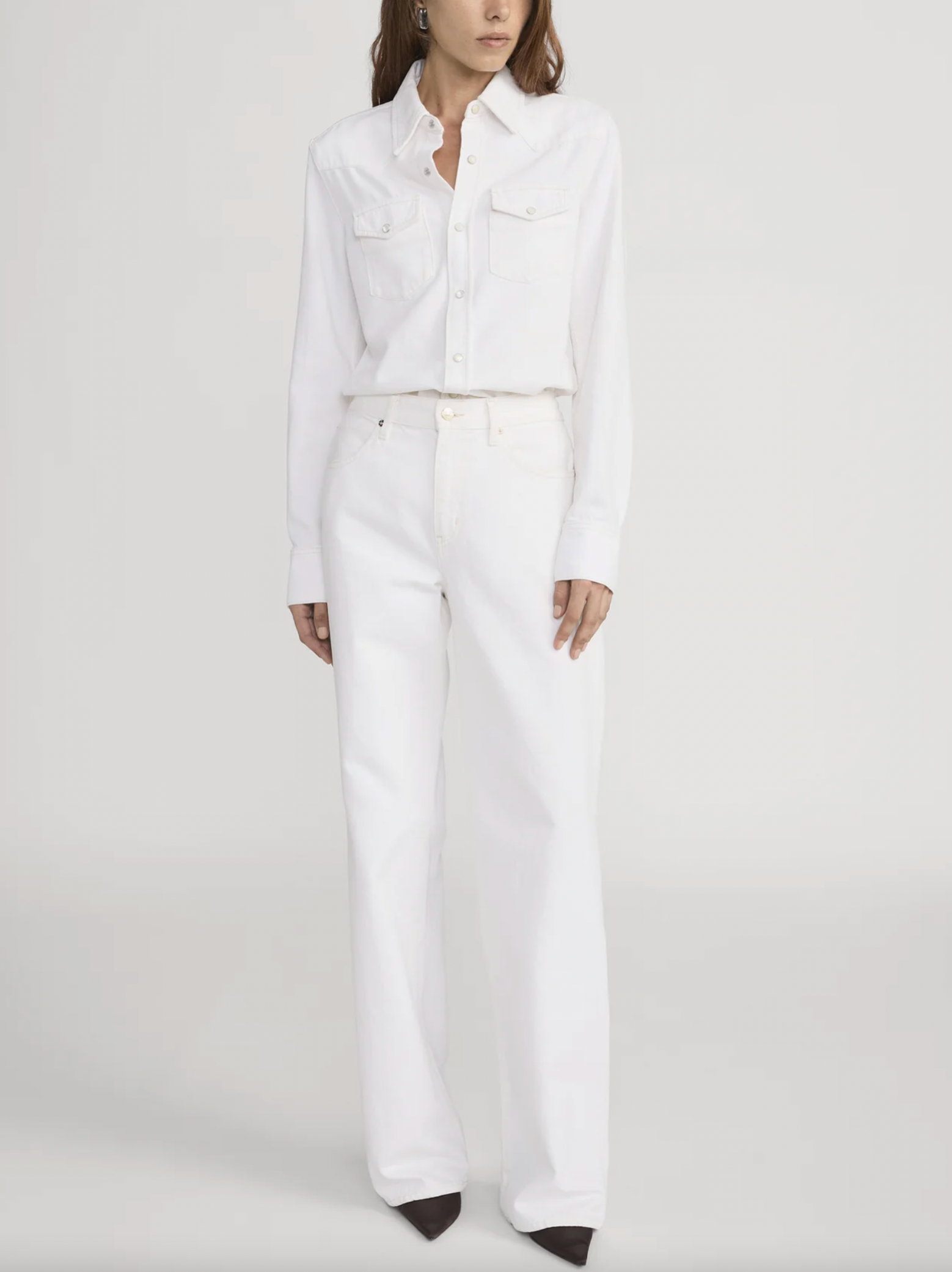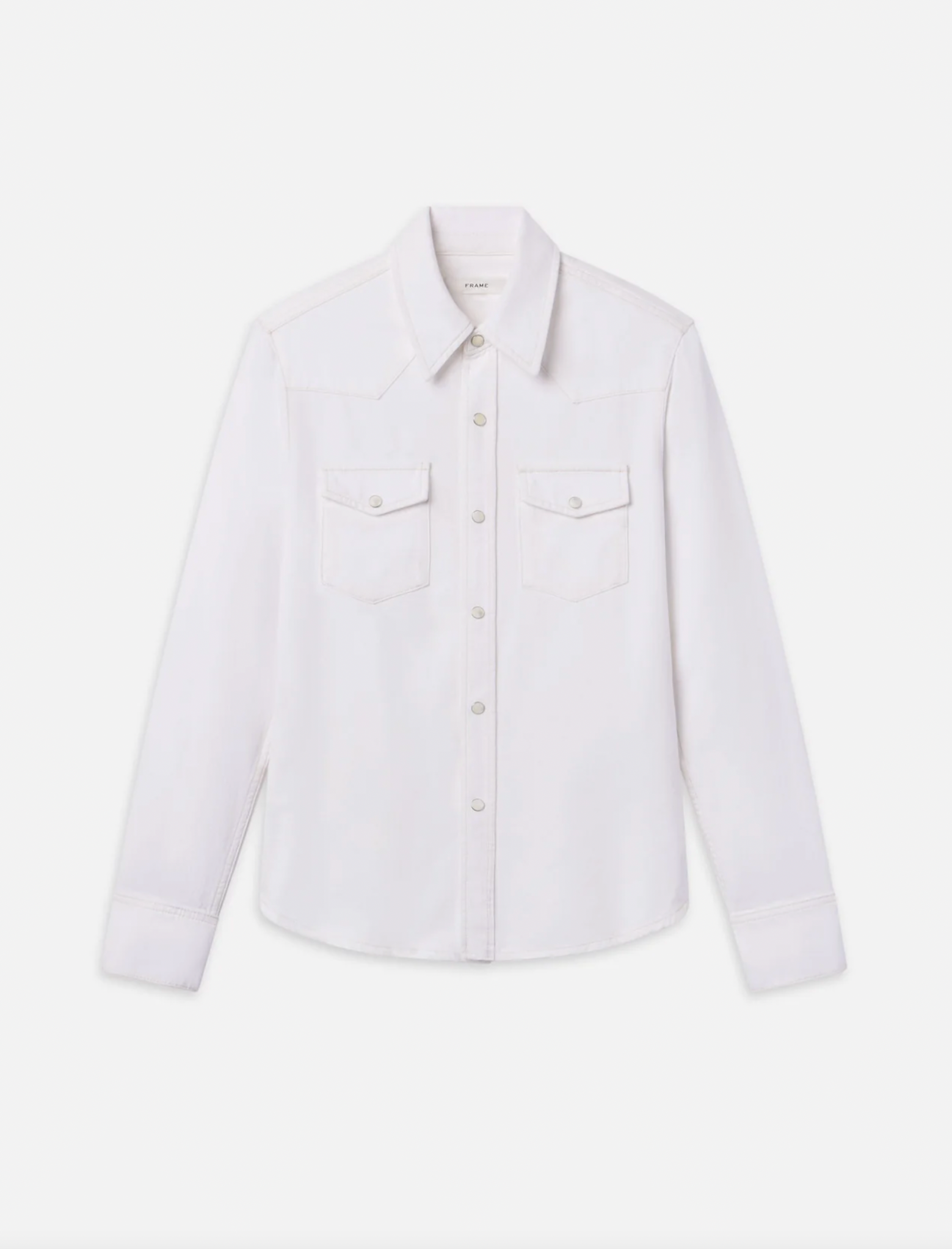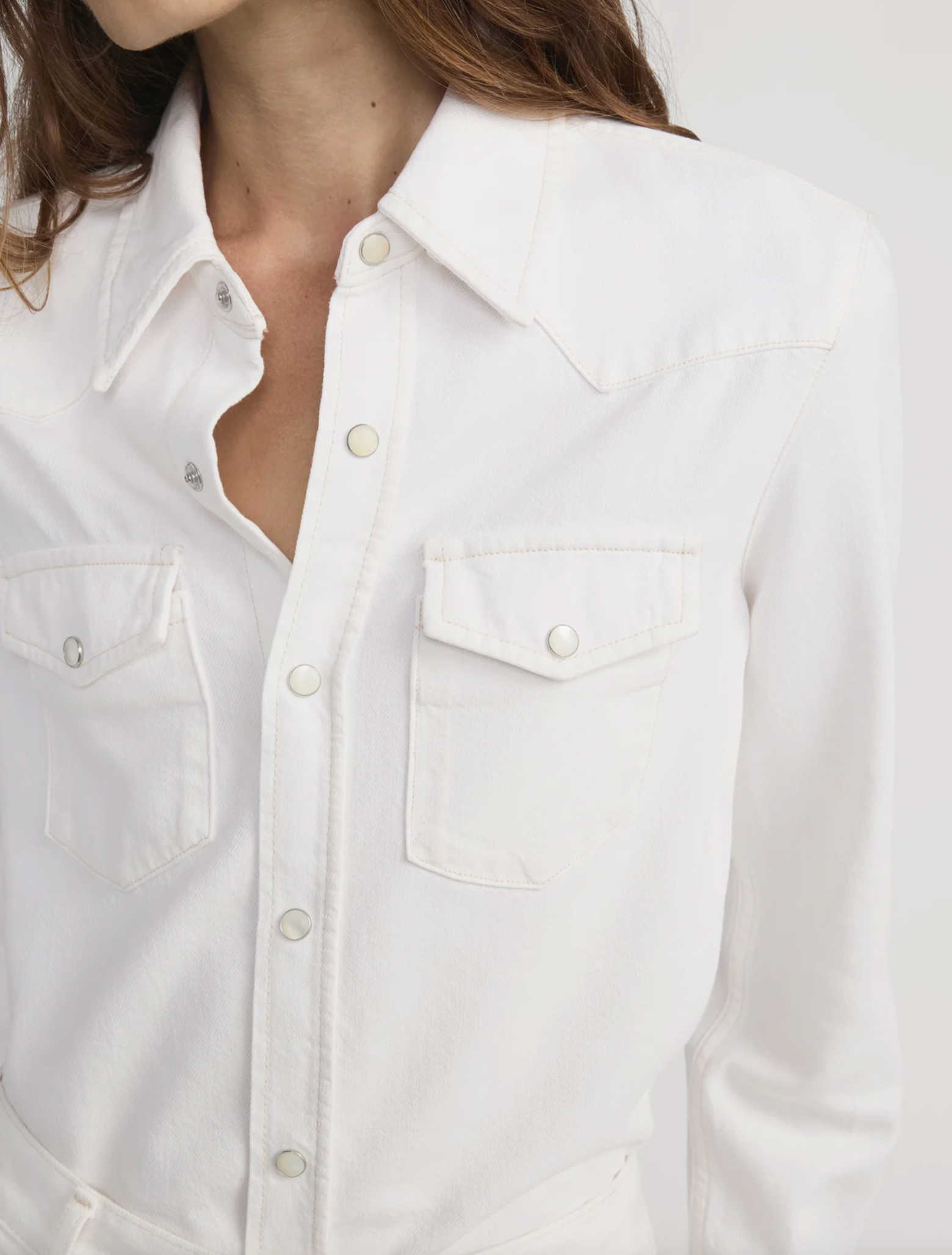 A classic rigid denim shirt with Western-inspired, pearl-finish snaps. Slim cut for a fitted look.