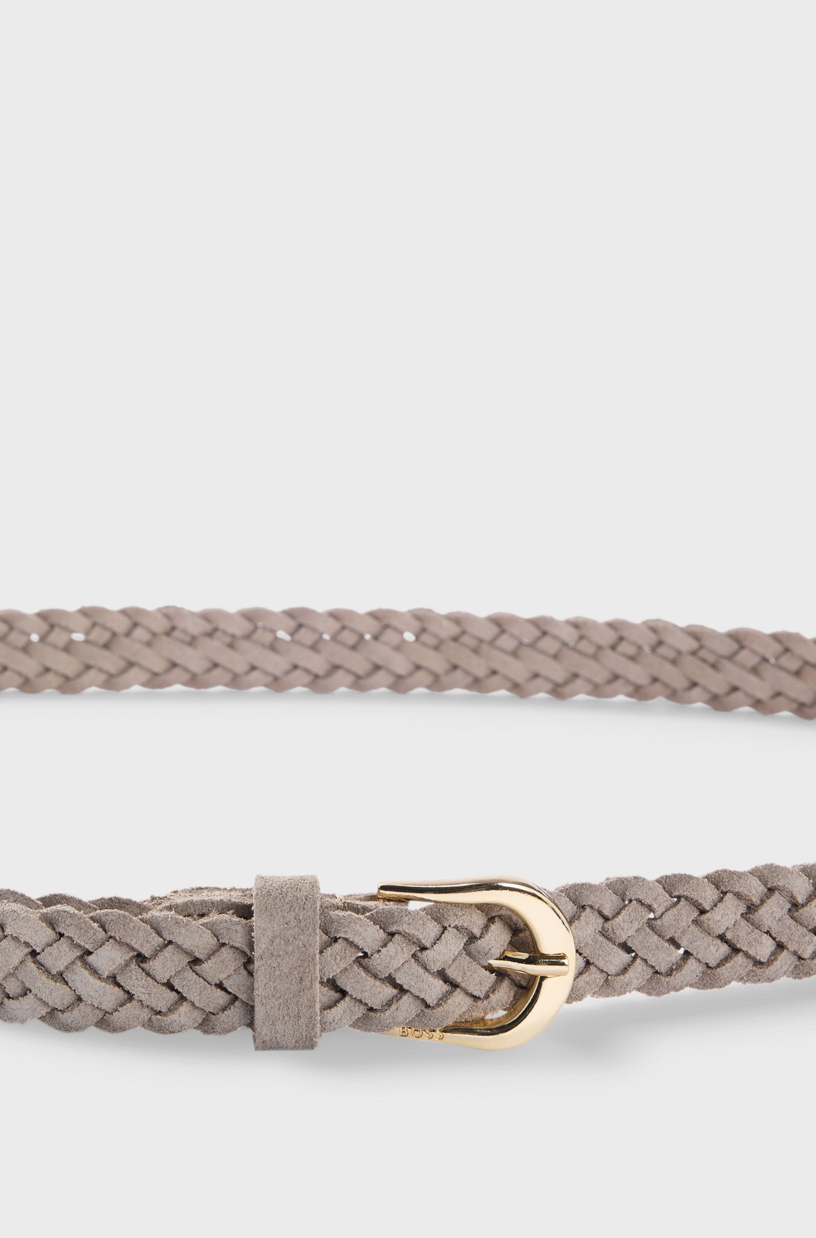 Cut to a 2cm width with a logo engraved on the rounded buckle, this BOSS Womenswear belt adds texture to any look. Soft, woven suede. For the best fit, we advise ordering a belt one size larger than your waist size. We continuously look for more responsible ways to produce and finish our products. A minimum of 60% of the leather used to make this product has been sourced from certified tanneries.