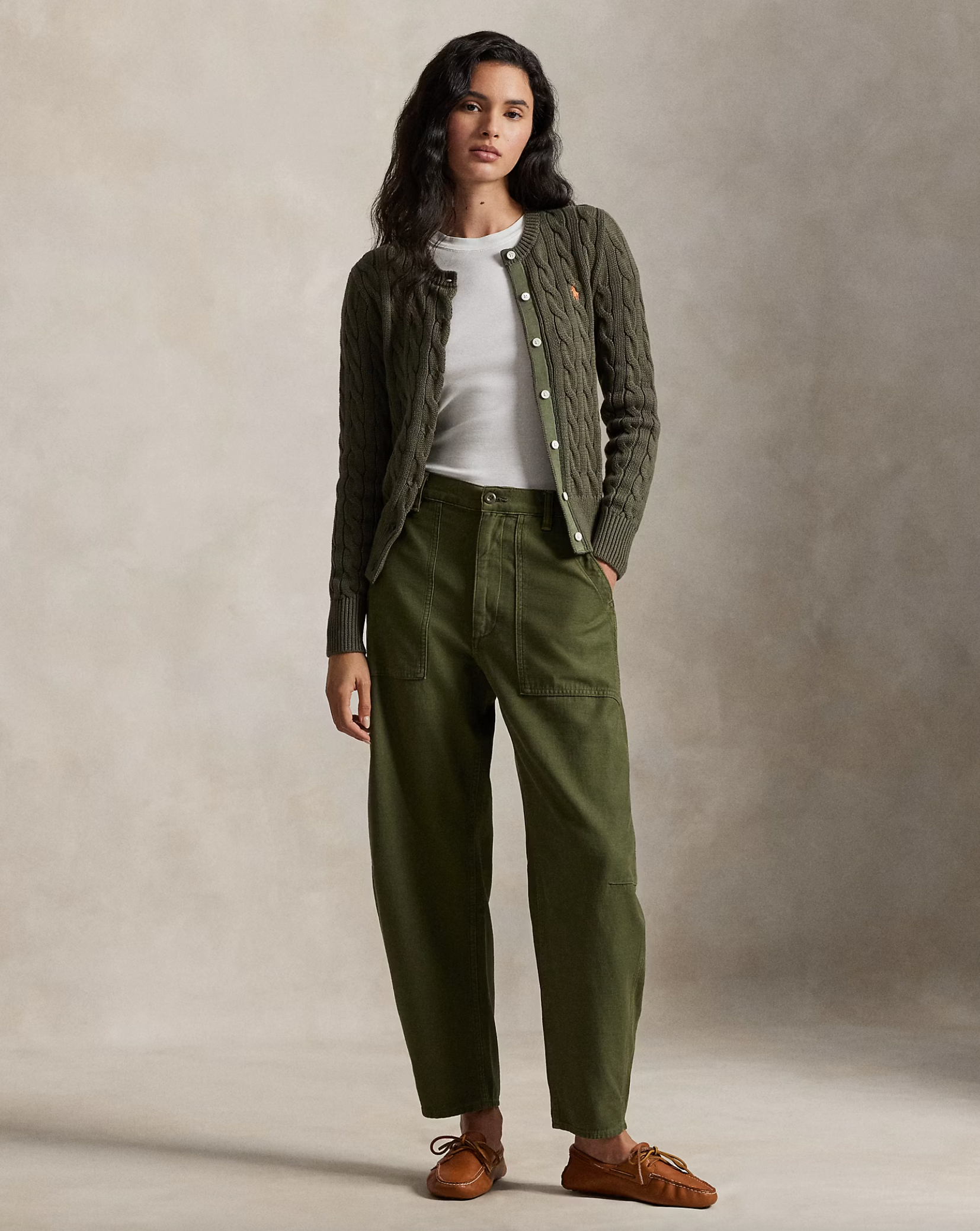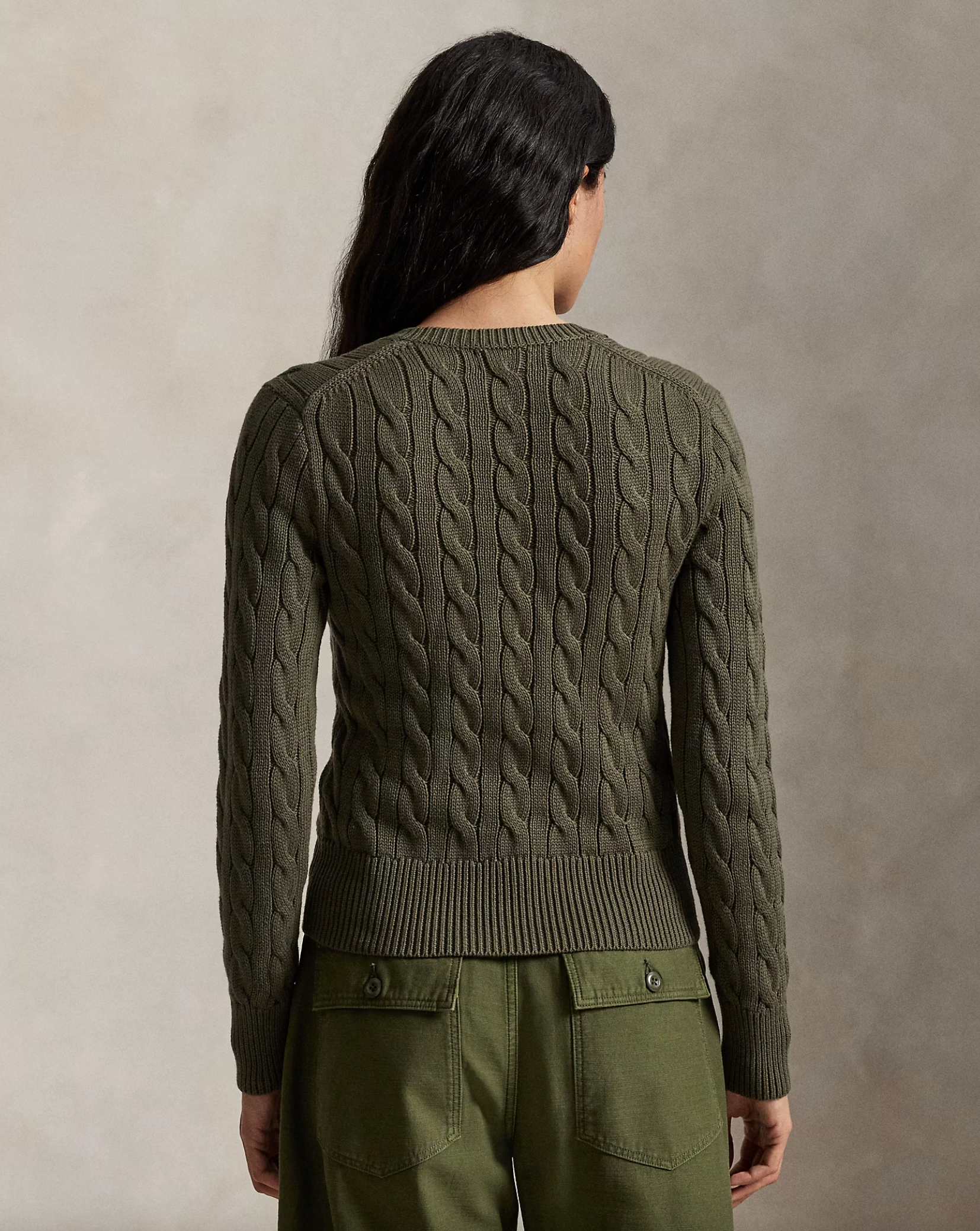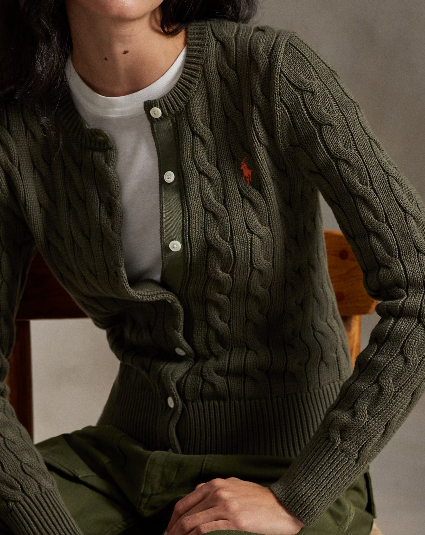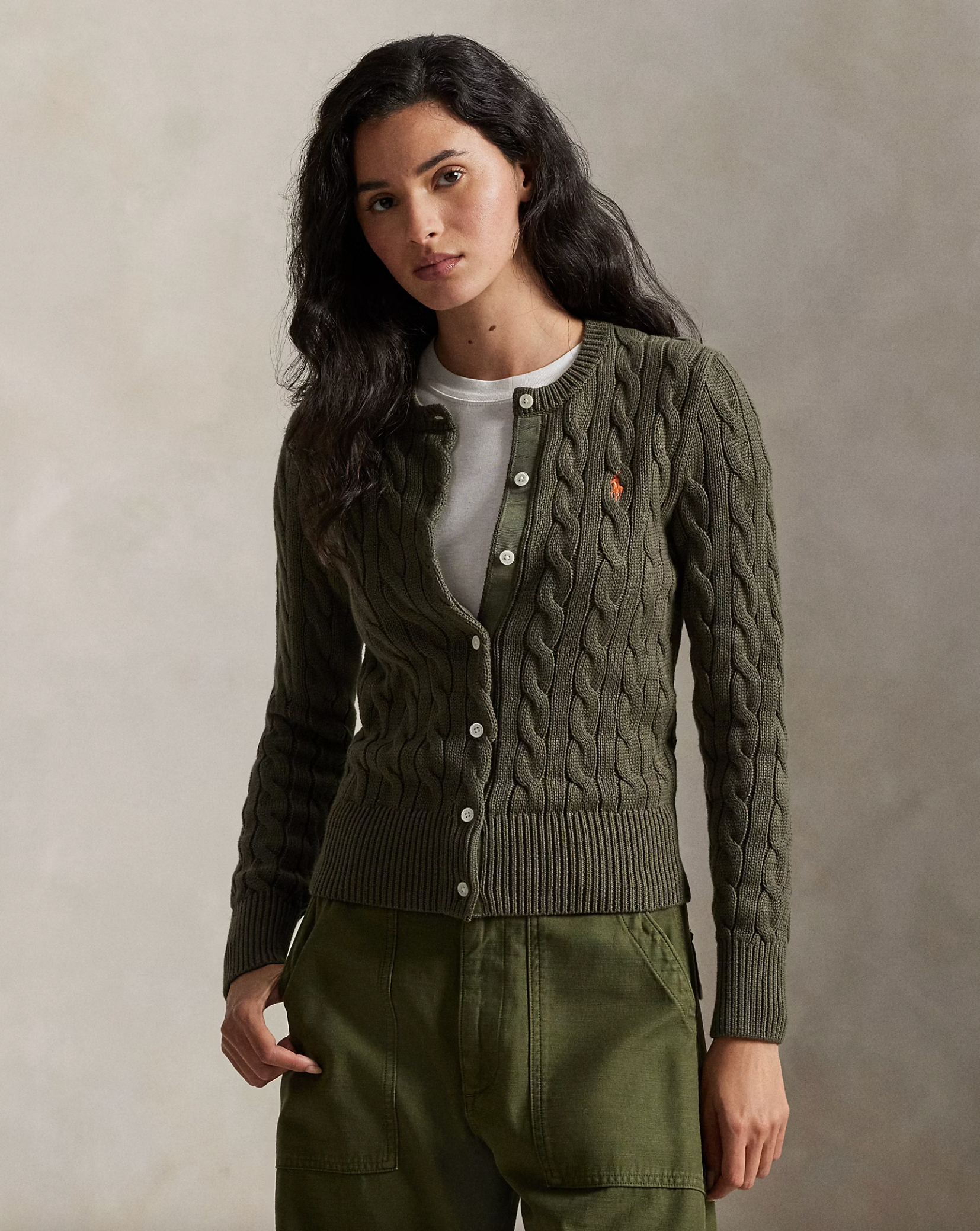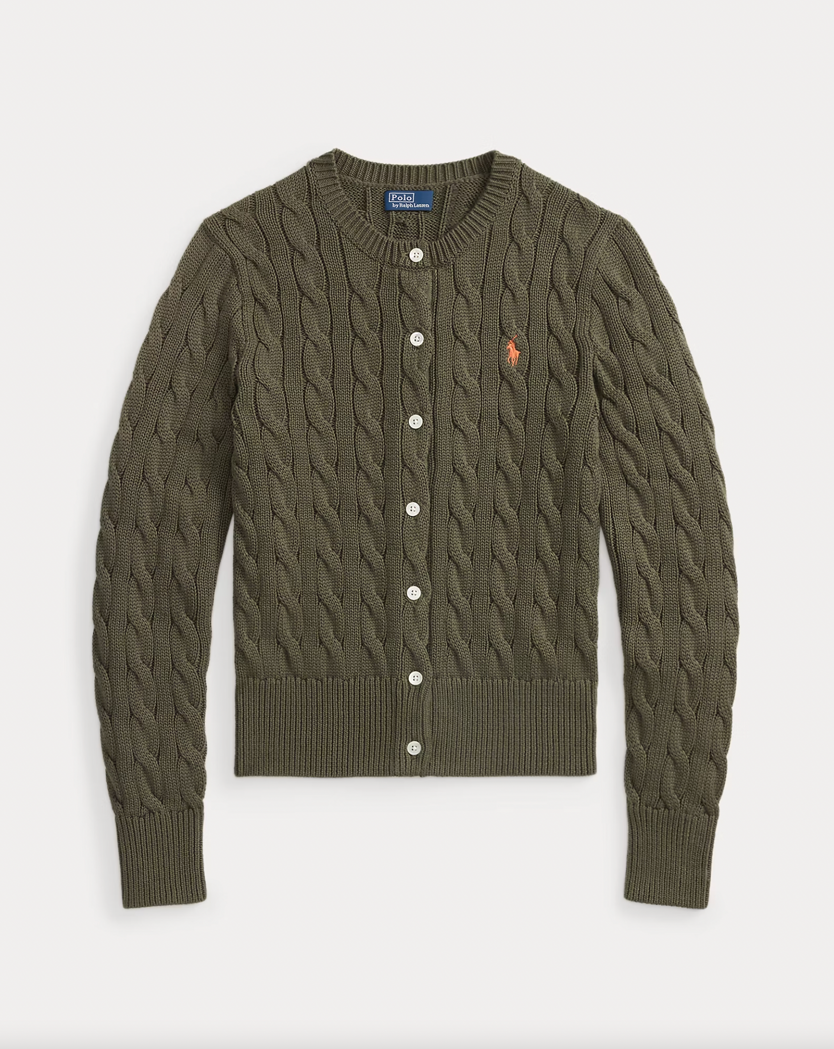 Cable-knit with soft, combed cotton, this buttoned crewneck cardigan is accented with our signature embroidered Pony at the chest.