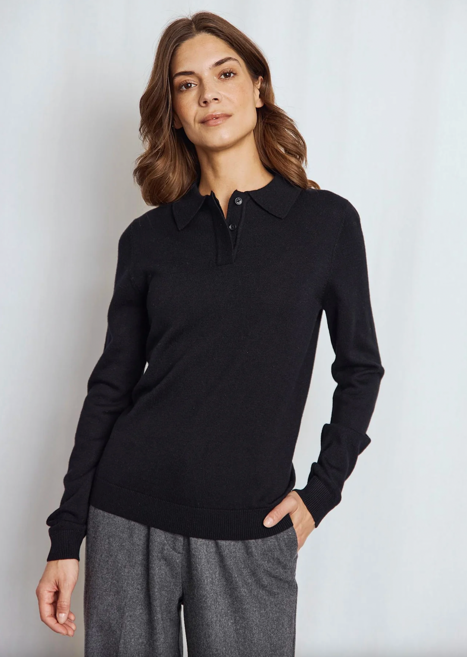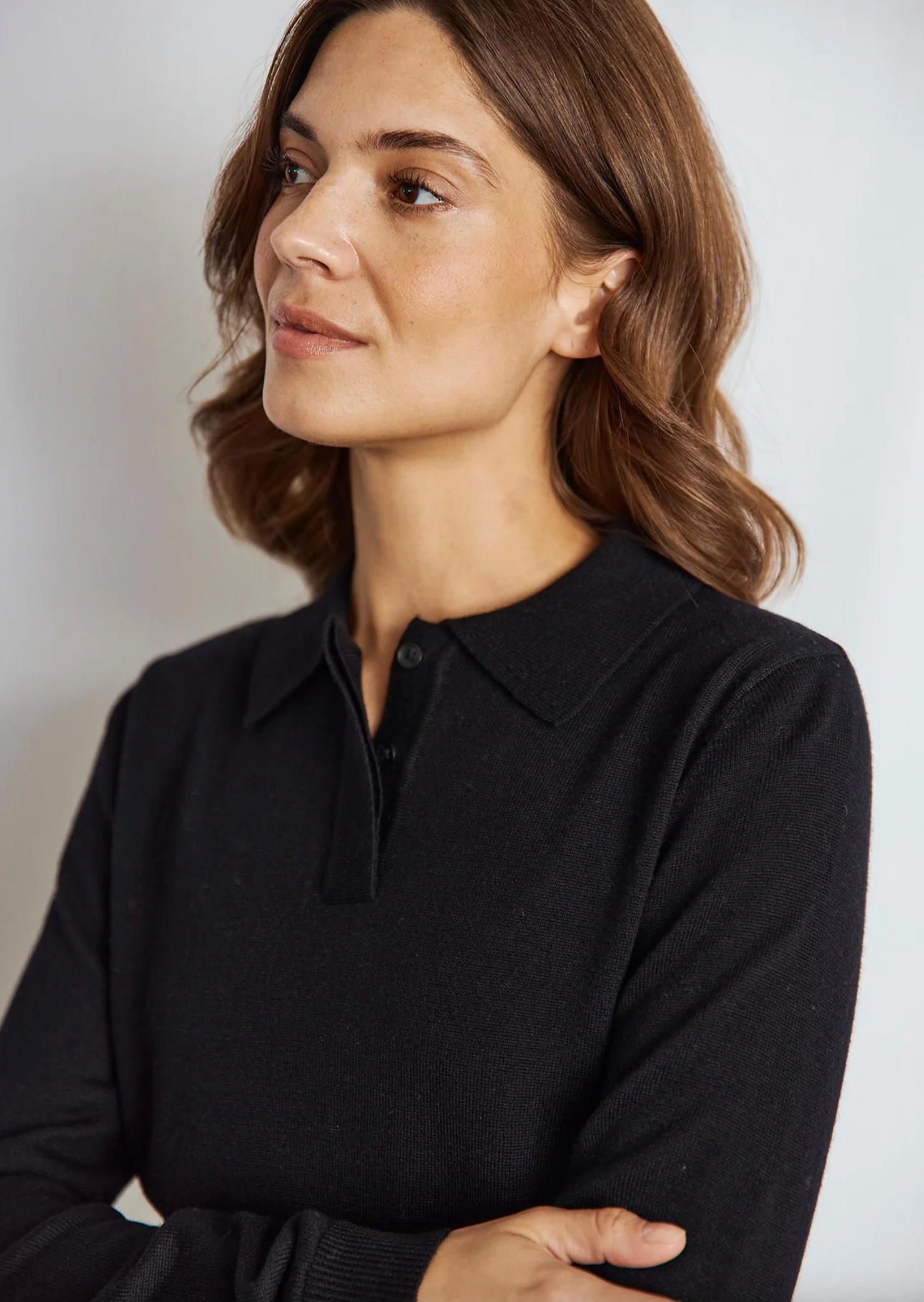 Finely knitted polo shirt in extra fine merino wool and tencel. Classic collar and placket with hidden tone-on-tone buttons give an elegant and clean expression. A feminine and modern version of a wardrobe classic.