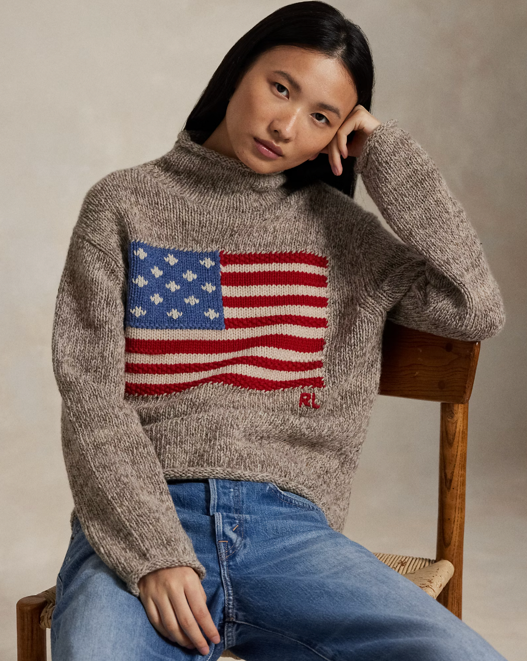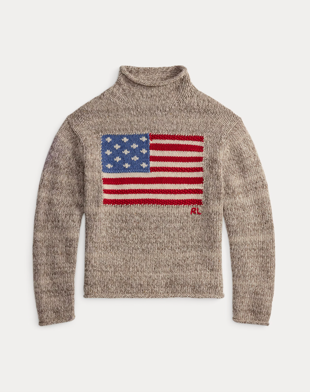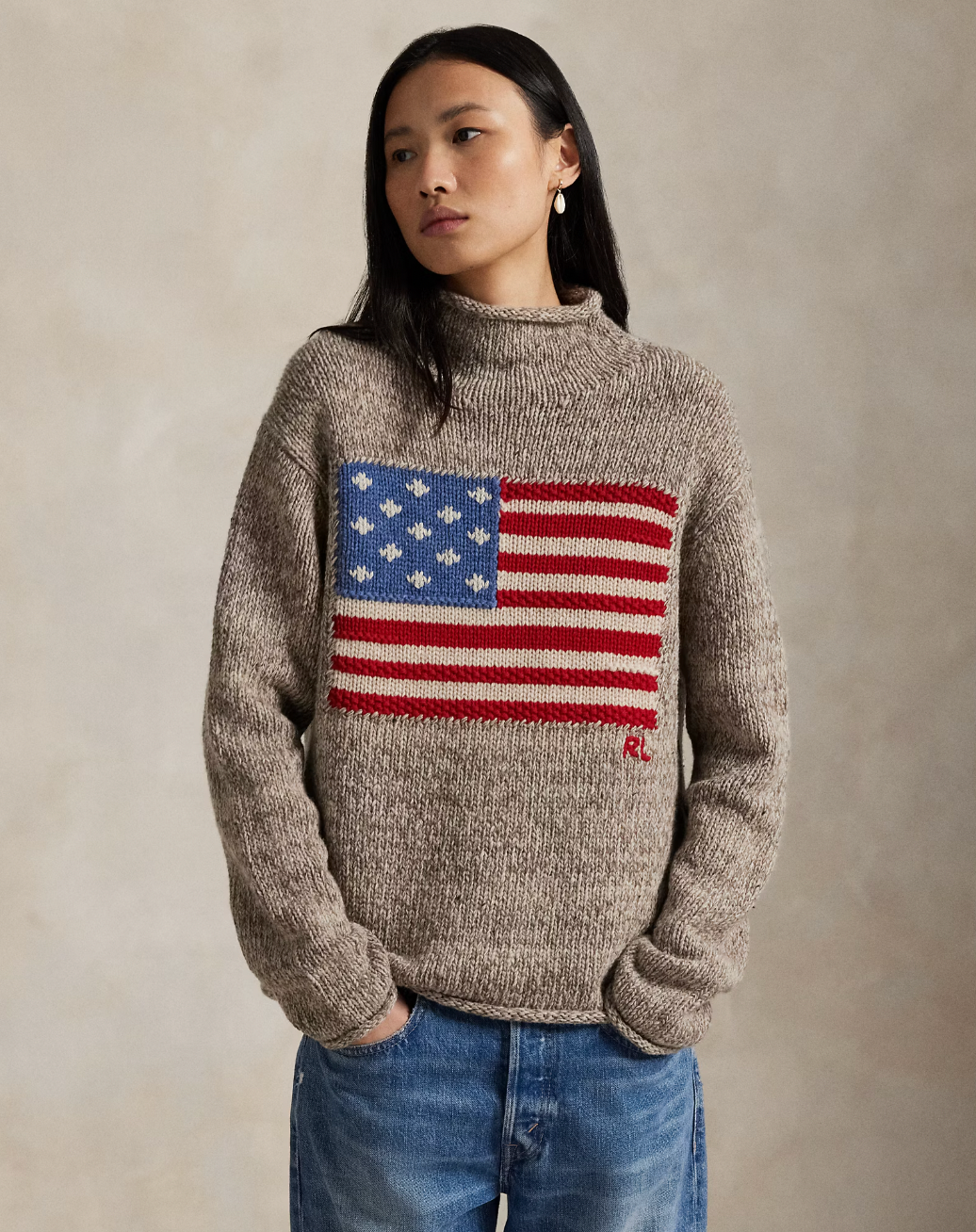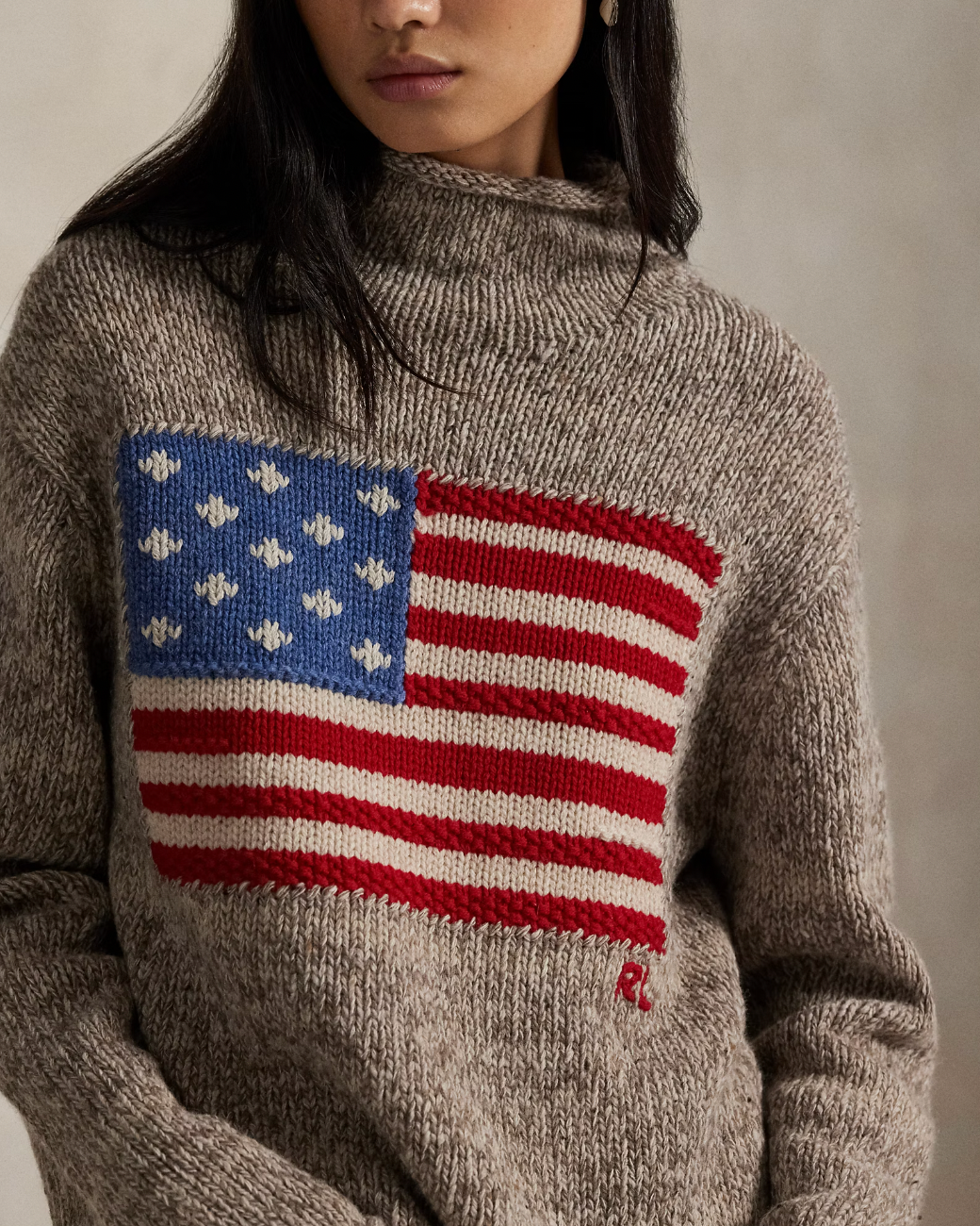 Historical American flag with whipstitching, hand-embroidered stars and "RL" knit on the front.
