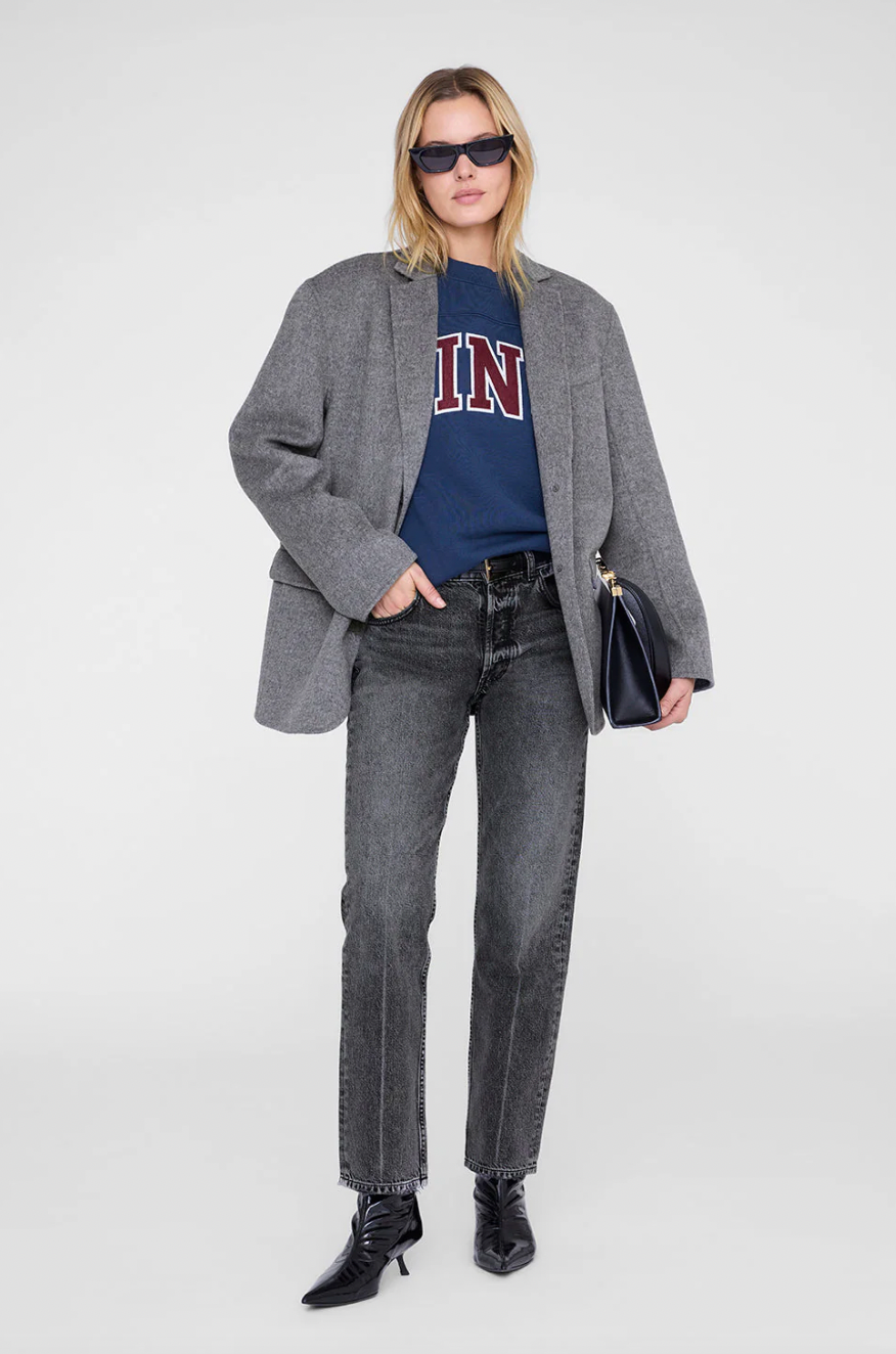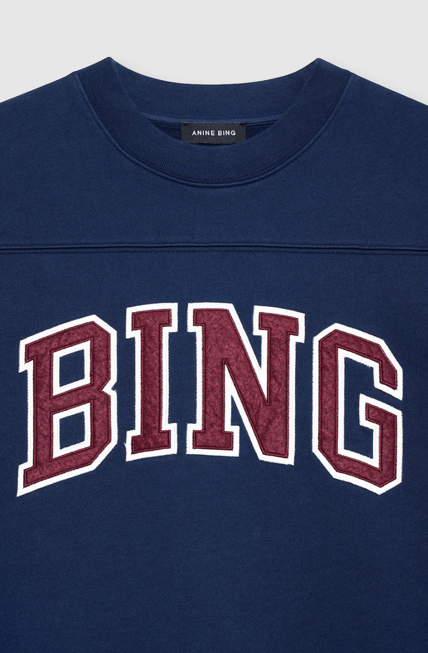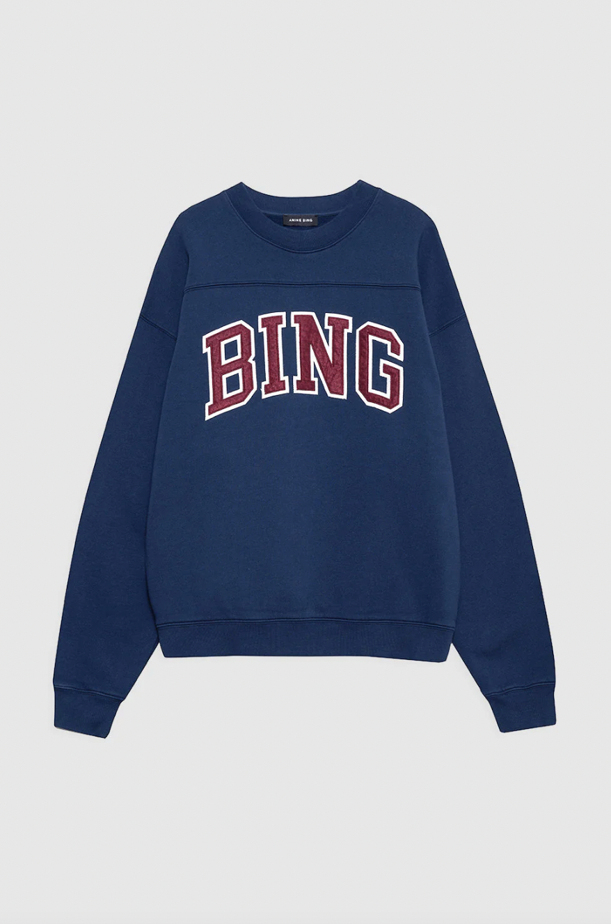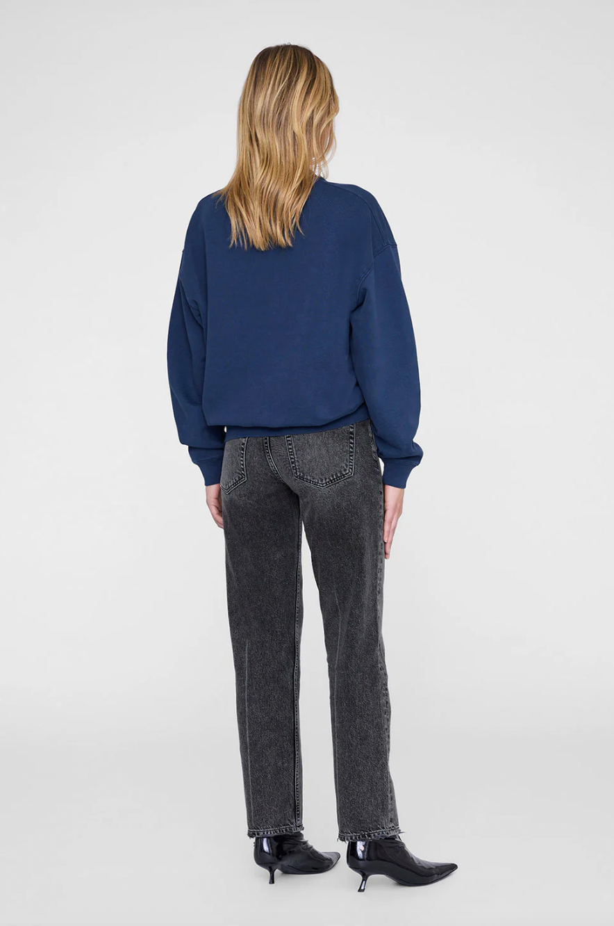 An oversized collegiate crewneck pullover made from midweight 100% cotton fleece in washed navy that's brushed on the inside.