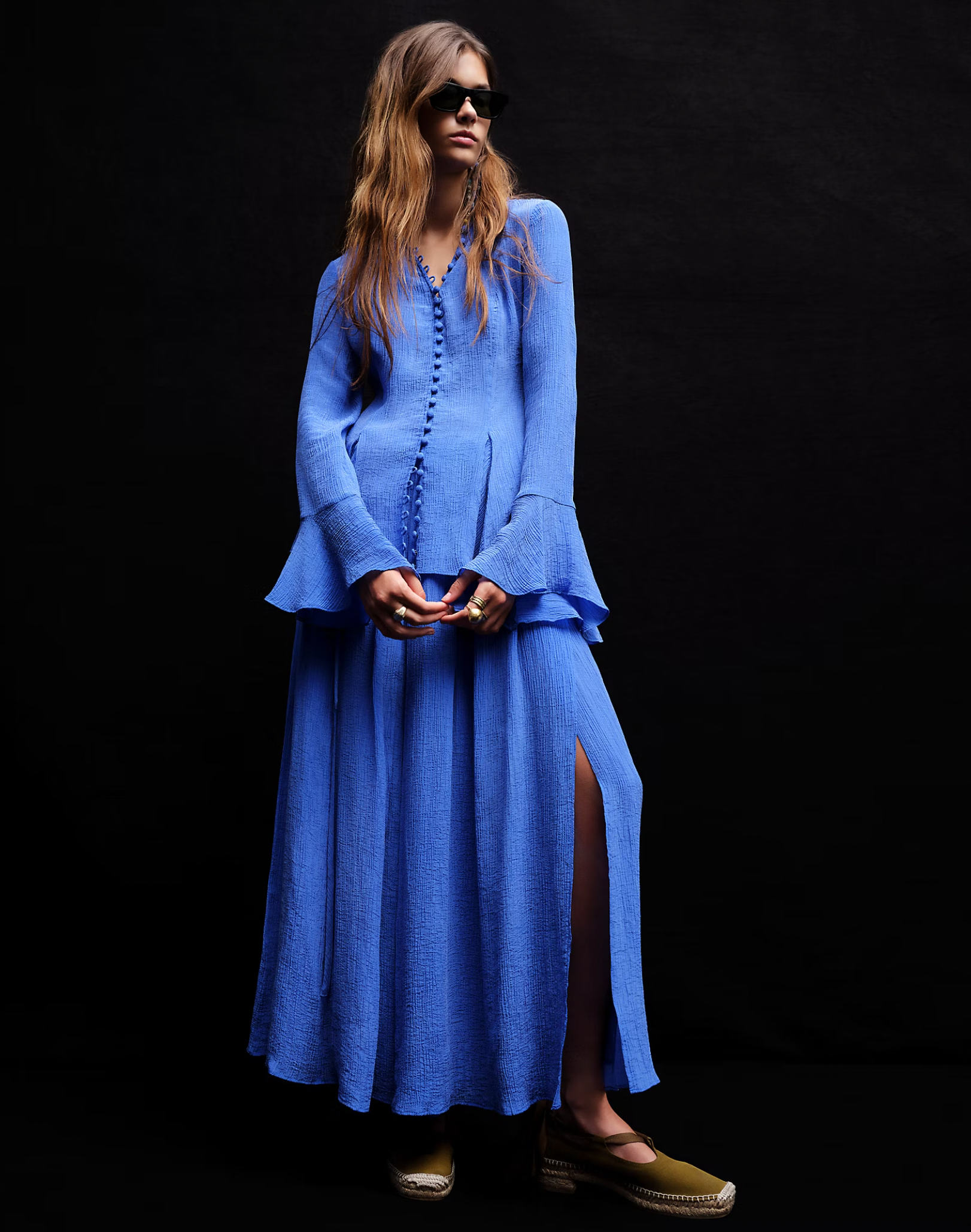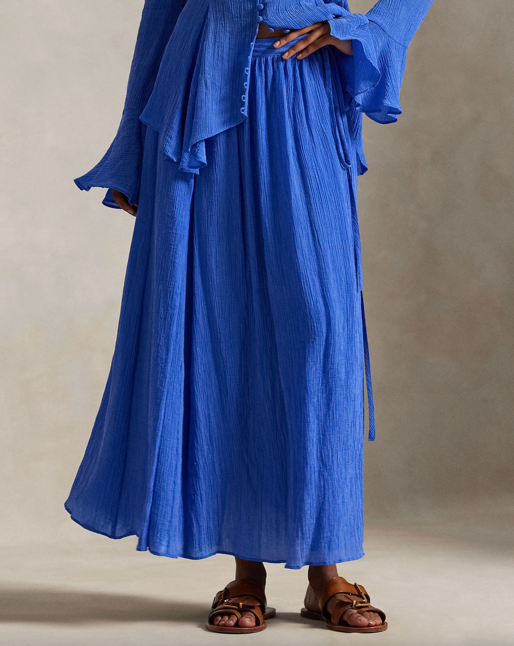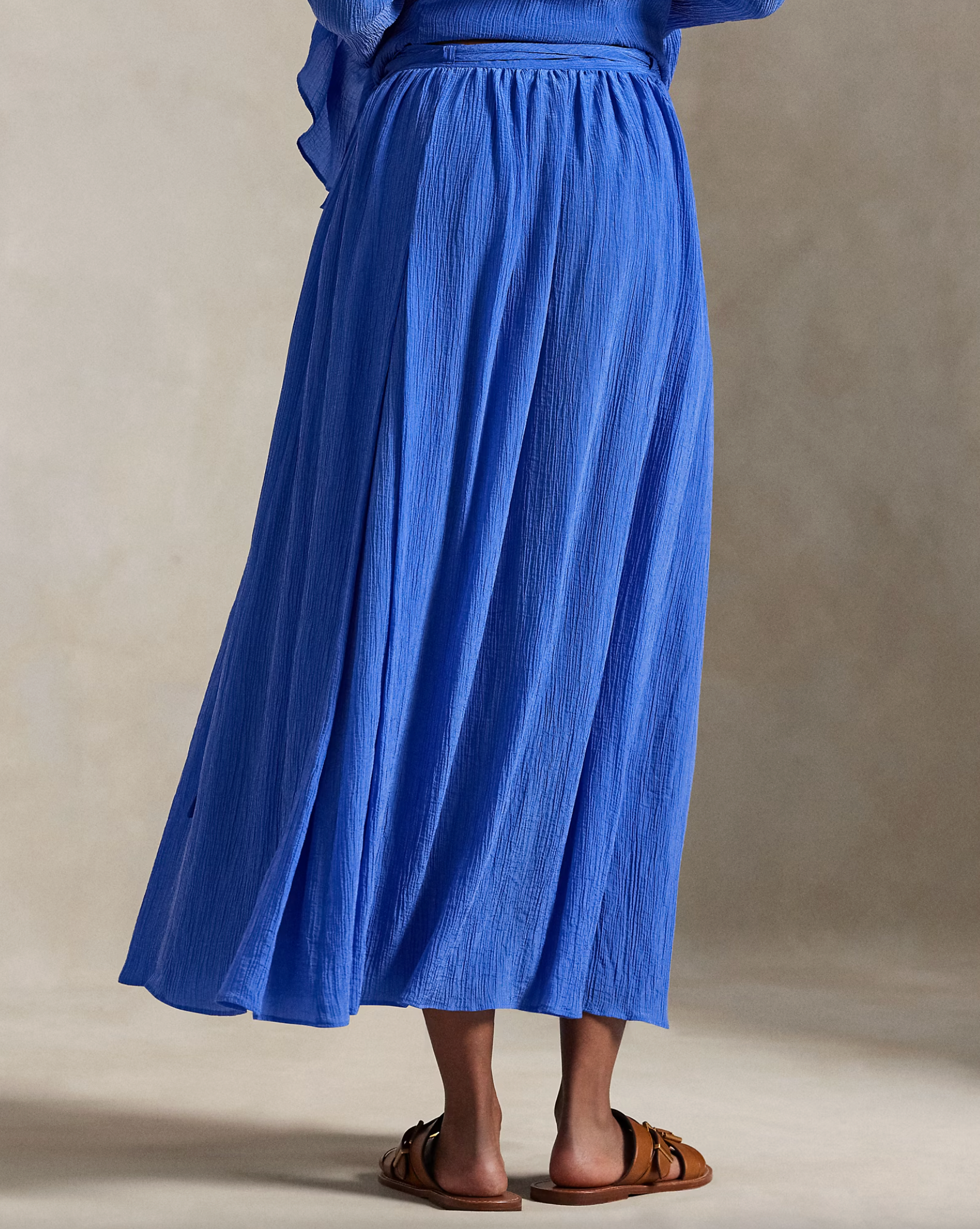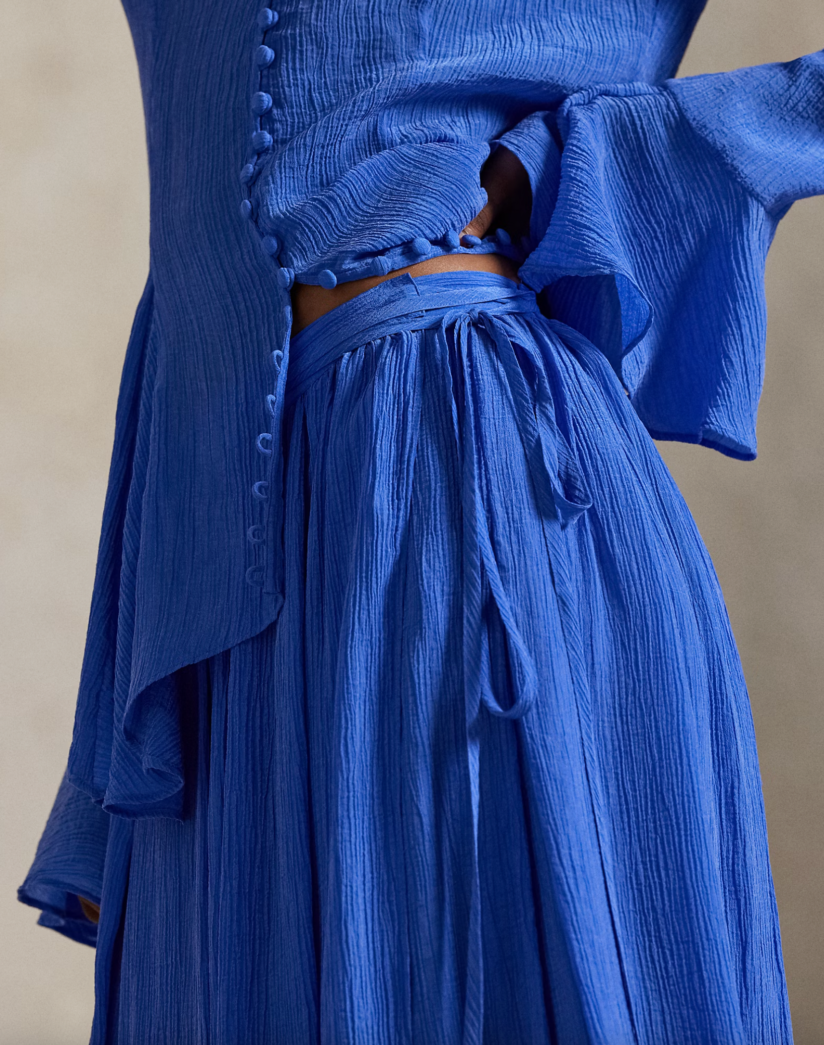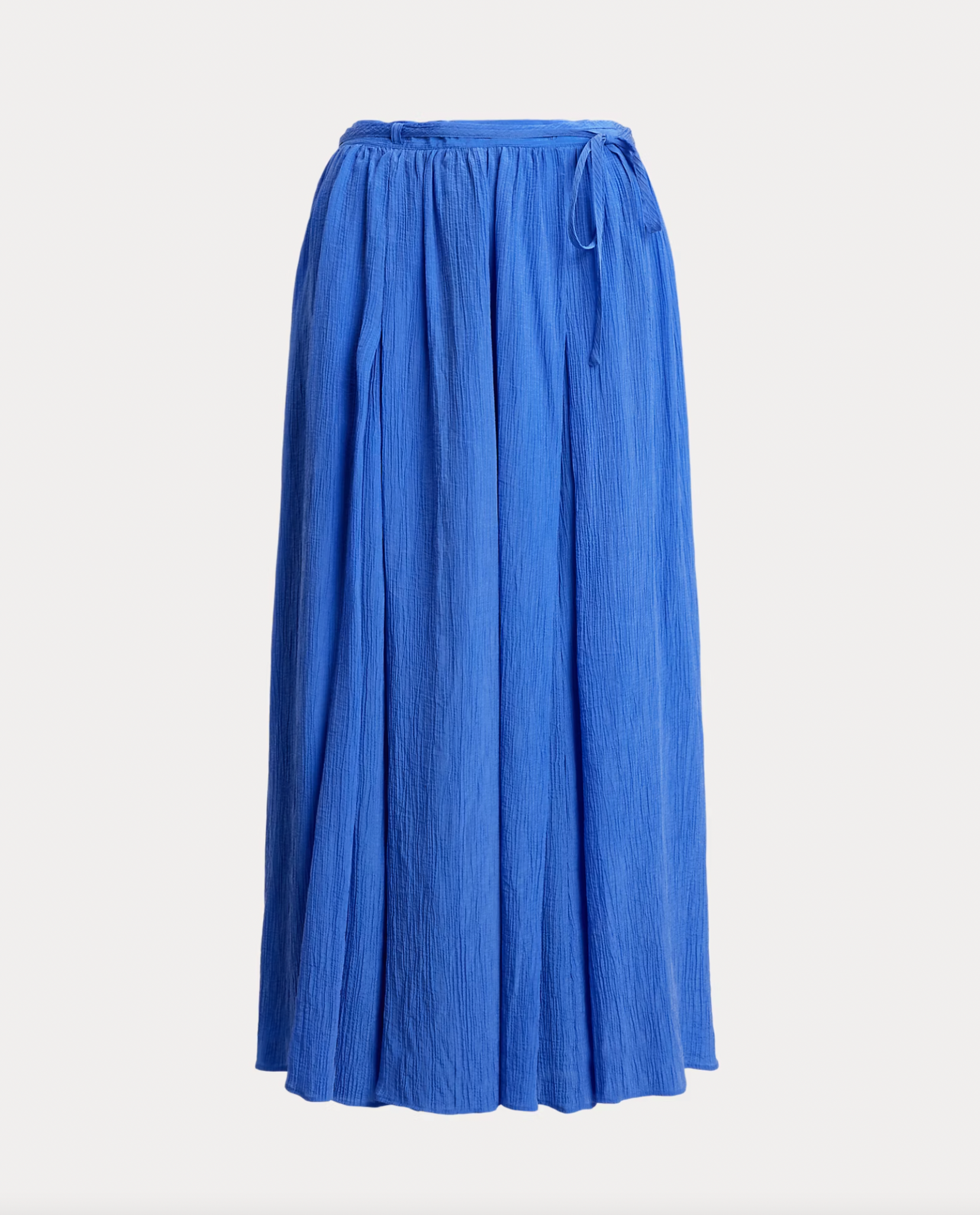 With an airy drape and pleated, crinkled texture, this wrap skirt channels a romantic, traveller’s spirit. The flowing A-line shape is accentuated by elongated self-fabric ties, designed to encircle the waist multiple times.
