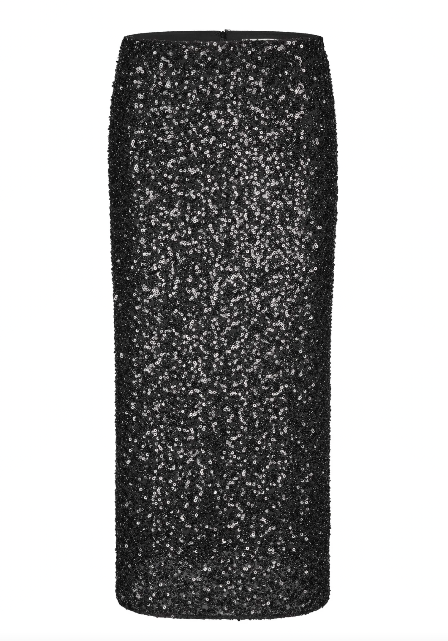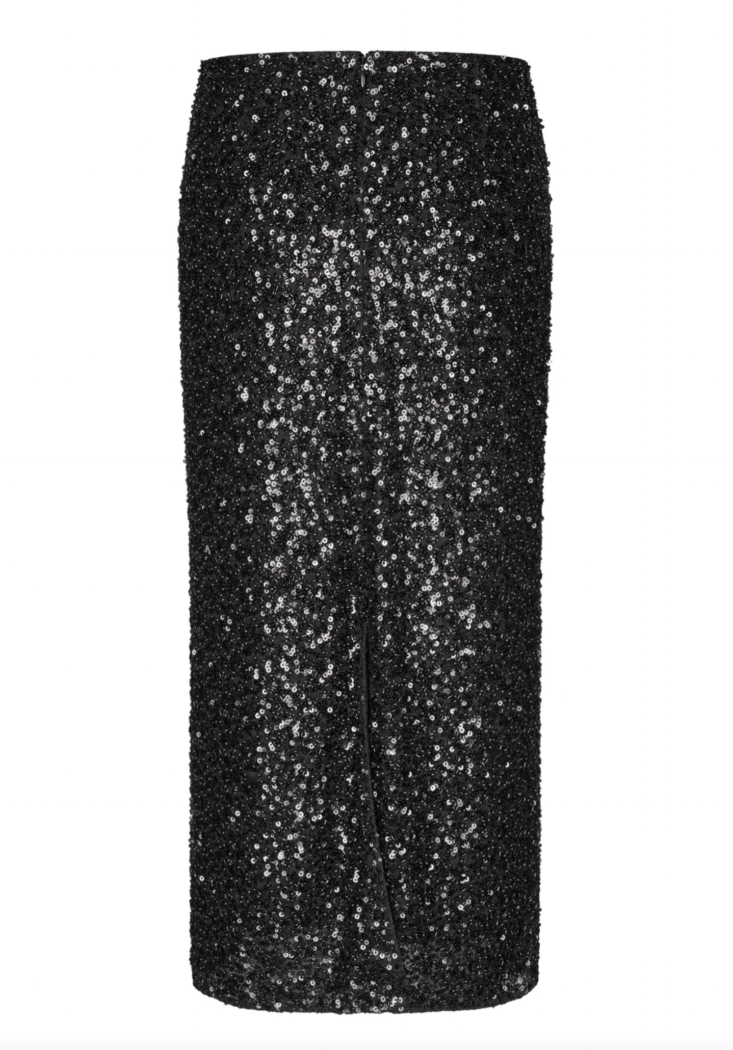 A perfect example of understated luxury, this slim fit tube skirt is entirely encrusted in black sequins. Fastened at the back with an invisible zip, it can be worn with a knit or simple shirt or t-shirt or perhaps, for more high octane glamour, with the matching Anine top.