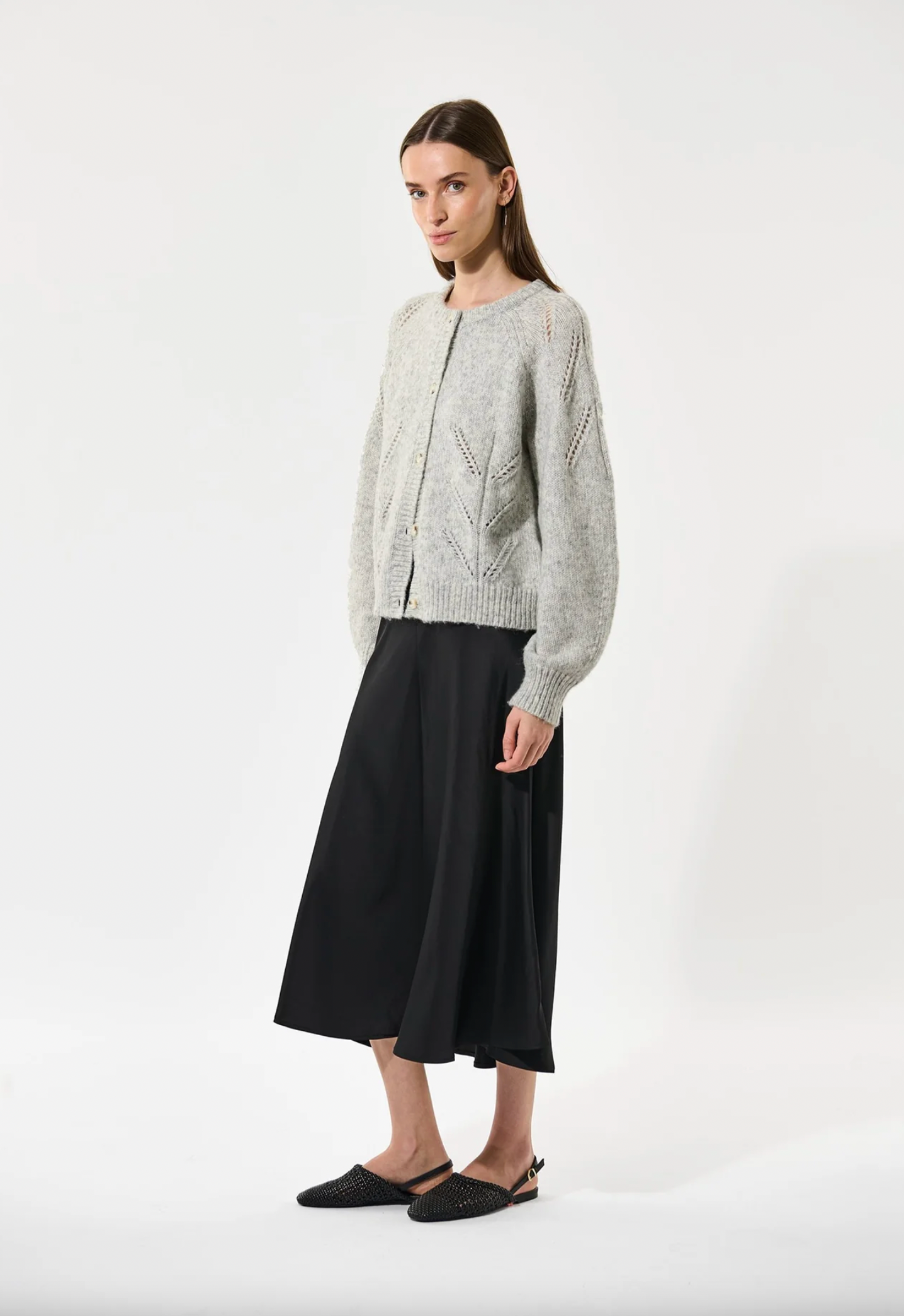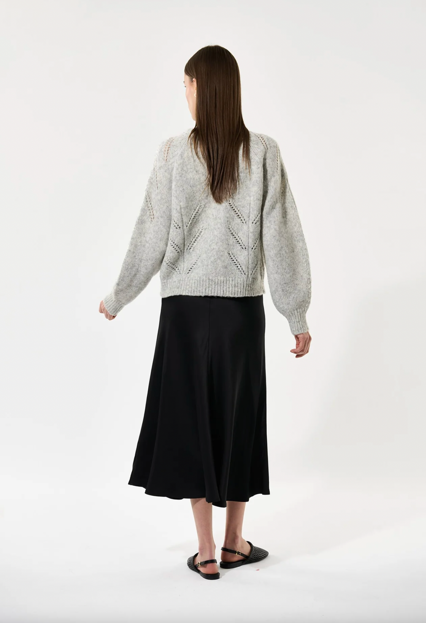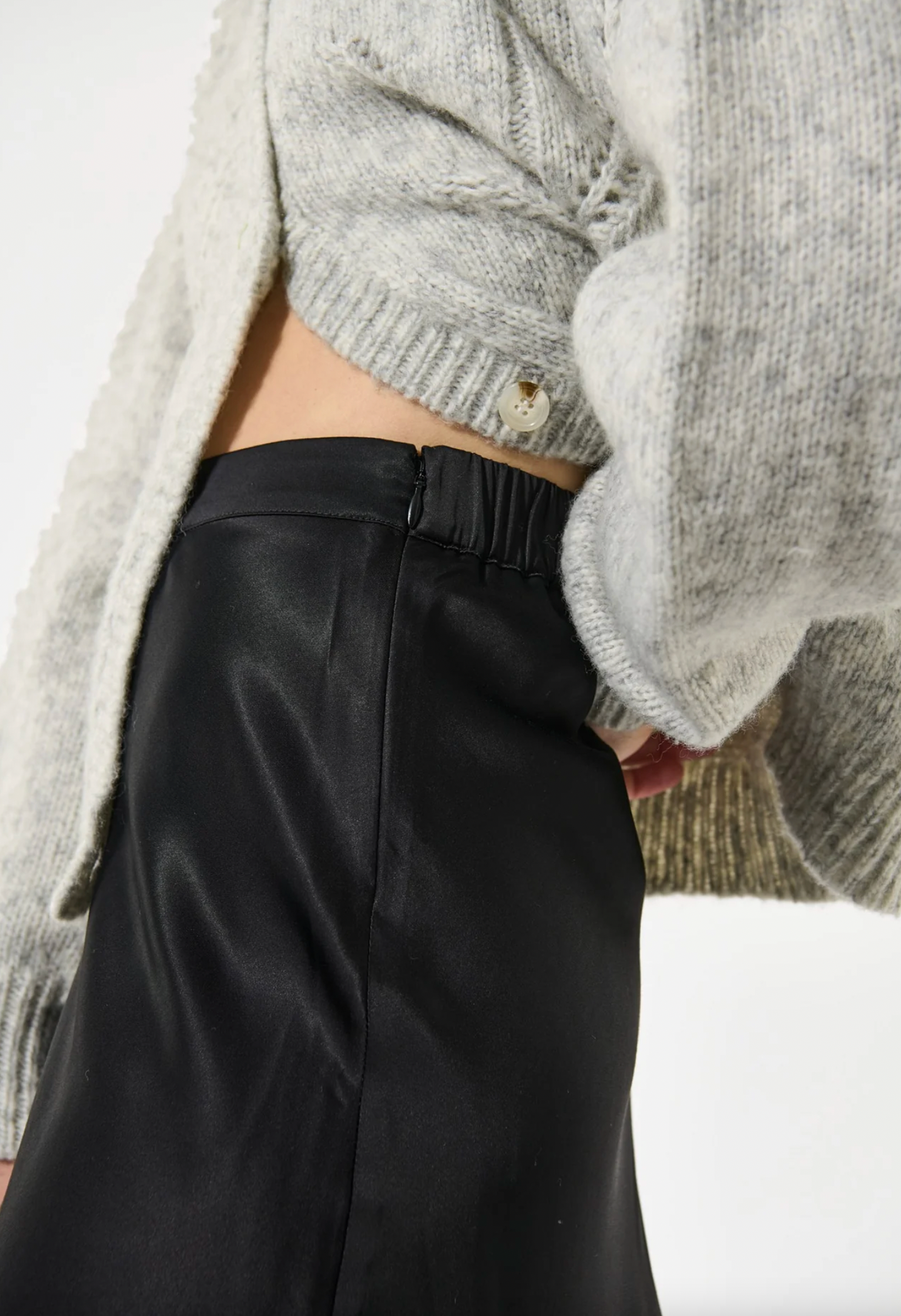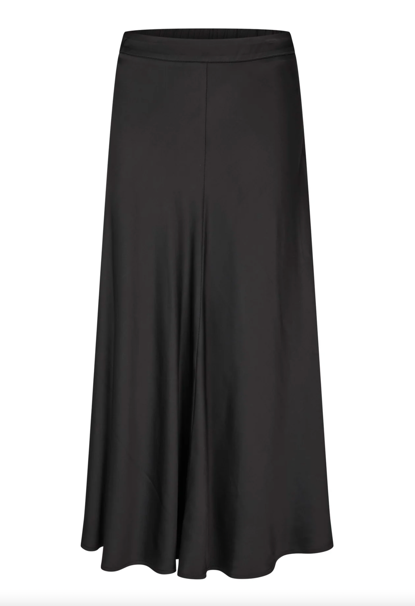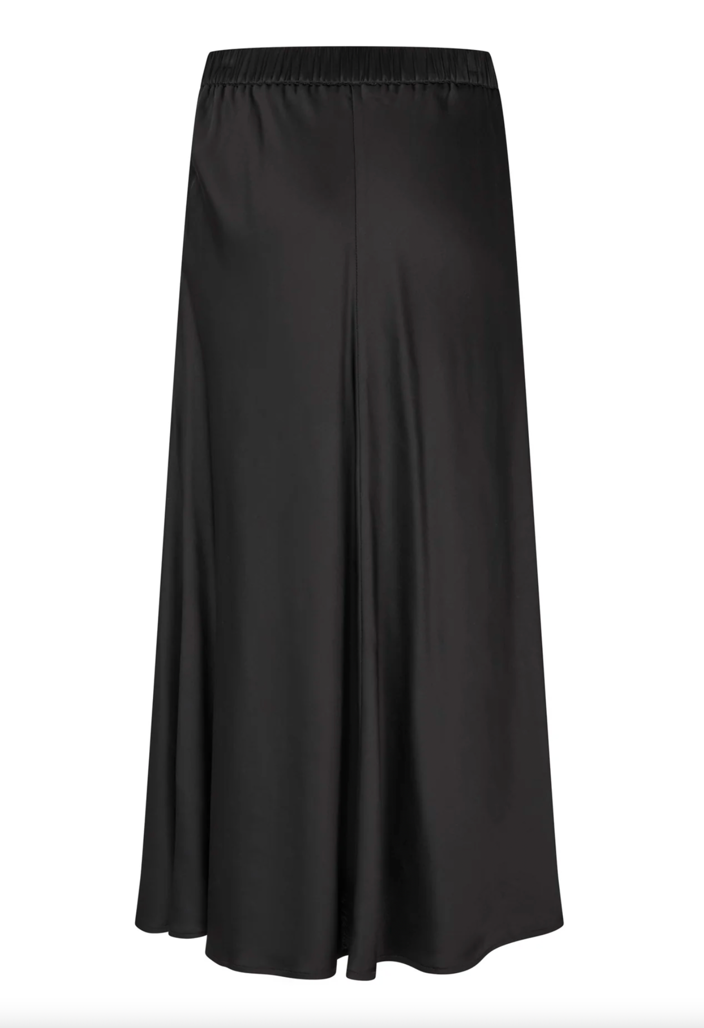 A bias cut skirt is a versatile and stylish wardrobe staple for any woman. This version in black stretch viscose satin skims the hips before falling to mid calf and has a waistband that is elasticated at the back.