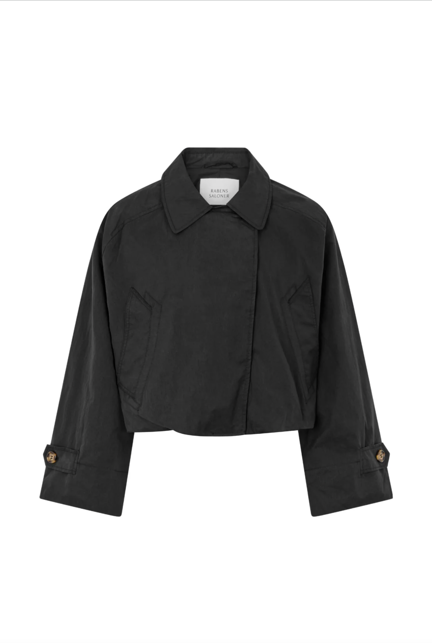 The jacket features a short, relaxed silhouette with long sleeves that have a slight flare and can be buttoned in, a diagonal front closure, front pockets, a classic collar, and a beautiful back detail that gives the design an edge.