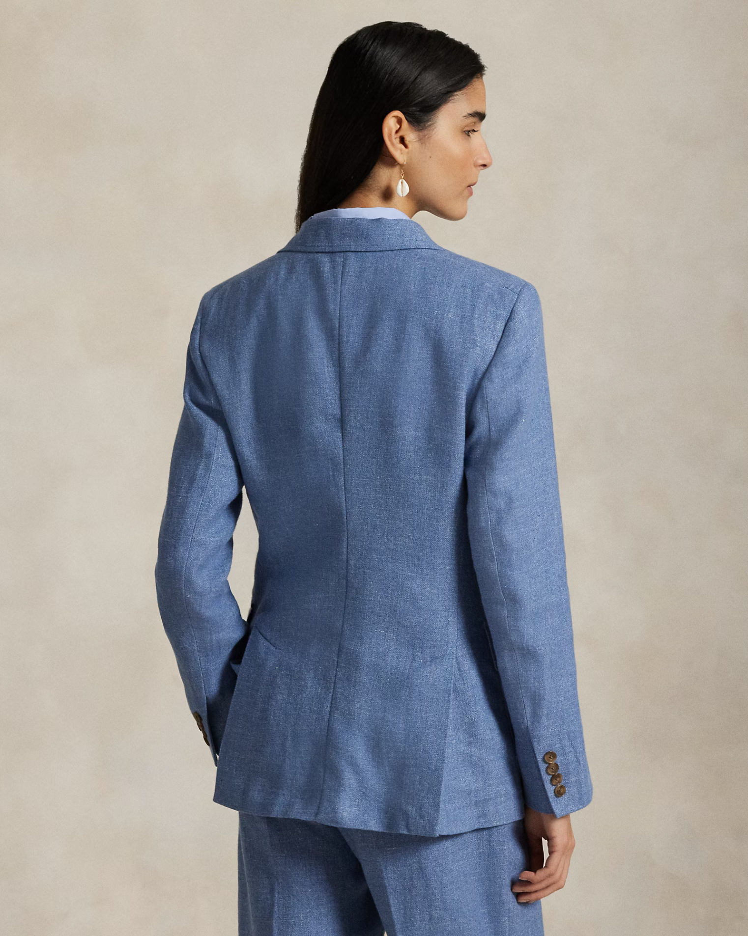 Woven with a blend of Italian linen and cotton yarns, this medium-weight blazer unites a slim fit with menswear-inspired details, including notch lapels, buttoned cuffs and tailored waist darts.