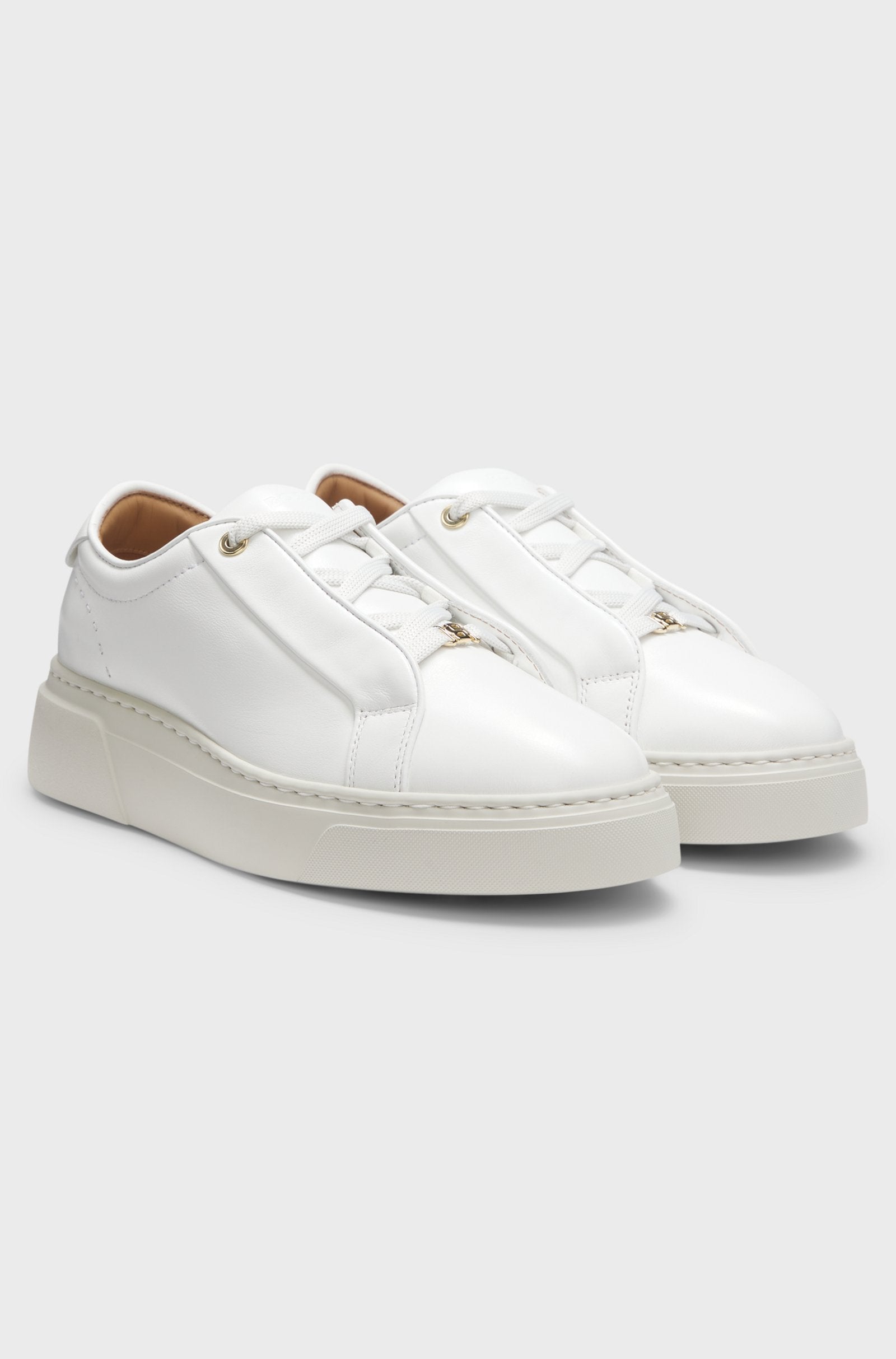 Give your look a little boost with the lightweight outsole and hidden wedge of these Italian-crafted BOSS Womenswear trainers. Smooth leather uppers. This product contains at least 60% better raw materials. We continuously look for more responsible ways to produce and finish our products. A minimum of 60% of the leather used to make this product has been sourced from certified tanneries.