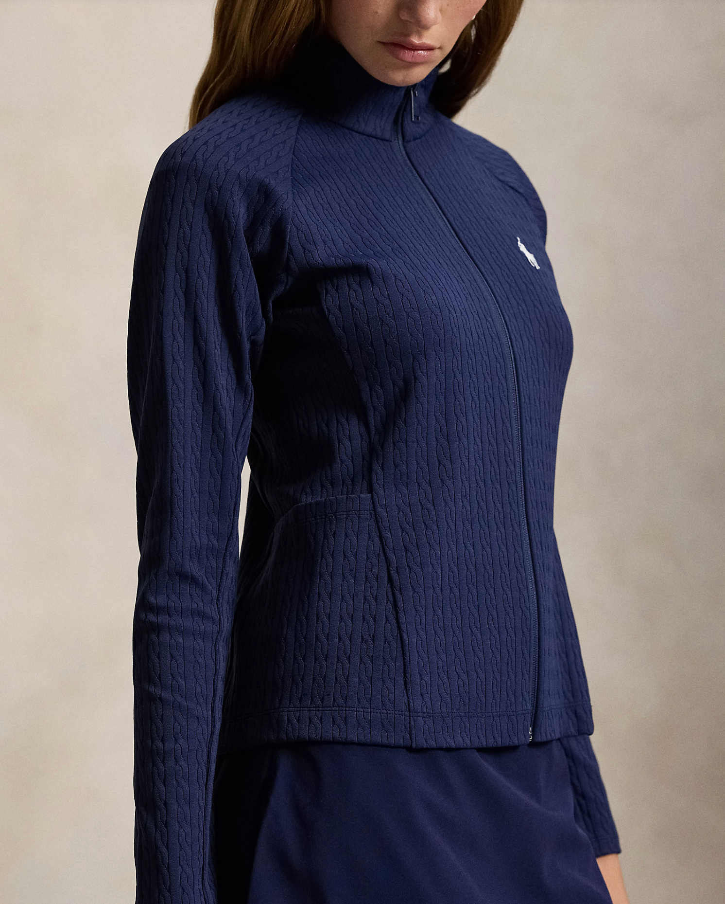 Designed with stretch for a slim fit, this double-knit jacquard layer features a cable motif and paneled construction with side-seam pockets. A two-way zip accents the front placket, while our signature Pony adorns the chest and silicone-printed "RLX" logo marks the back neck.