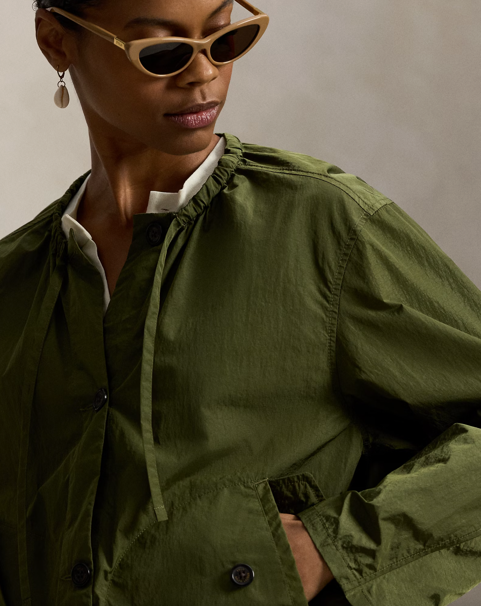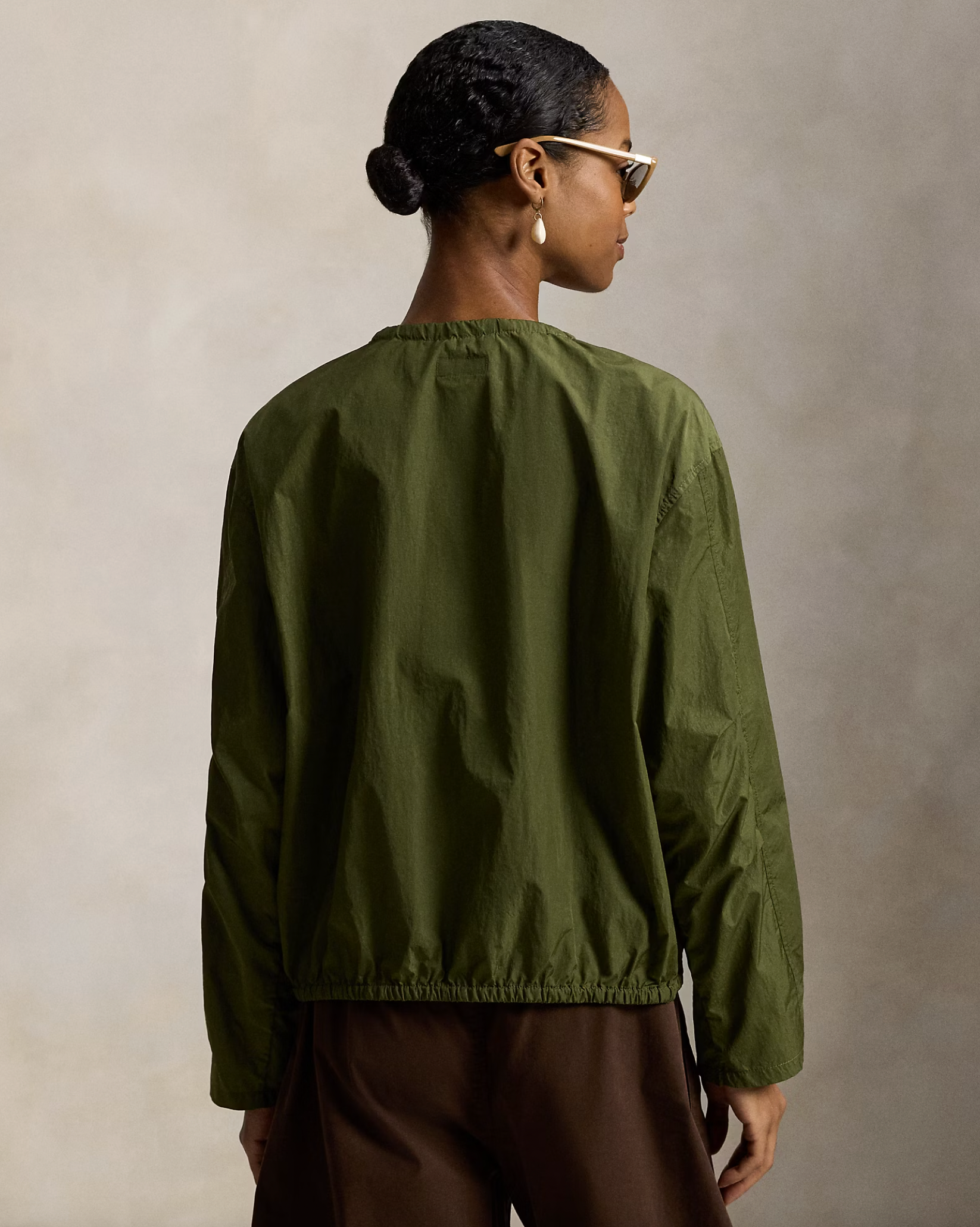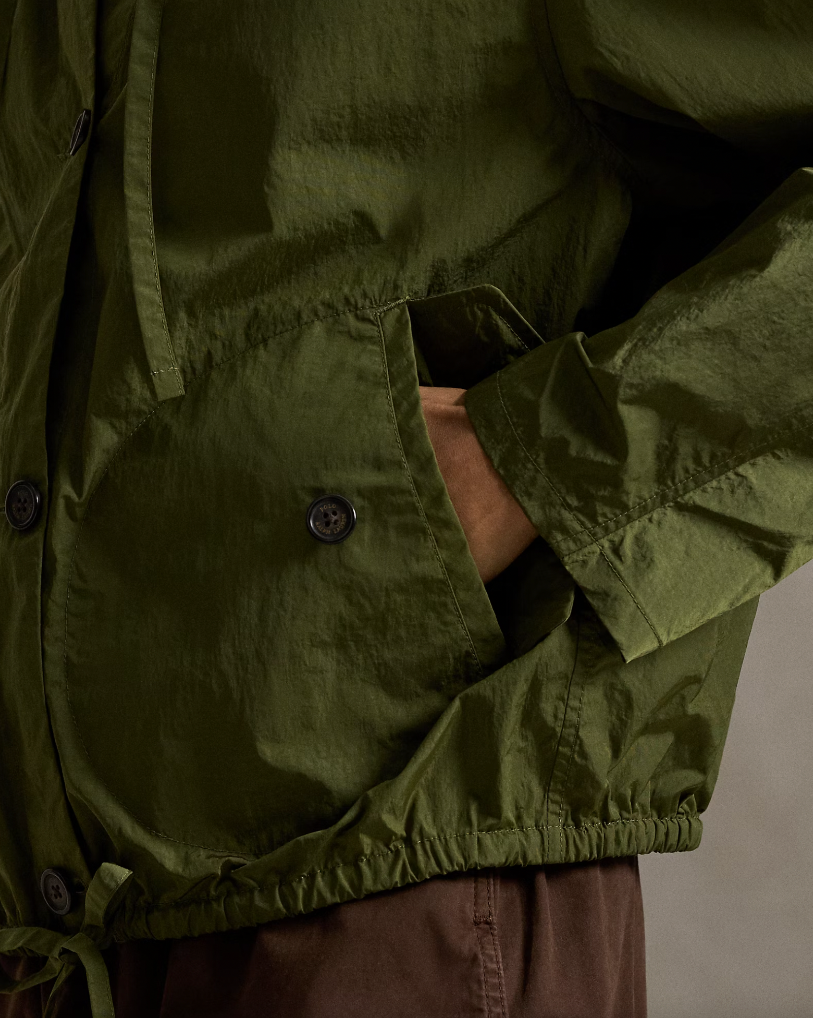 Crafted from water-resistant fabric, this windbreaker is designed with drawstrings on the neckline and hem to create a gathered effect.