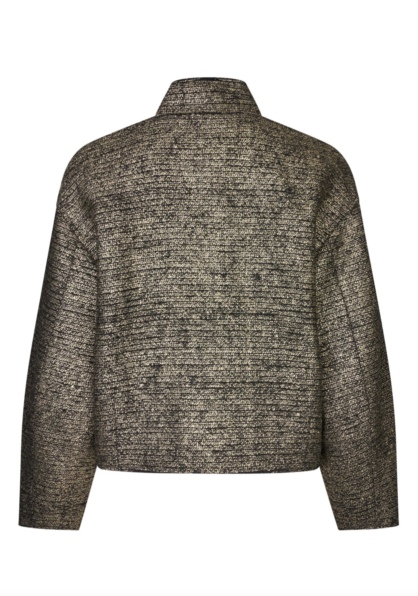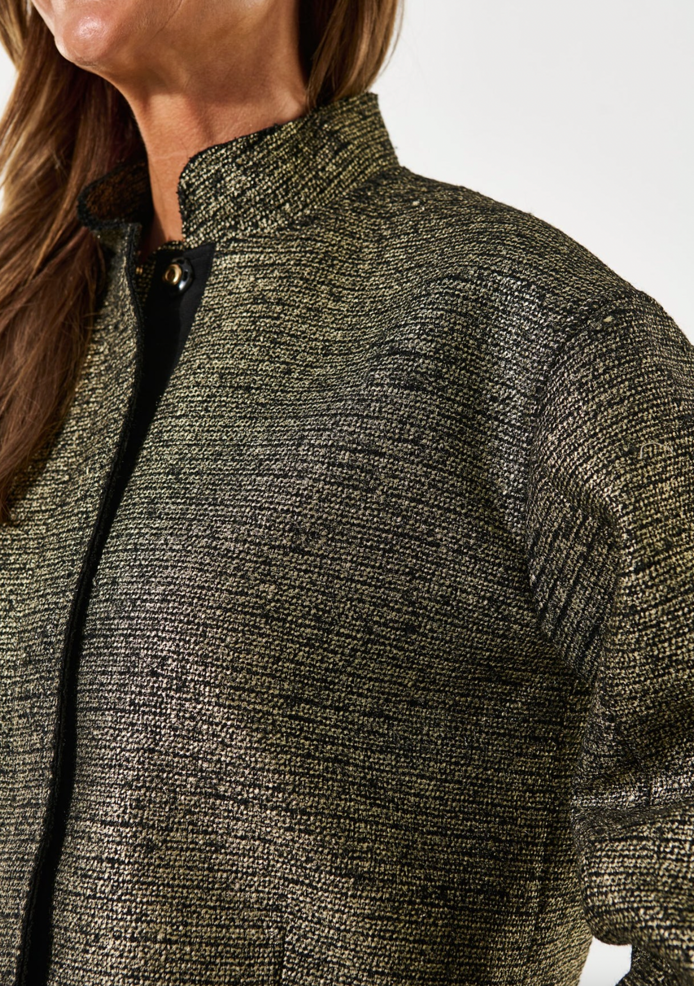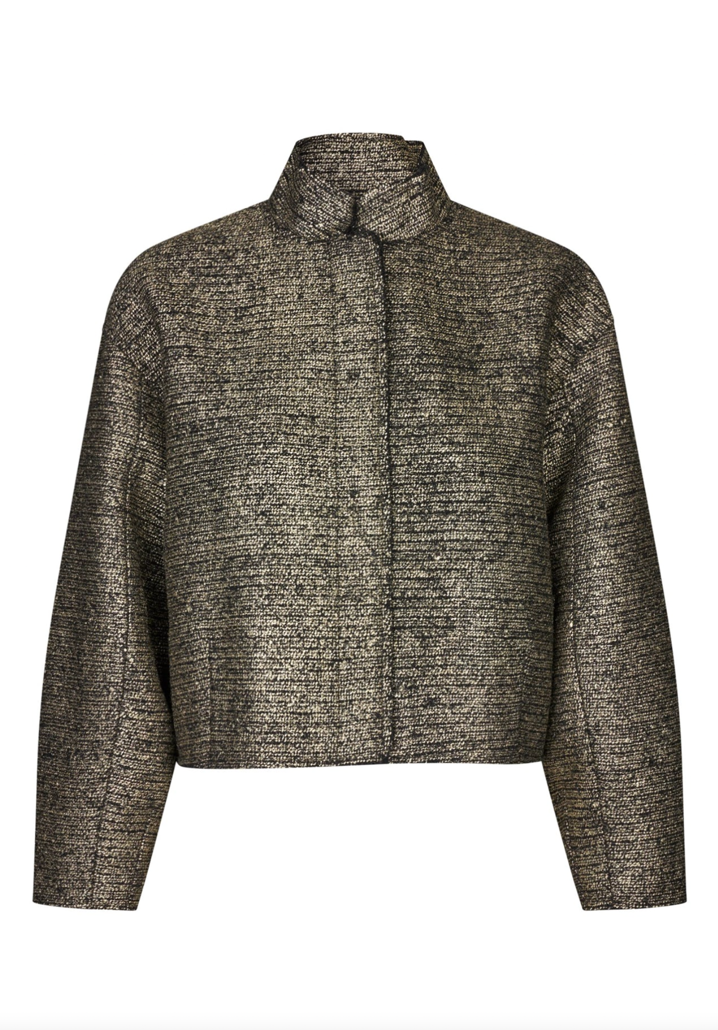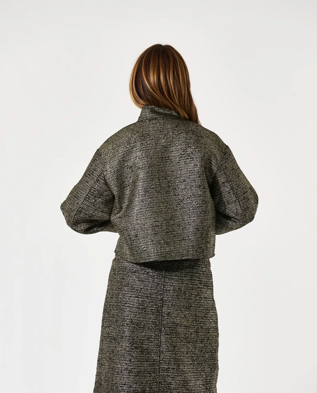 Minimal details on this beautiful jacket allow the stunning gold bouclé fabric make the real statement. Closed with a fly front and snap stud fastenings, the jacket has a stand collar, sculptural sleeves and is cropped to finish at the waist. To make a truly glamorous outfit, pair with matching Gigi skirt.