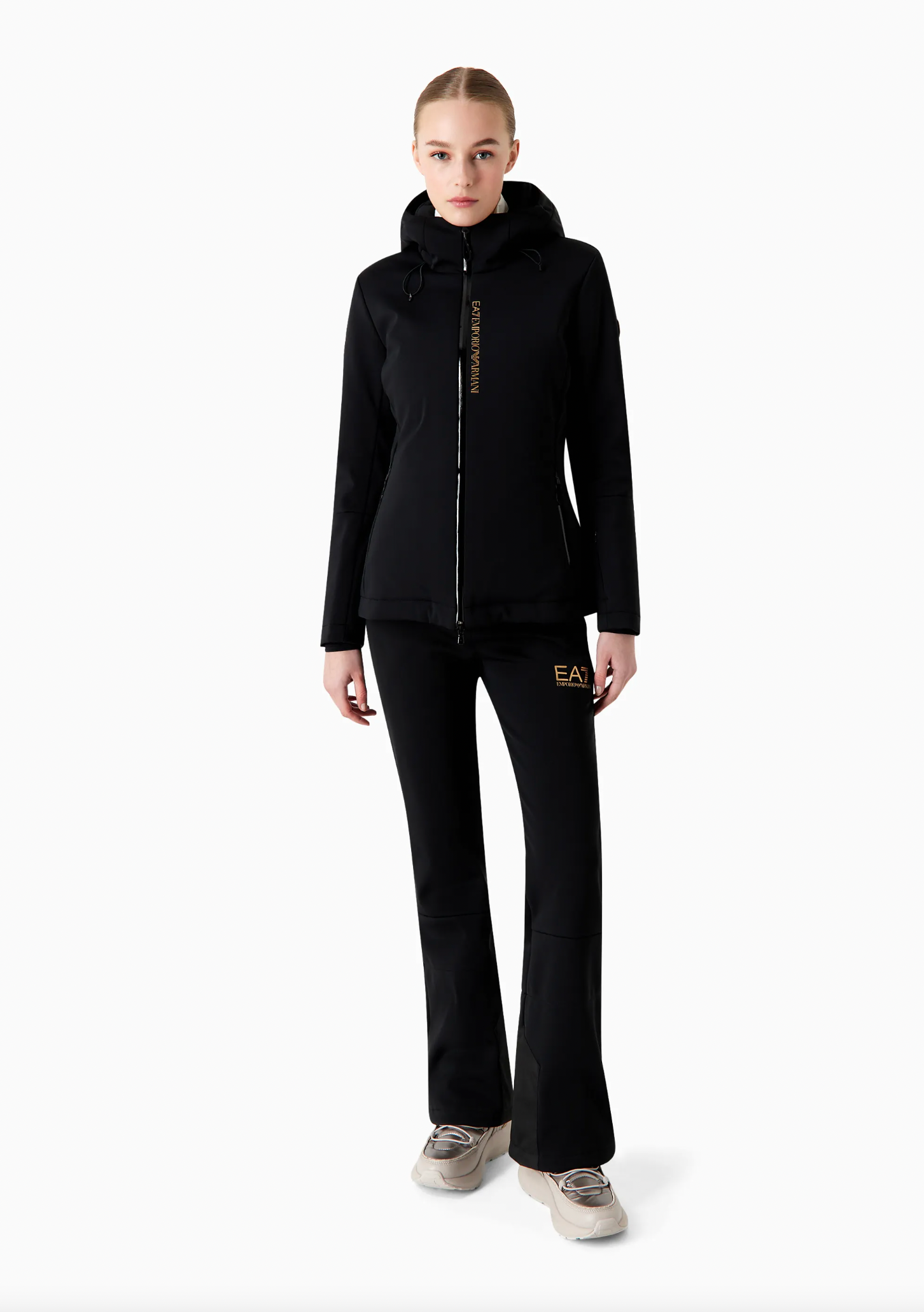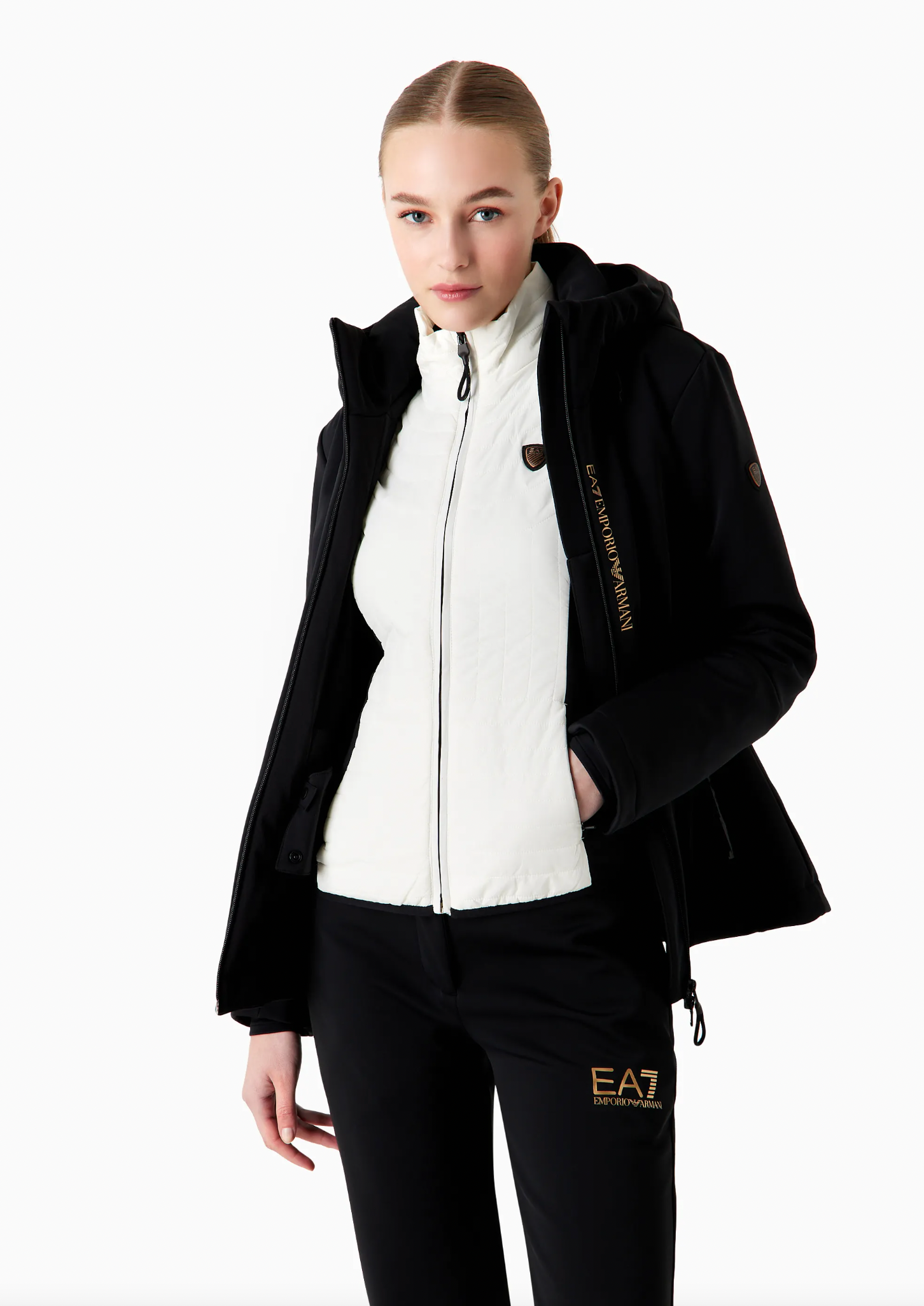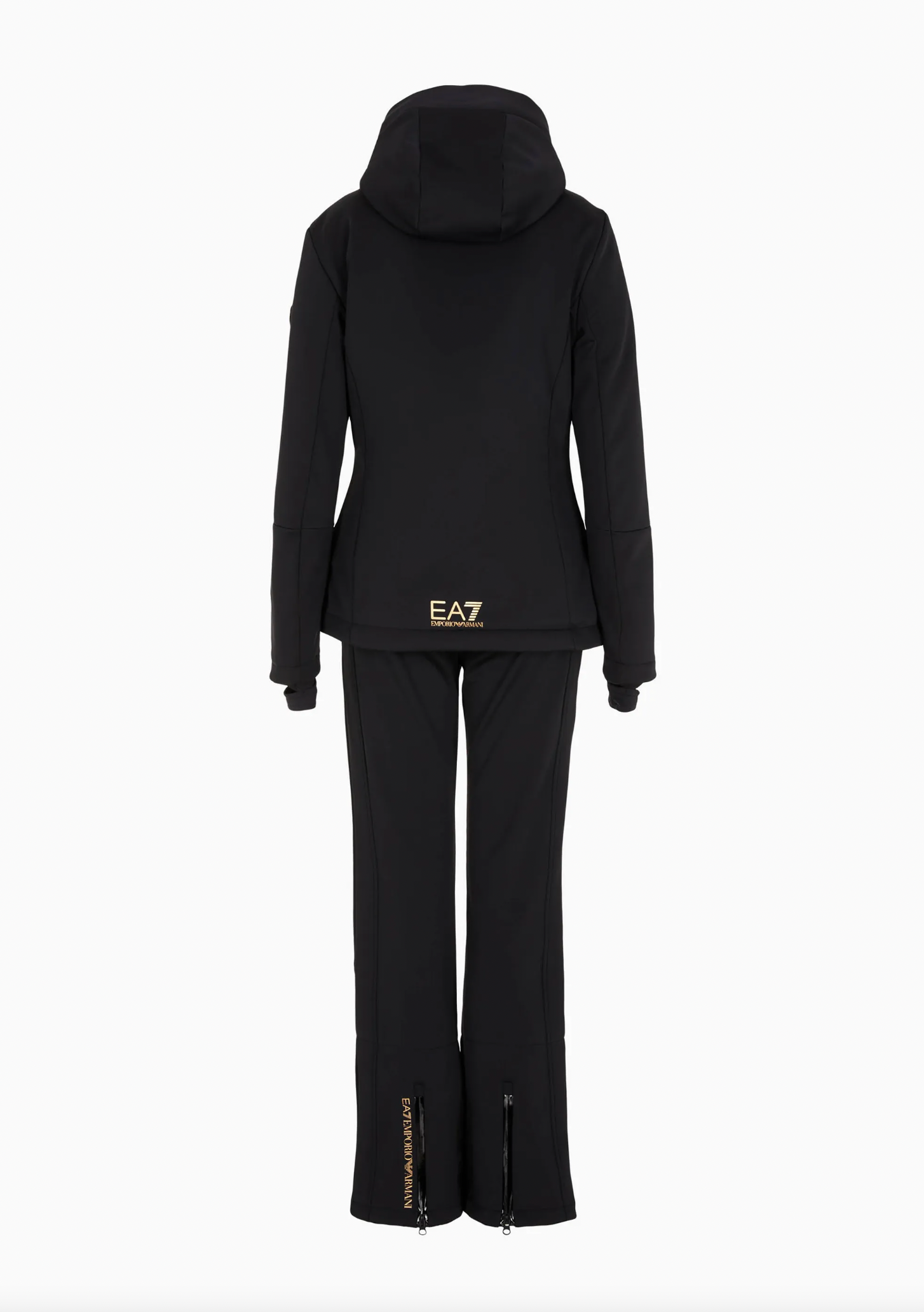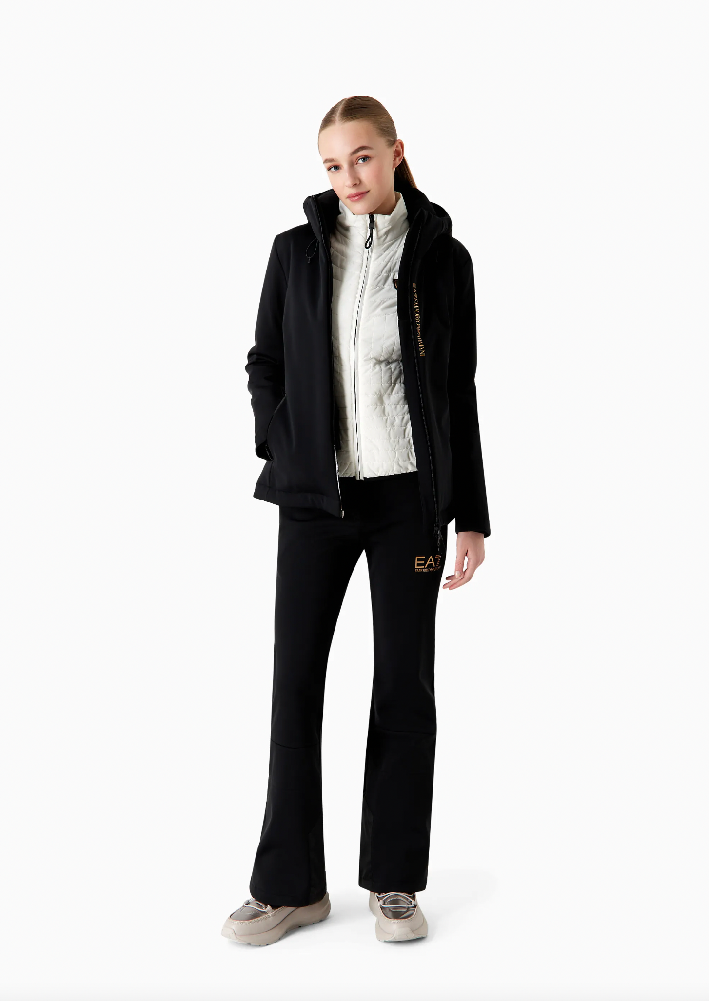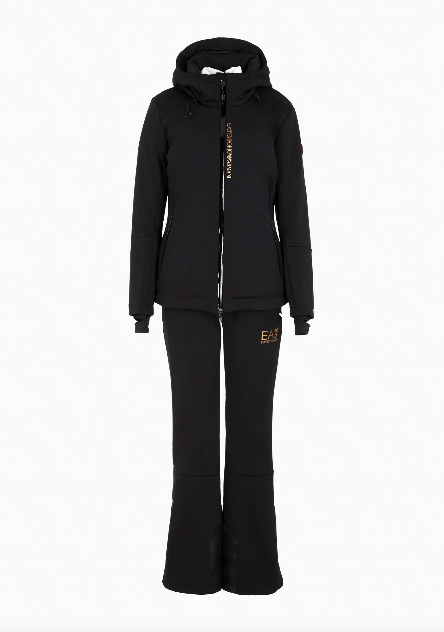 Technical padded women's ski suit, made of waterproof, water-repellent and breathable fabric. The set consists of a ski jacket with hood, zipped vest and trousers with internal gaiter and opening bottom. A perfect proposal for those who want a complete garment for enjoying the slopes and free time in the mountains, which combines style and functionality. The model features the innovative STRATUM7 RECYCLED padding in the jacket. A new technology consisting of a special microfibre, coming entirely from recycled plastic bottles. Its main feature is the excellent thermoregulation, created by pressing the microfibre to form a "heat shield" between the outside and the body; the external surface of the "shield" allows moisture to be removed from the body, guaranteeing maximum comfort for the entire duration of physical activity.