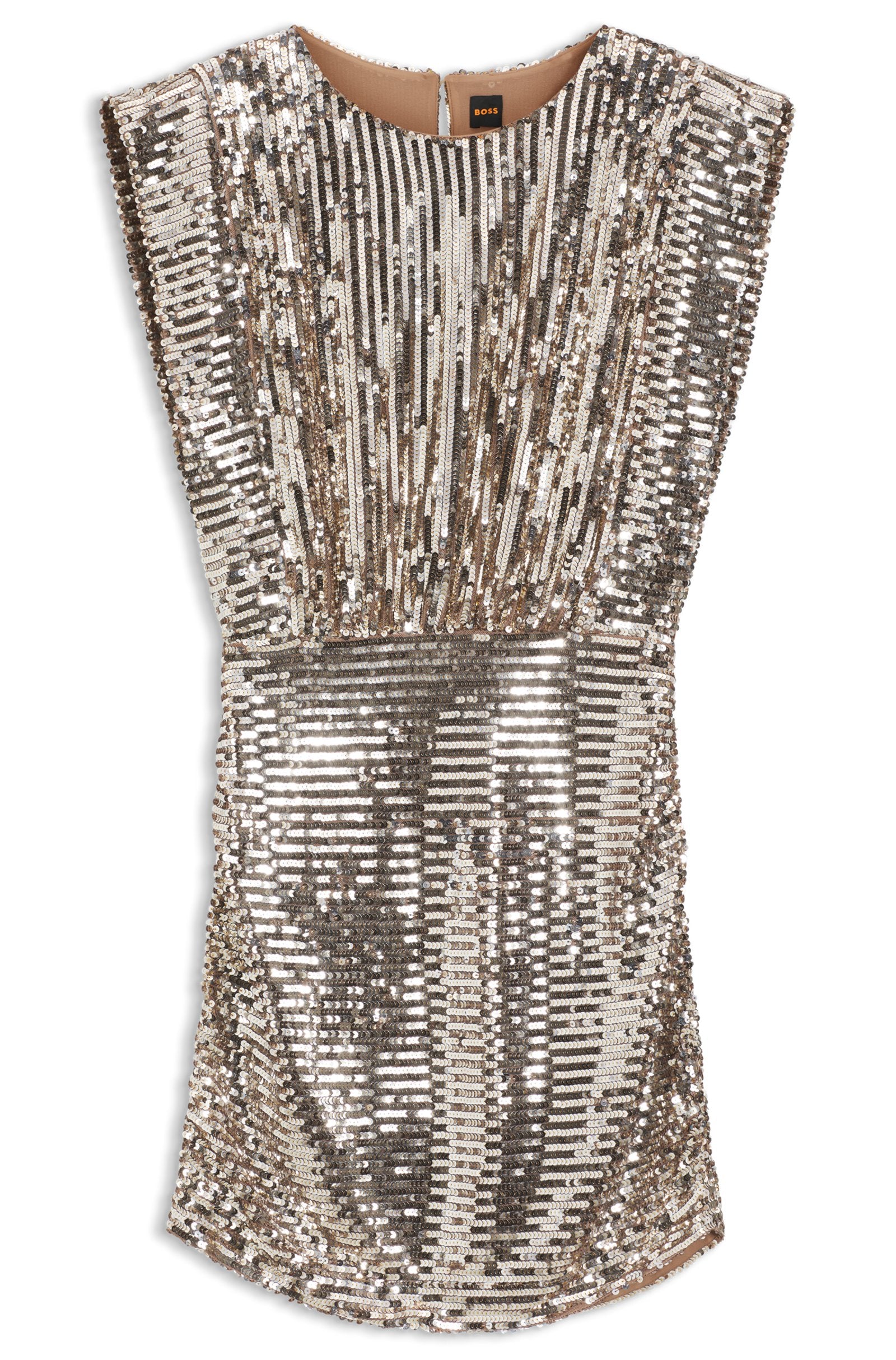 Go for effortless evening glamour with this sequinned BOSS Womenswear dress. Its slim fit, with shoulder pads and gathered sides, creates a flattering silhouette.