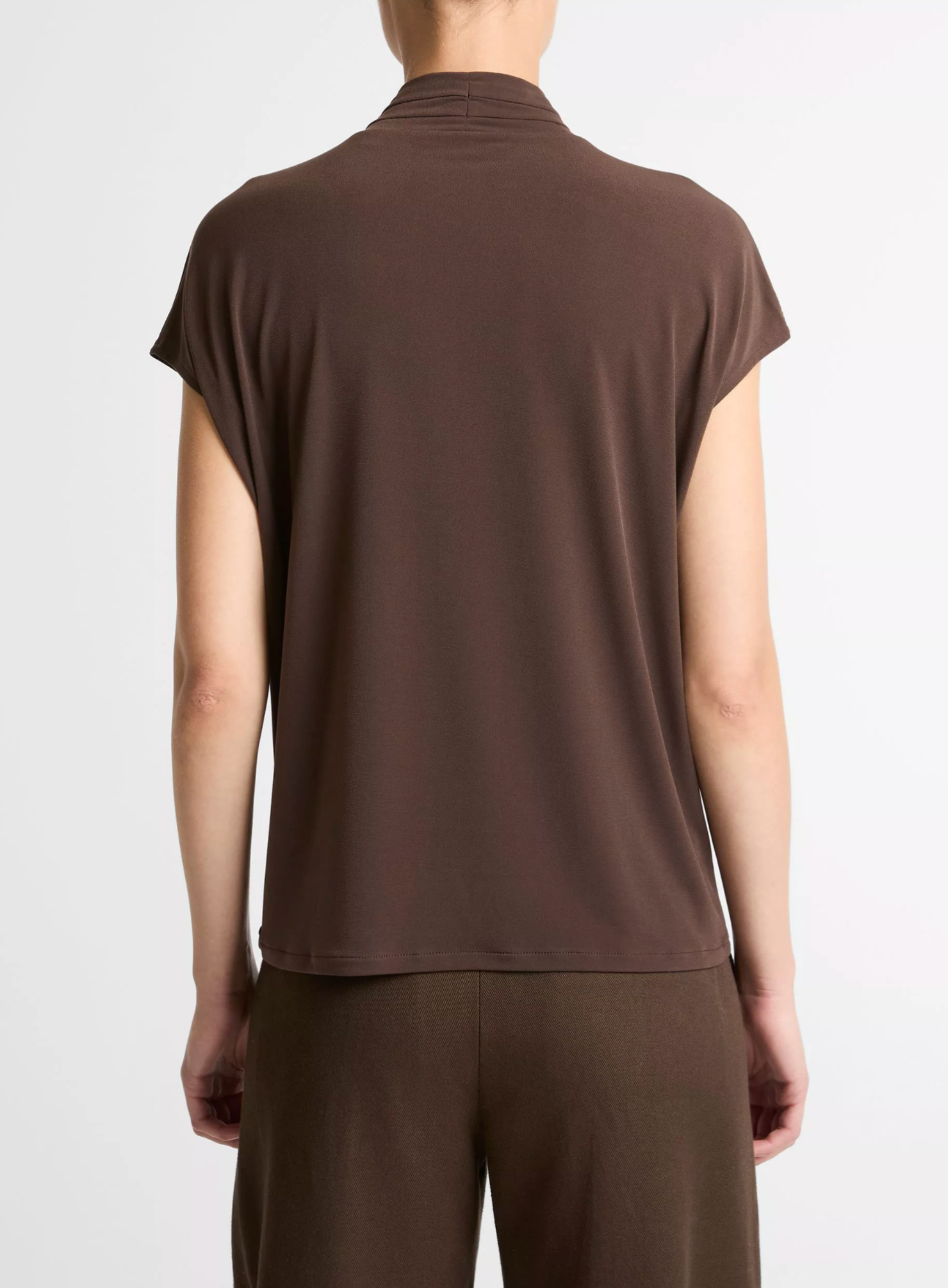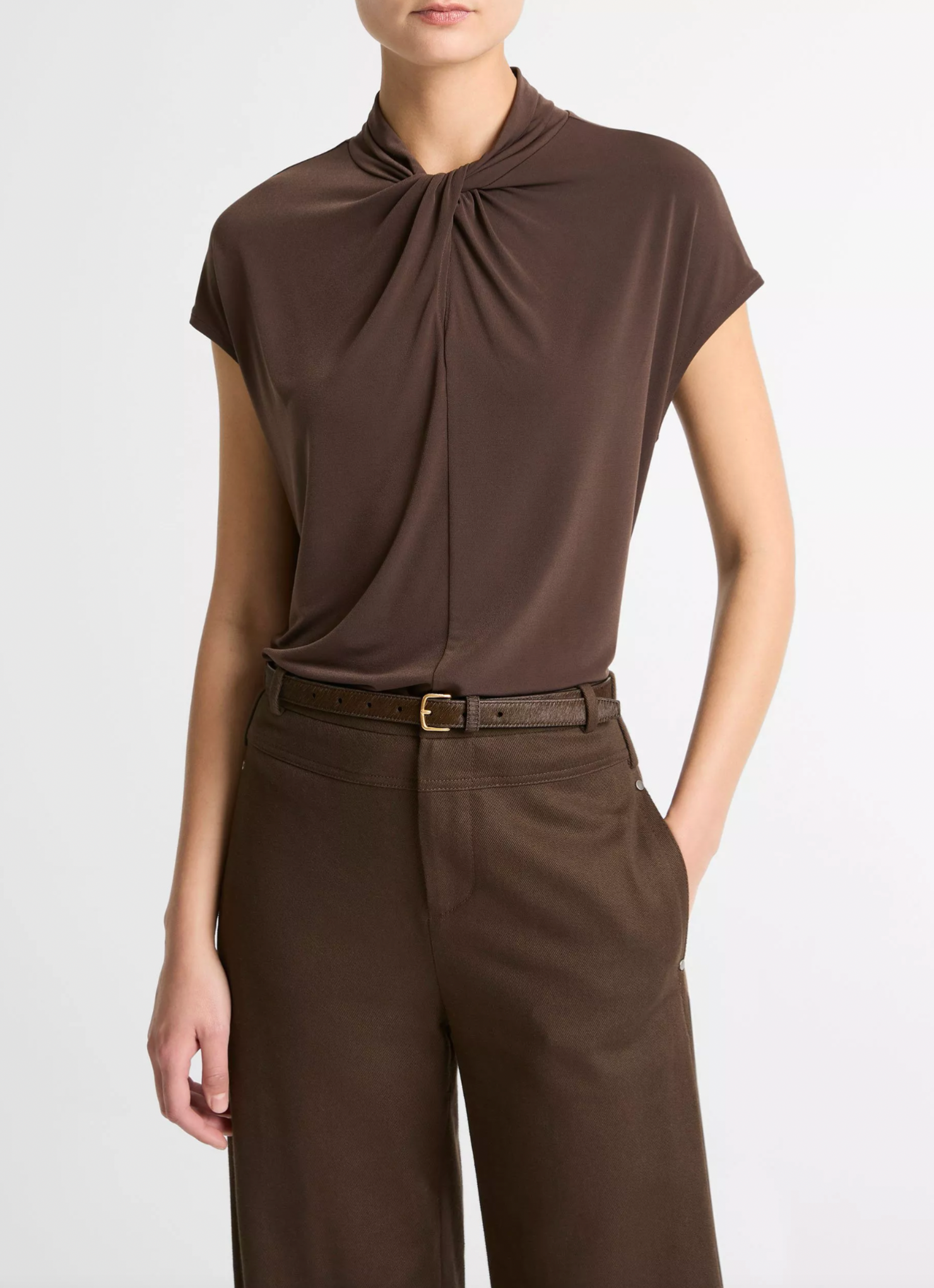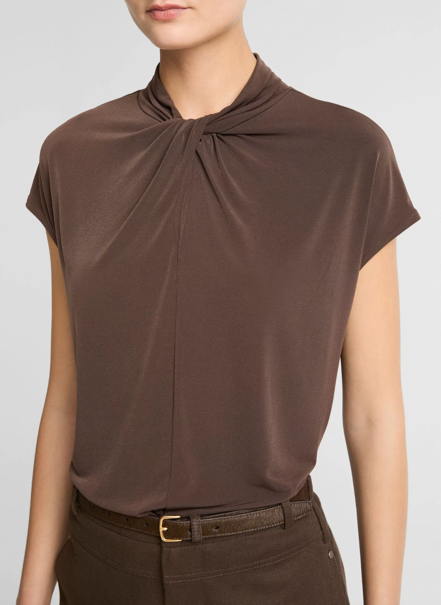 Fluid matte jersey lends this top a dressier appeal, instantly elevating trousers and denim alike through its twist neck and cap sleeves.