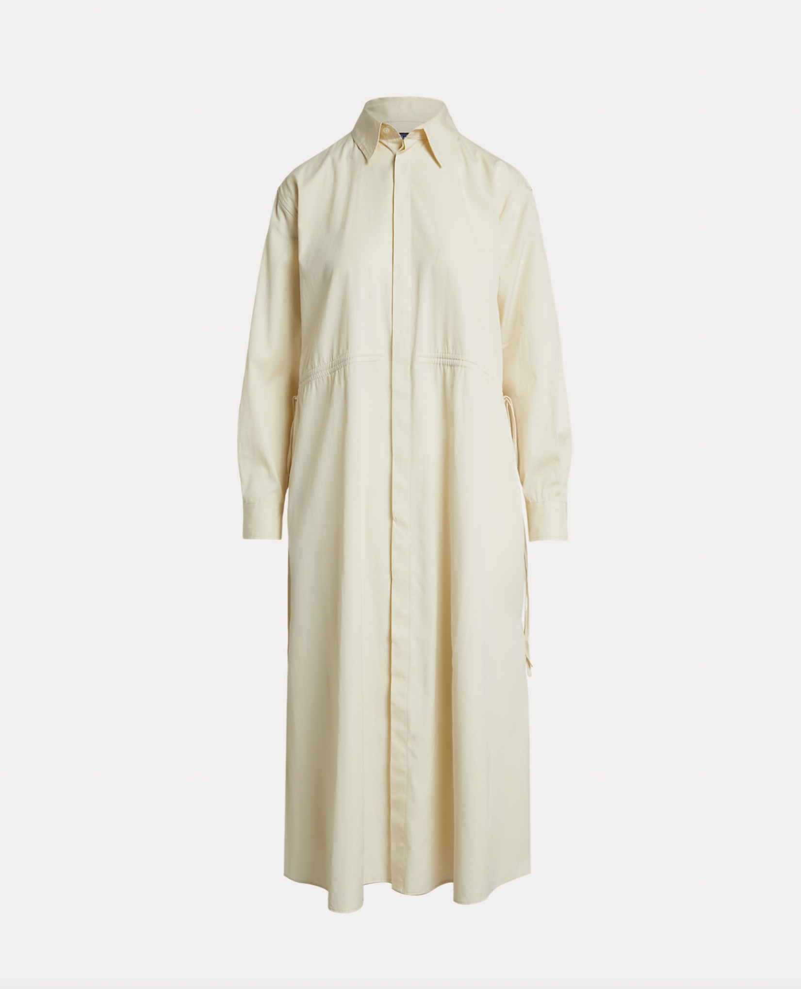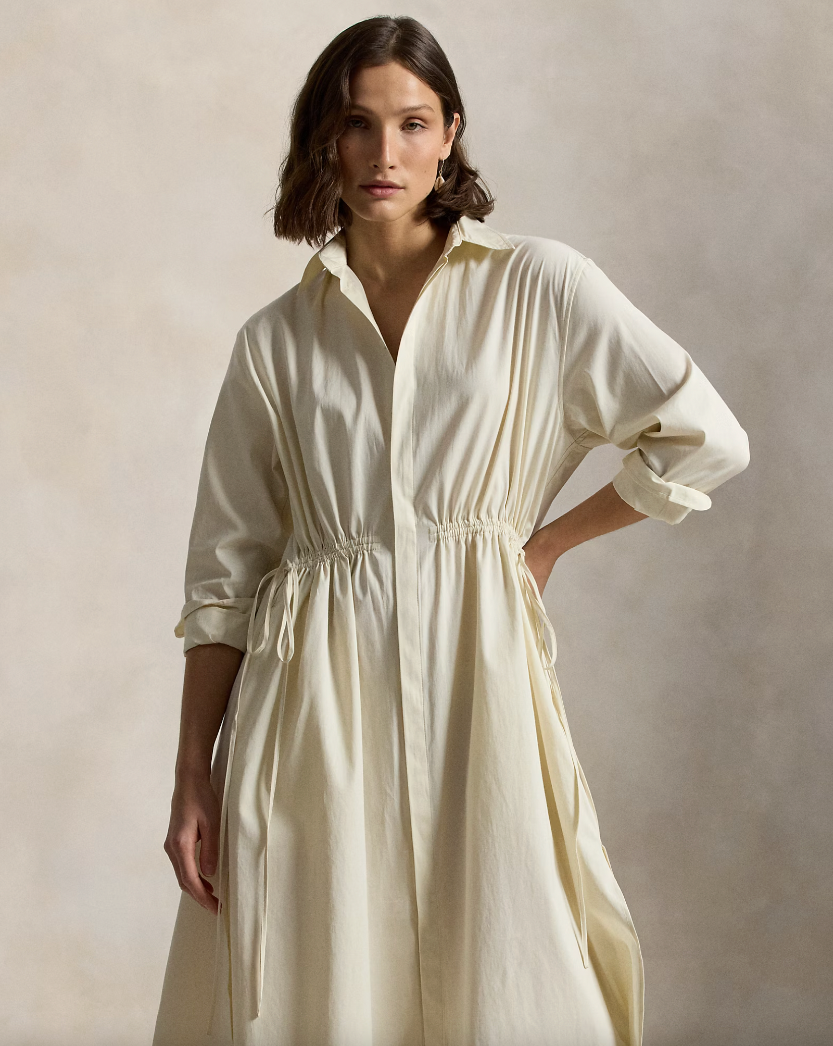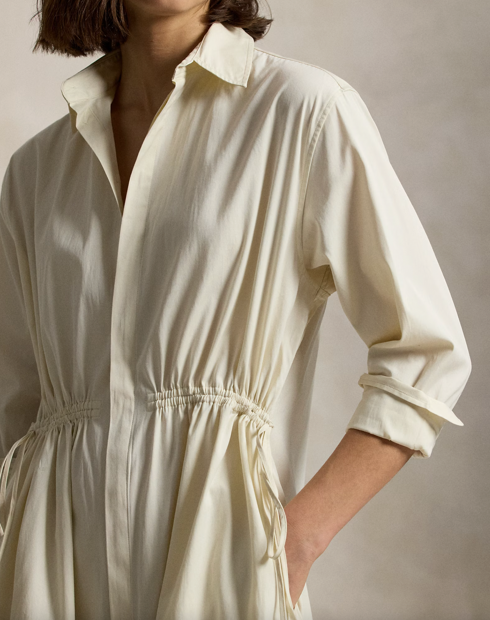 This relaxed A-line shirtdress is crafted with lightweight cotton for breathability and a tailored drape. Self-drawcord ties at the front waist create gathered texture while offering an adjustable fit.