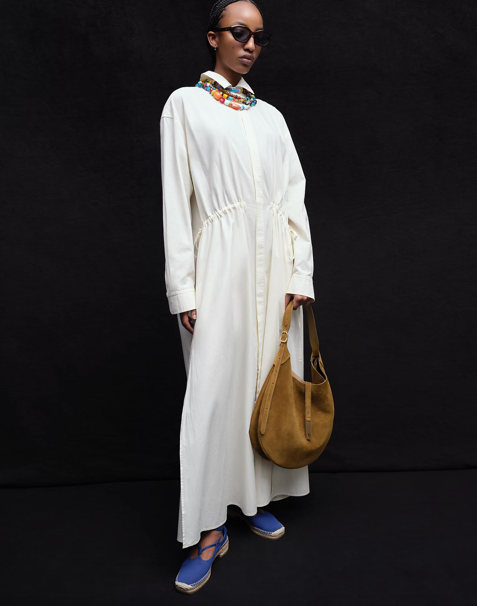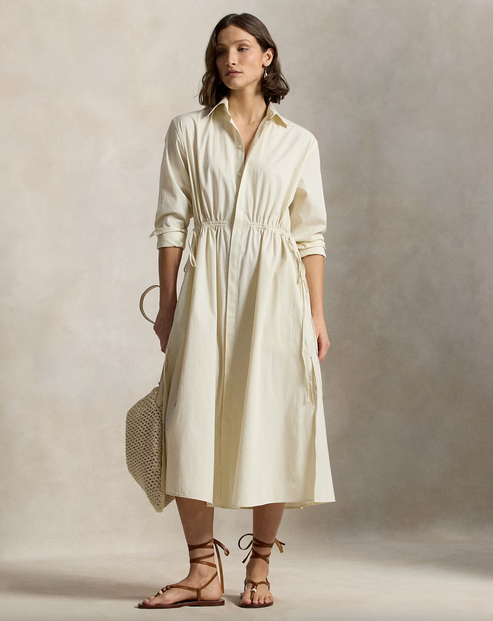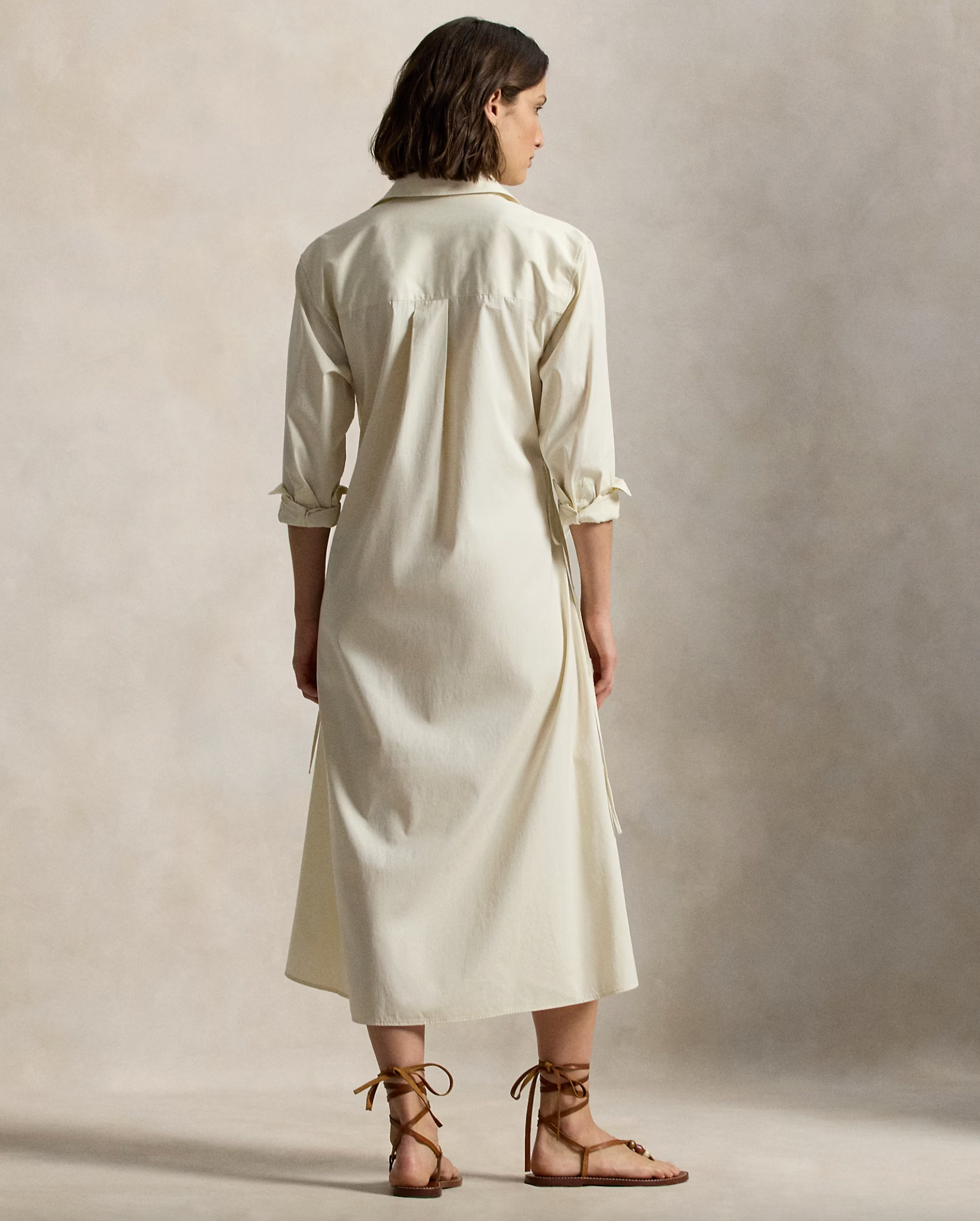 This relaxed A-line shirtdress is crafted with lightweight cotton for breathability and a tailored drape. Self-drawcord ties at the front waist create gathered texture while offering an adjustable fit.