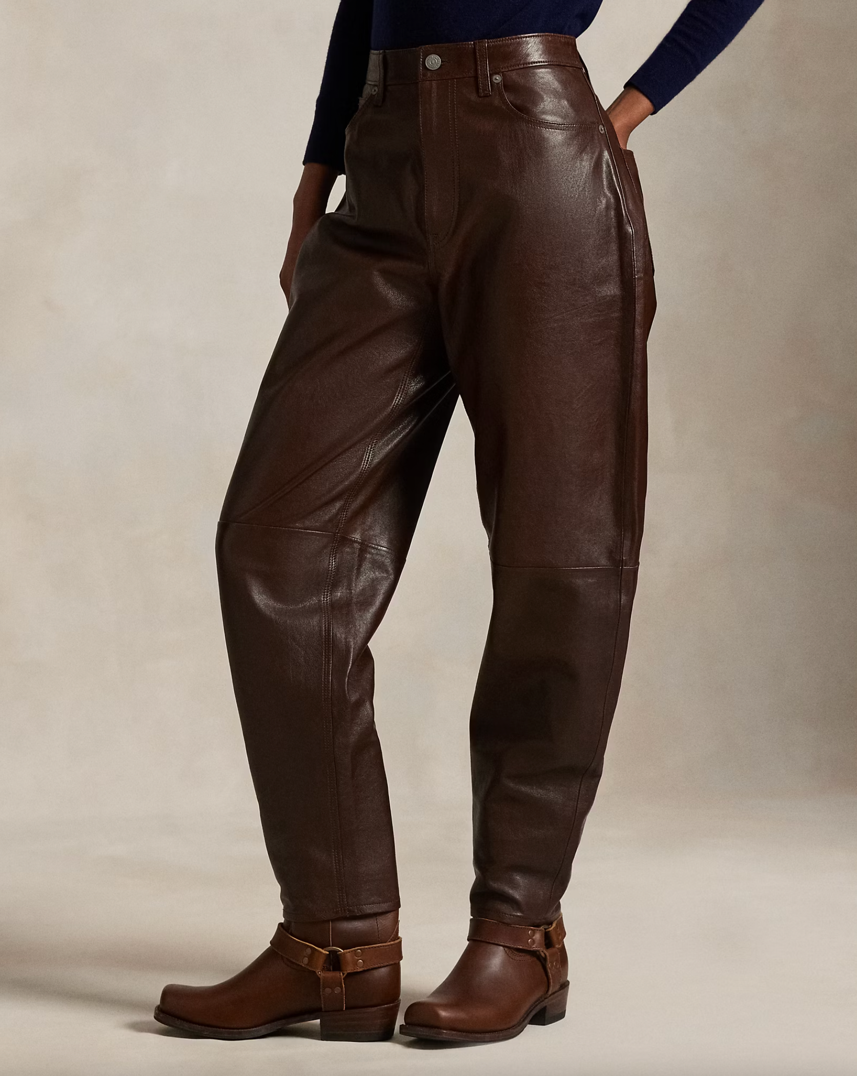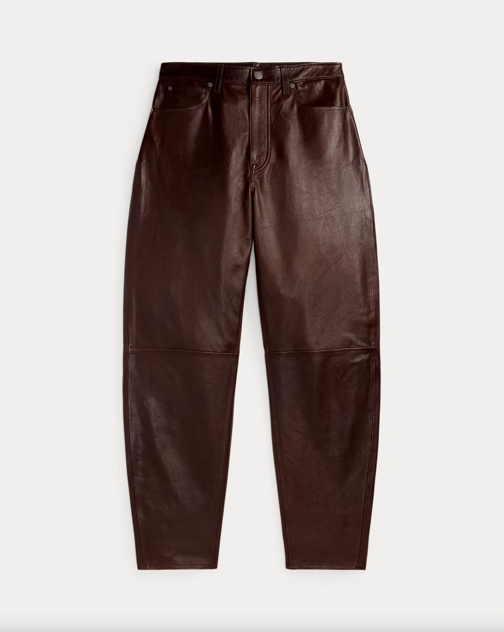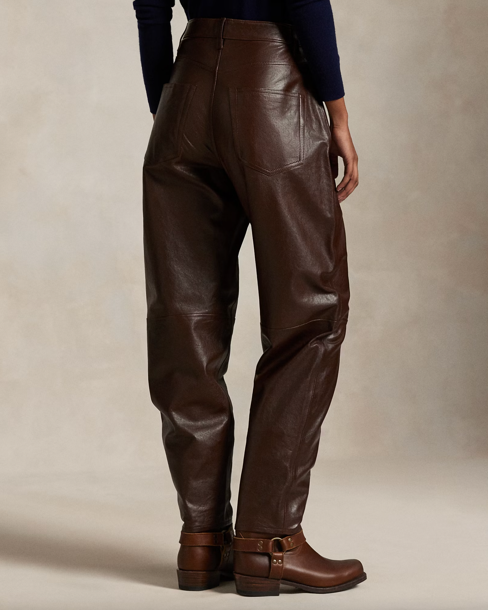Finely crafted with supple full-grain lambskin, these high-waisted trousers combine a relaxed curved leg and tapered thigh with five-pocket styling and custom-developed hardware.