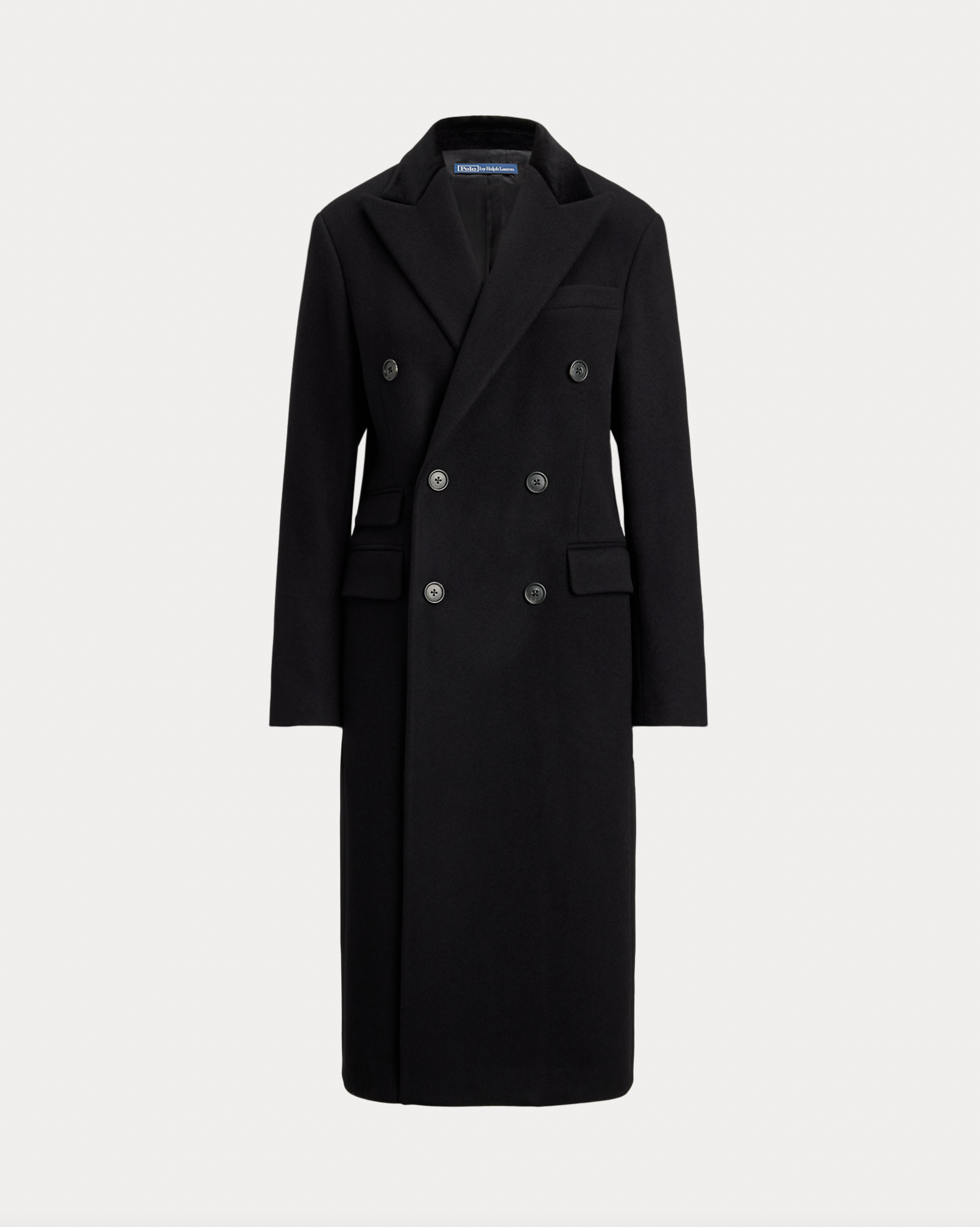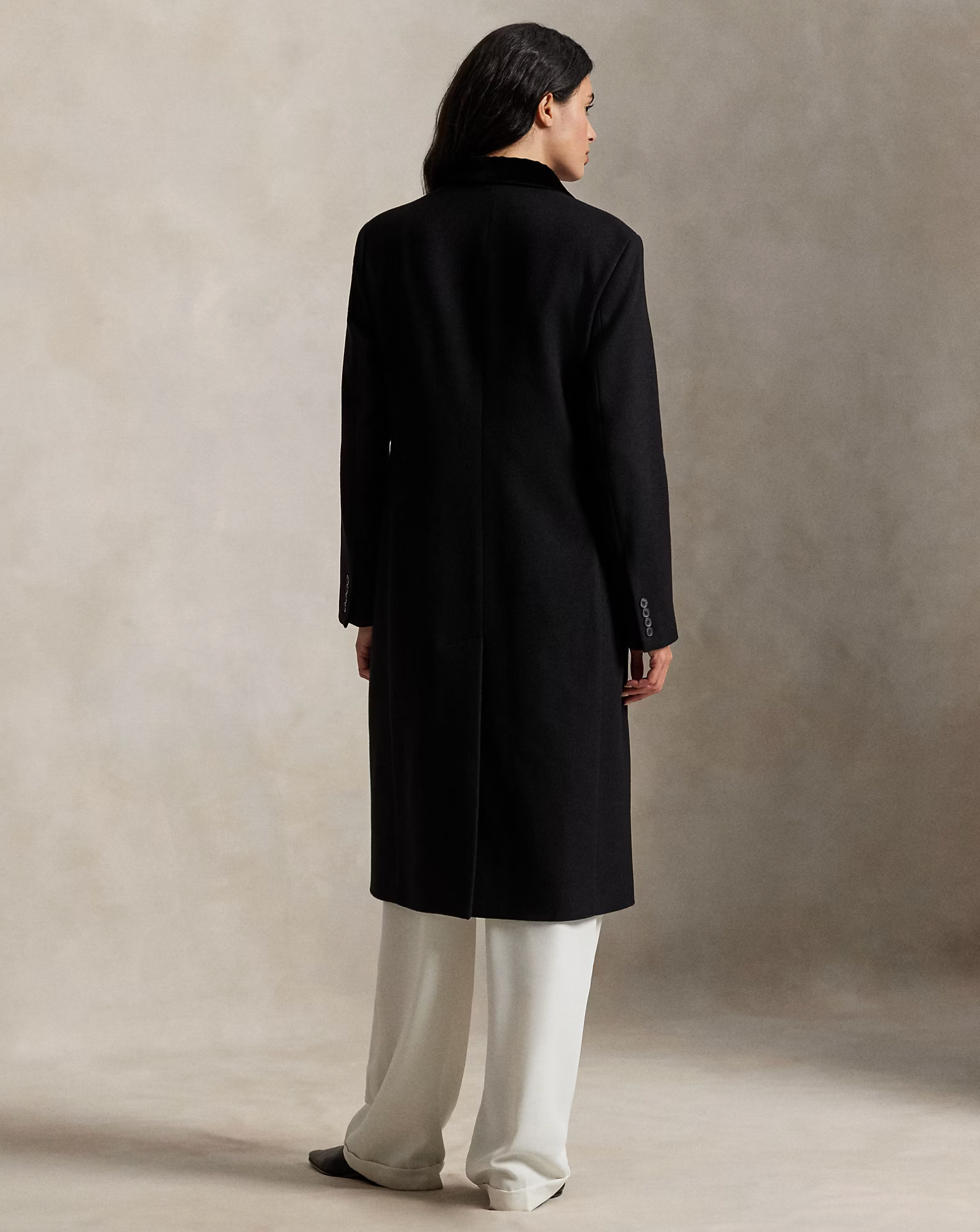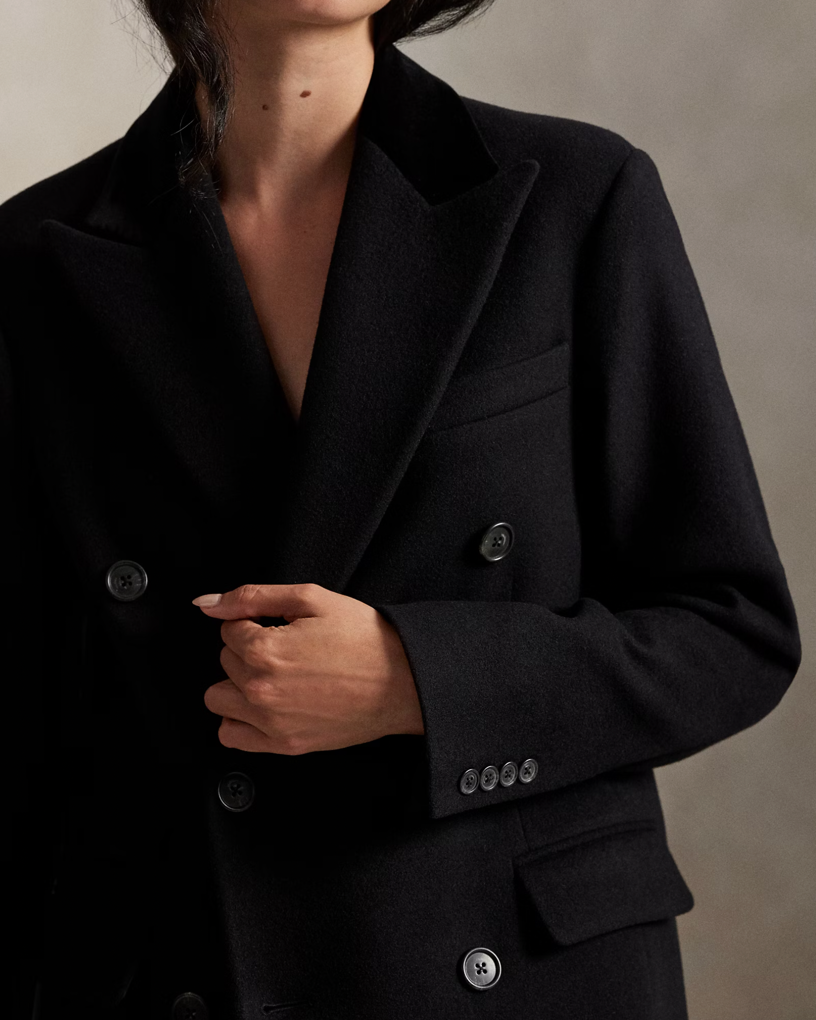 Italian wool melton lends luxurious weight to this menswear-inspired coat, which features a double-breasted silhouette with peak lapels and a velvet top collar.