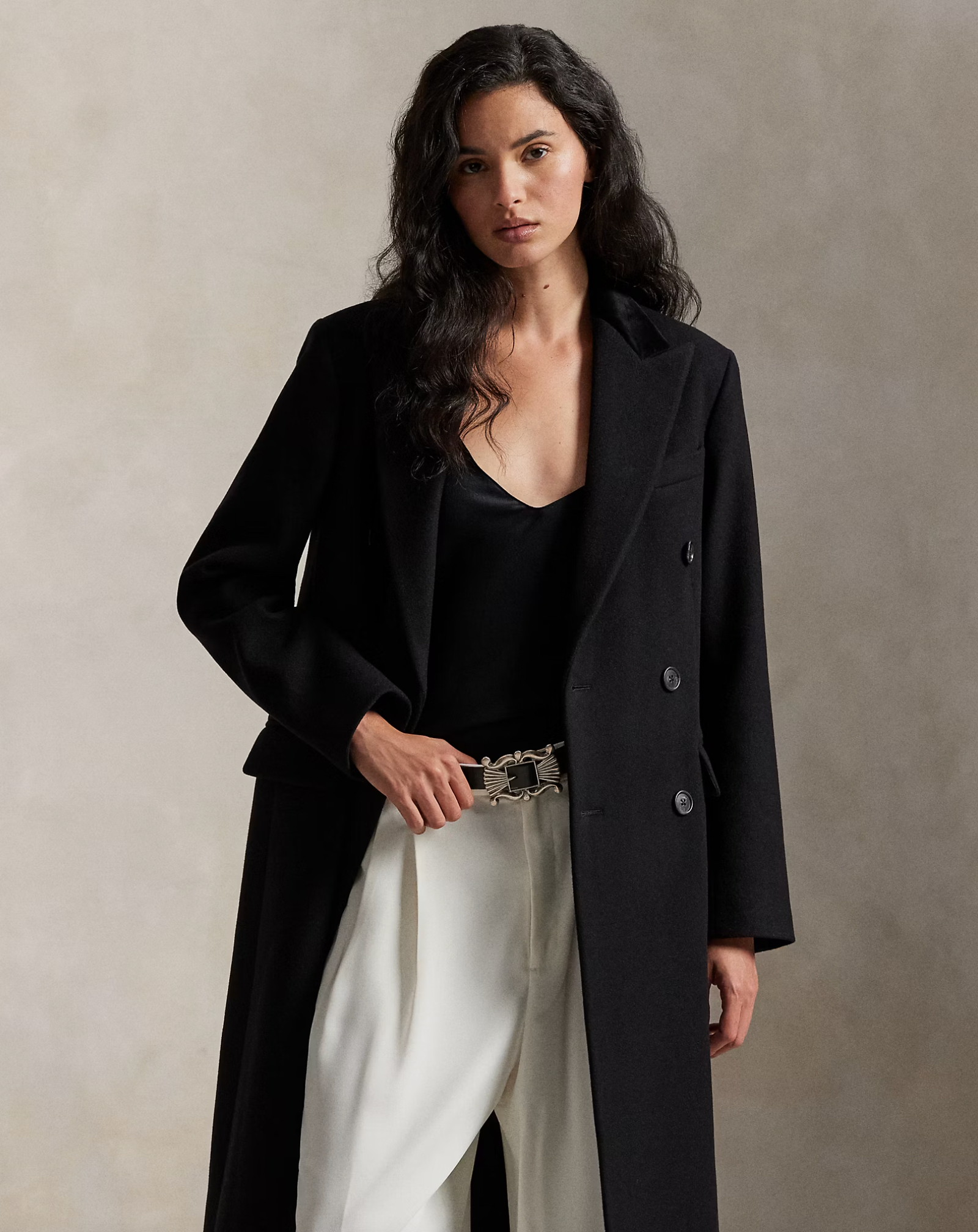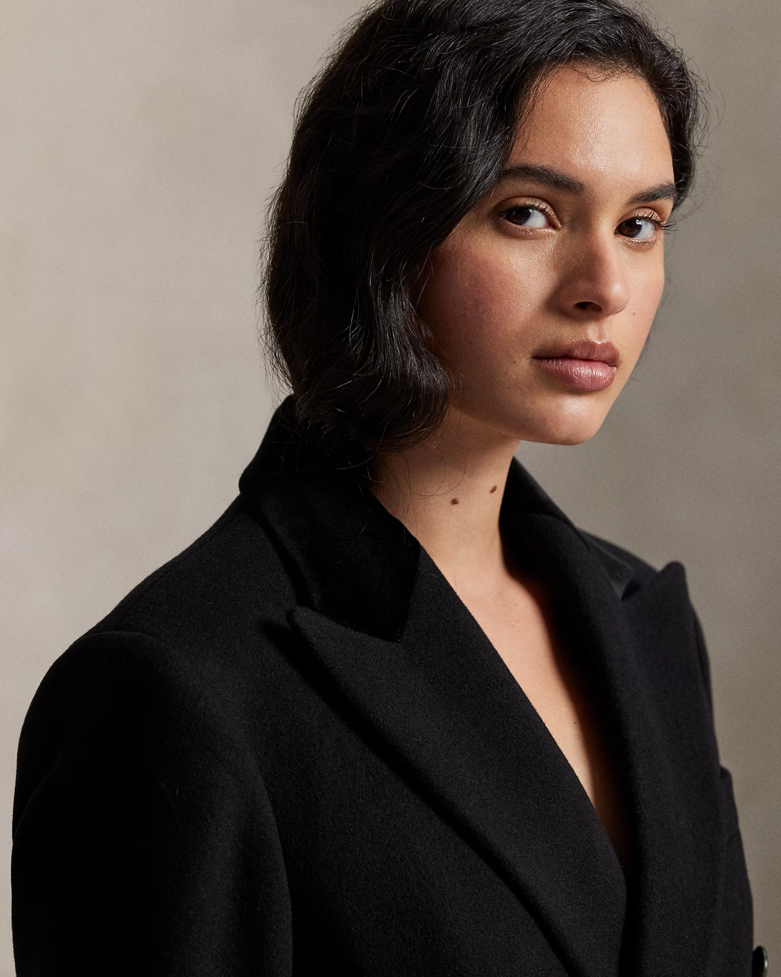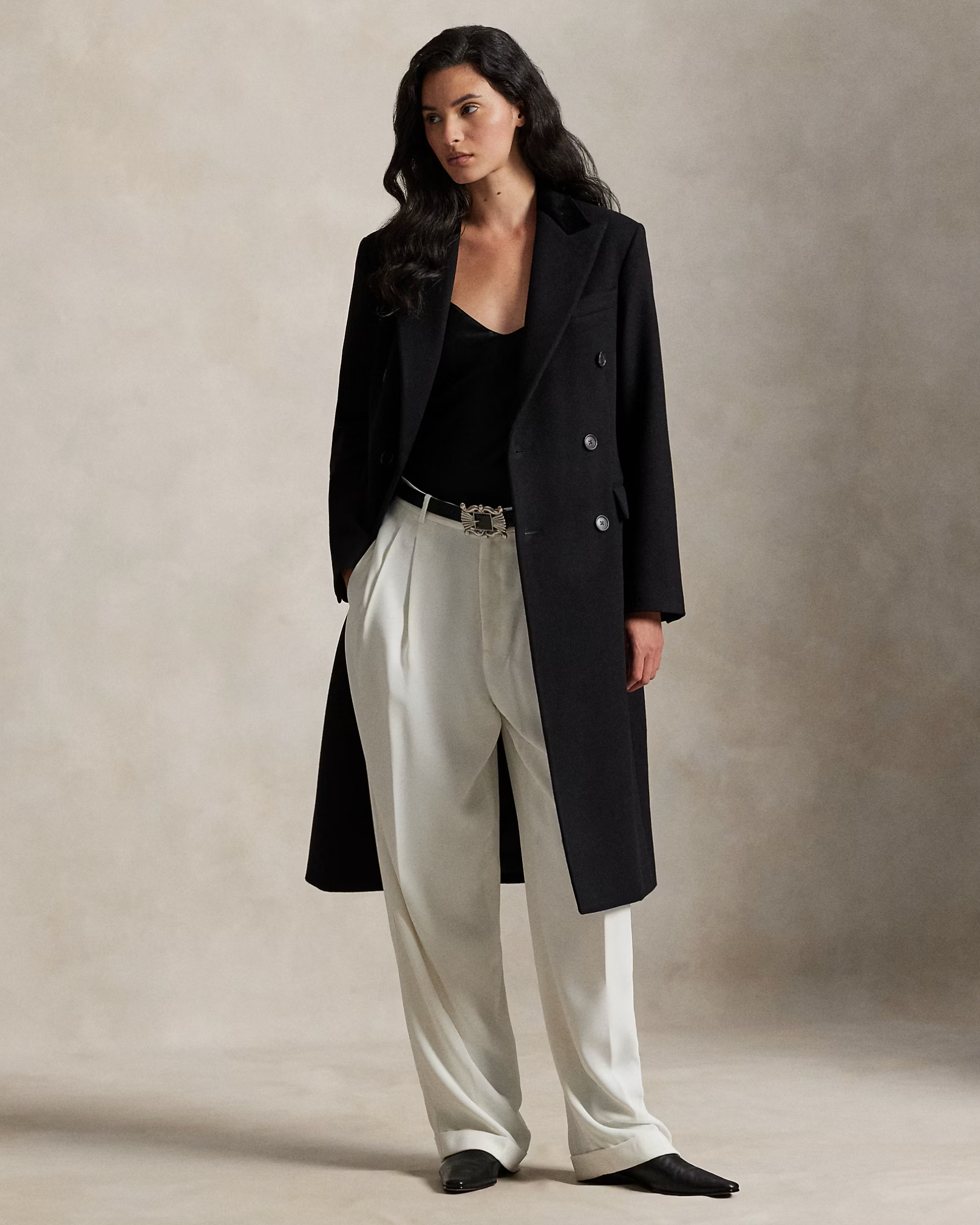 Italian wool melton lends luxurious weight to this menswear-inspired coat, which features a double-breasted silhouette with peak lapels and a velvet top collar.