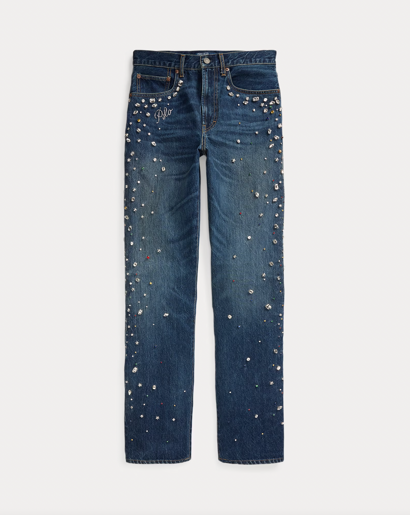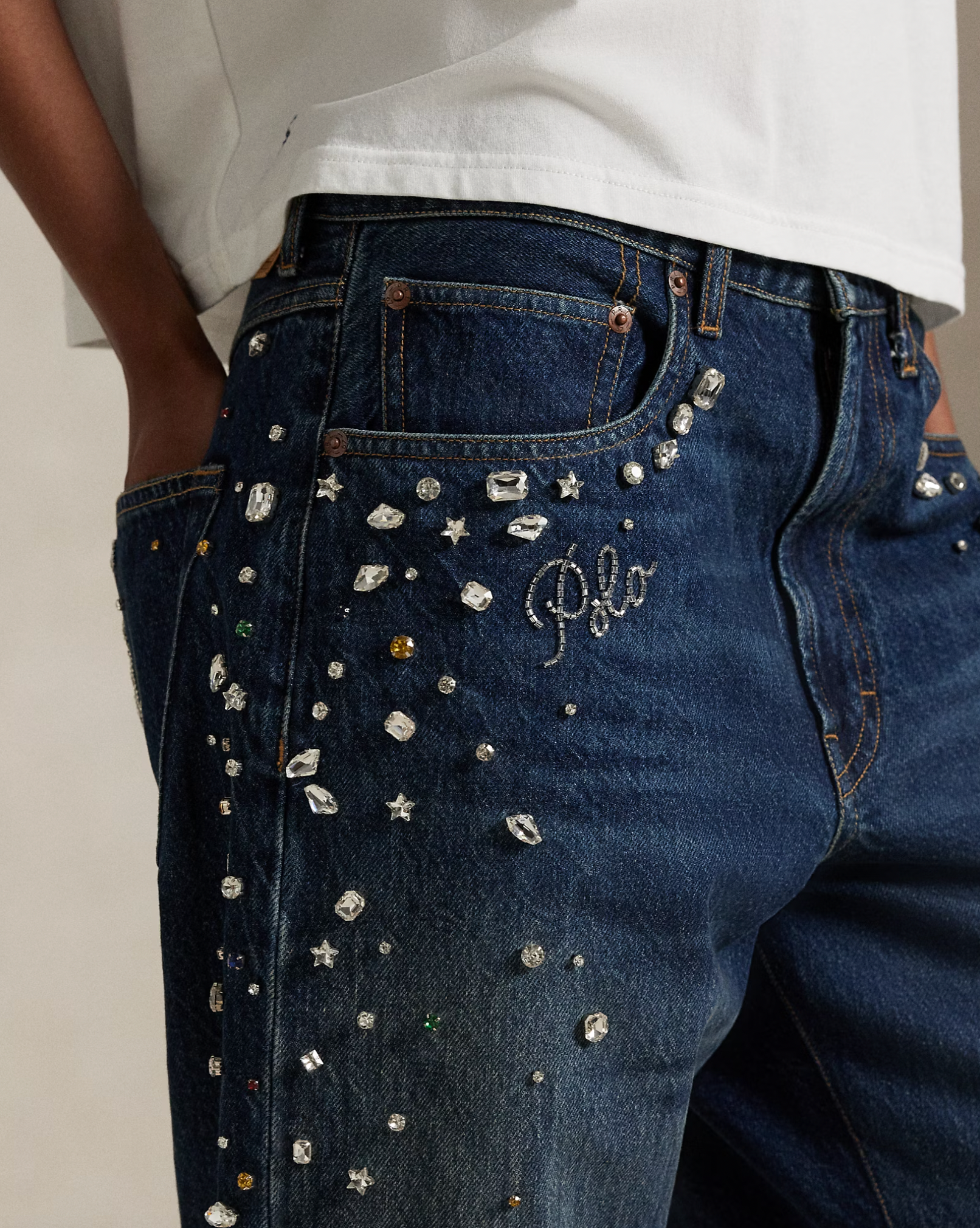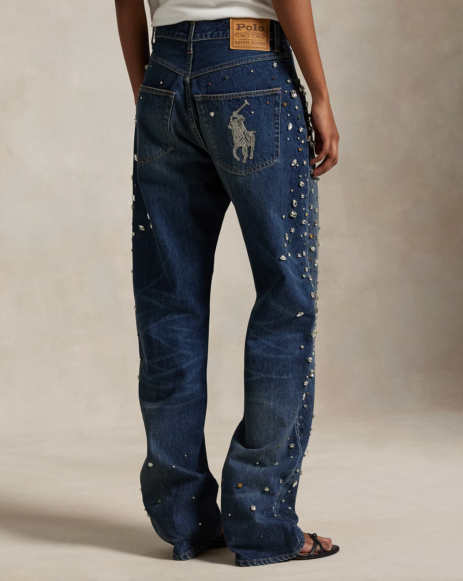 Expertly crafted from medium-weight denim with subtle slub character, these Relaxed Straight jeans feature a vintage-inspired wash enhanced by hand-sanding, whiskers, and grinding at the seams. Scattered rhinestone embellishments accent each side, complemented by a beaded “Polo” logo and our signature rhinestone Big Pony for a luxe finish.