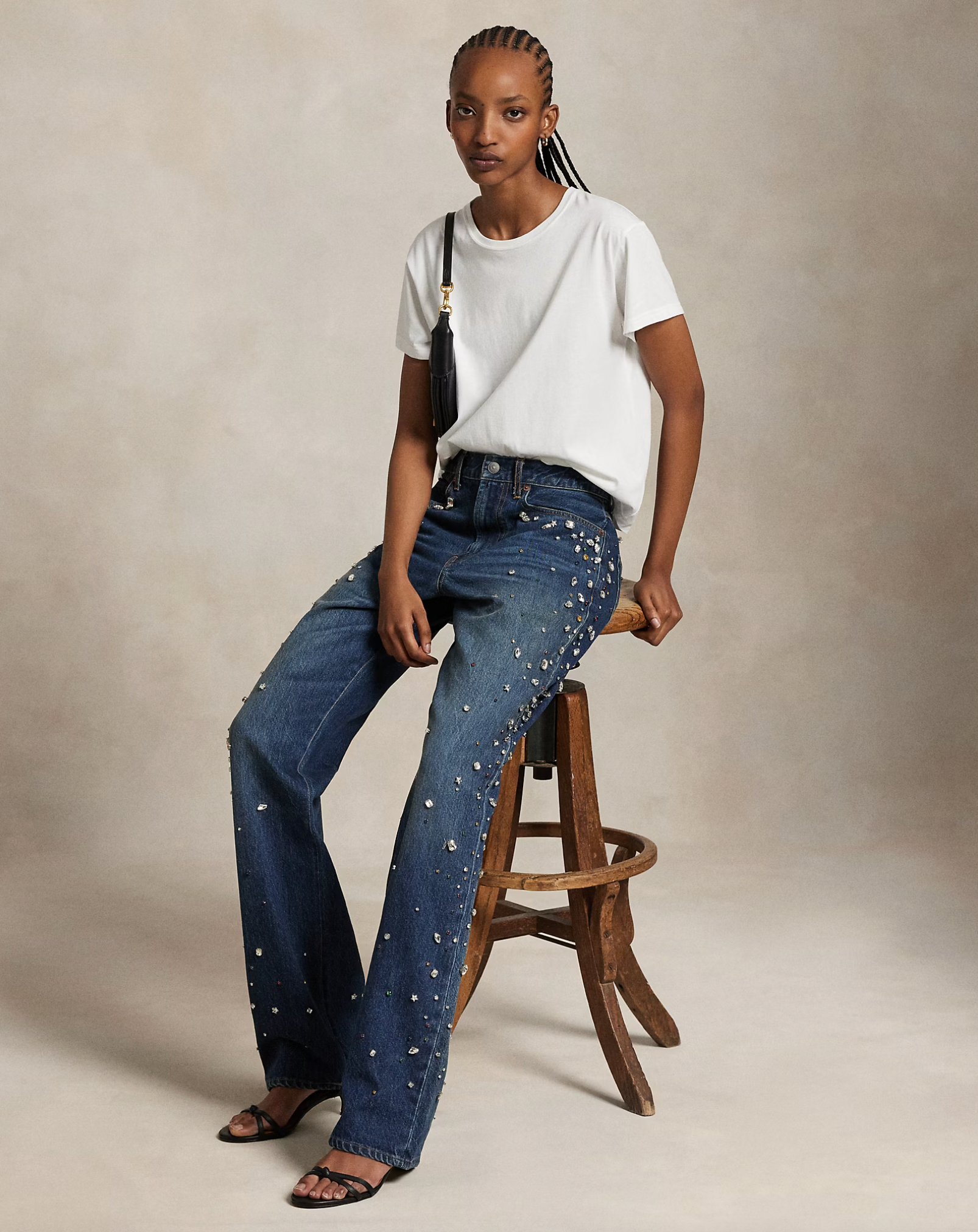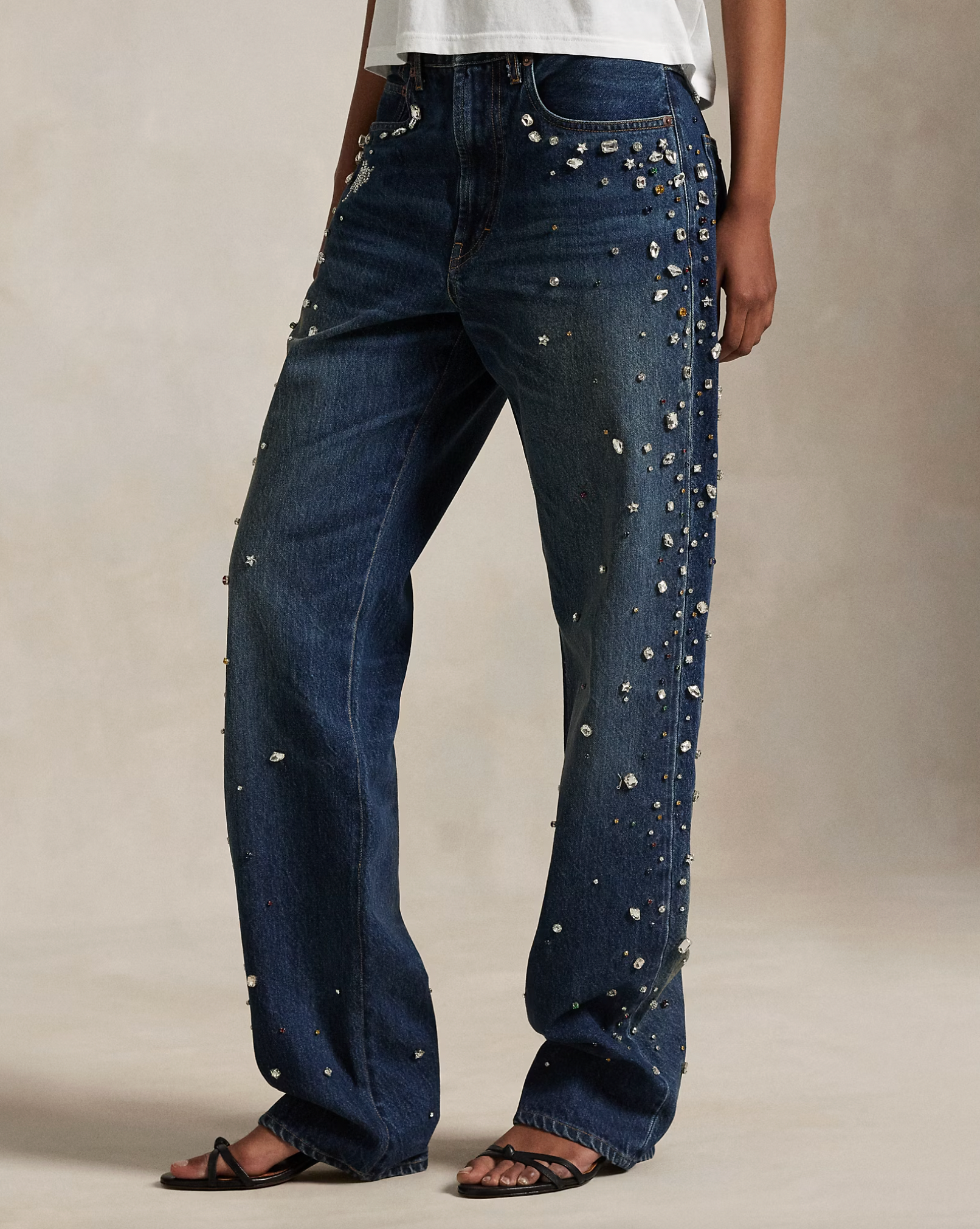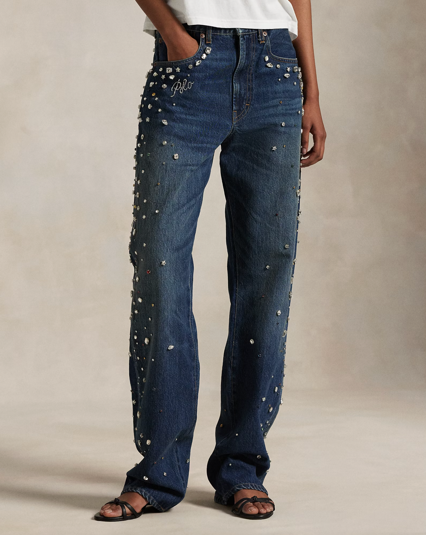 Expertly crafted from medium-weight denim with subtle slub character, these Relaxed Straight jeans feature a vintage-inspired wash enhanced by hand-sanding, whiskers, and grinding at the seams. Scattered rhinestone embellishments accent each side, complemented by a beaded “Polo” logo and our signature rhinestone Big Pony for a luxe finish.