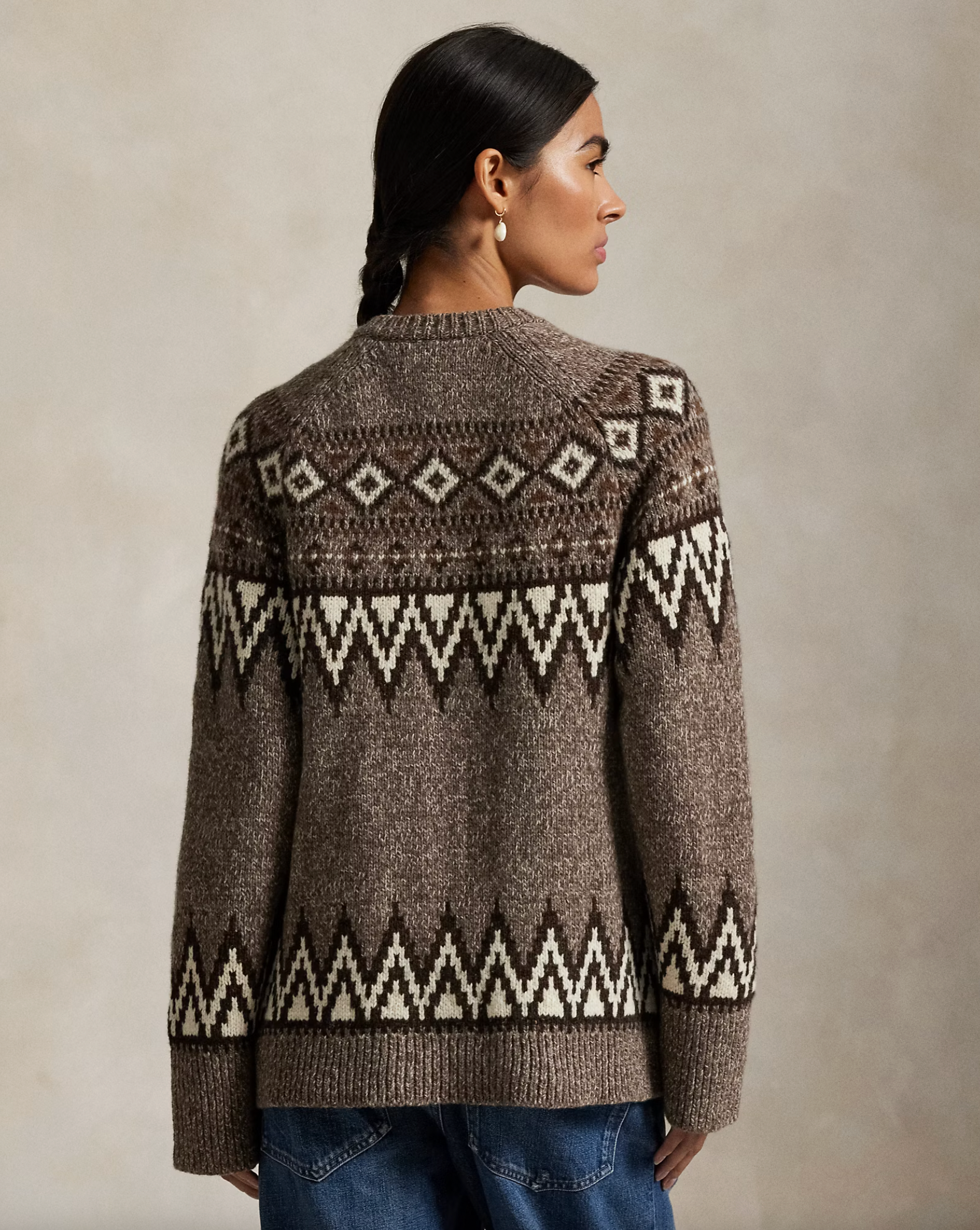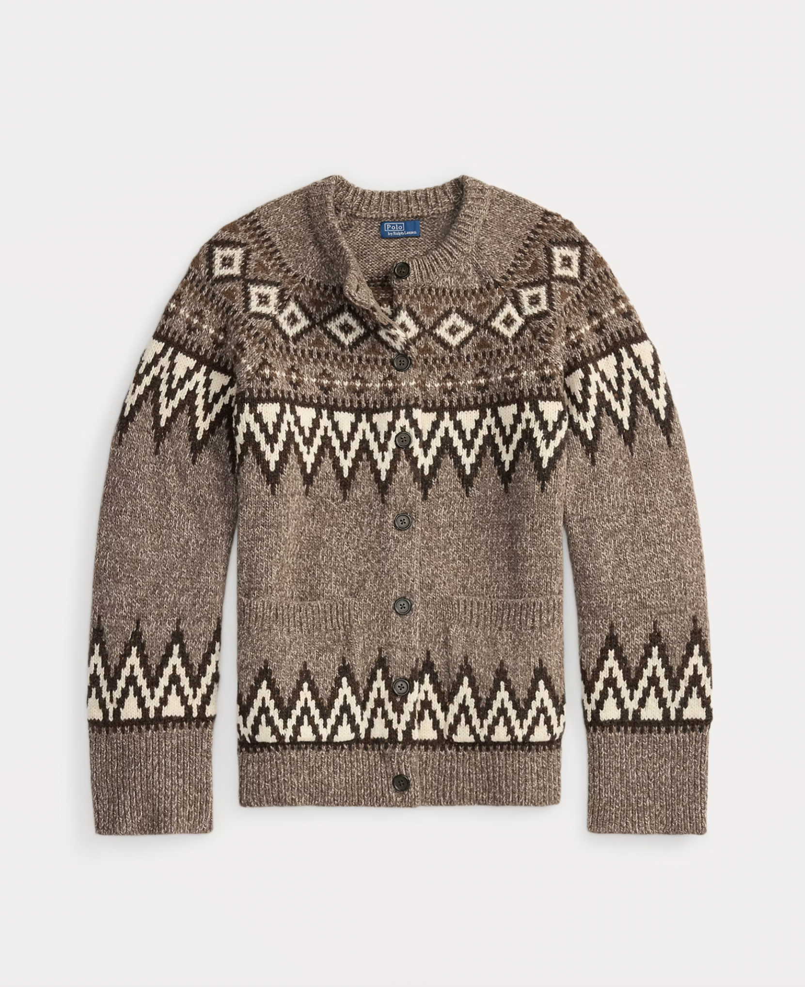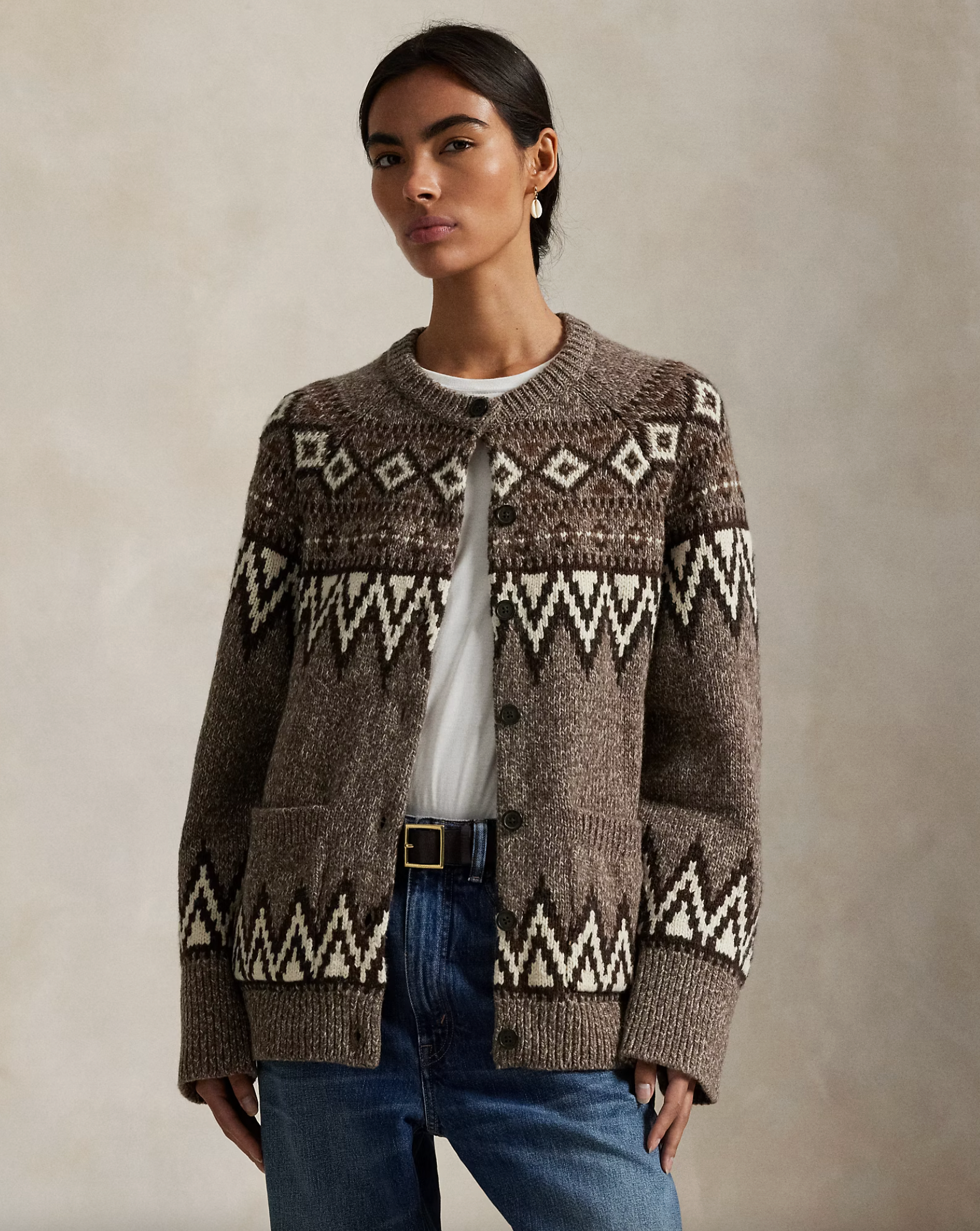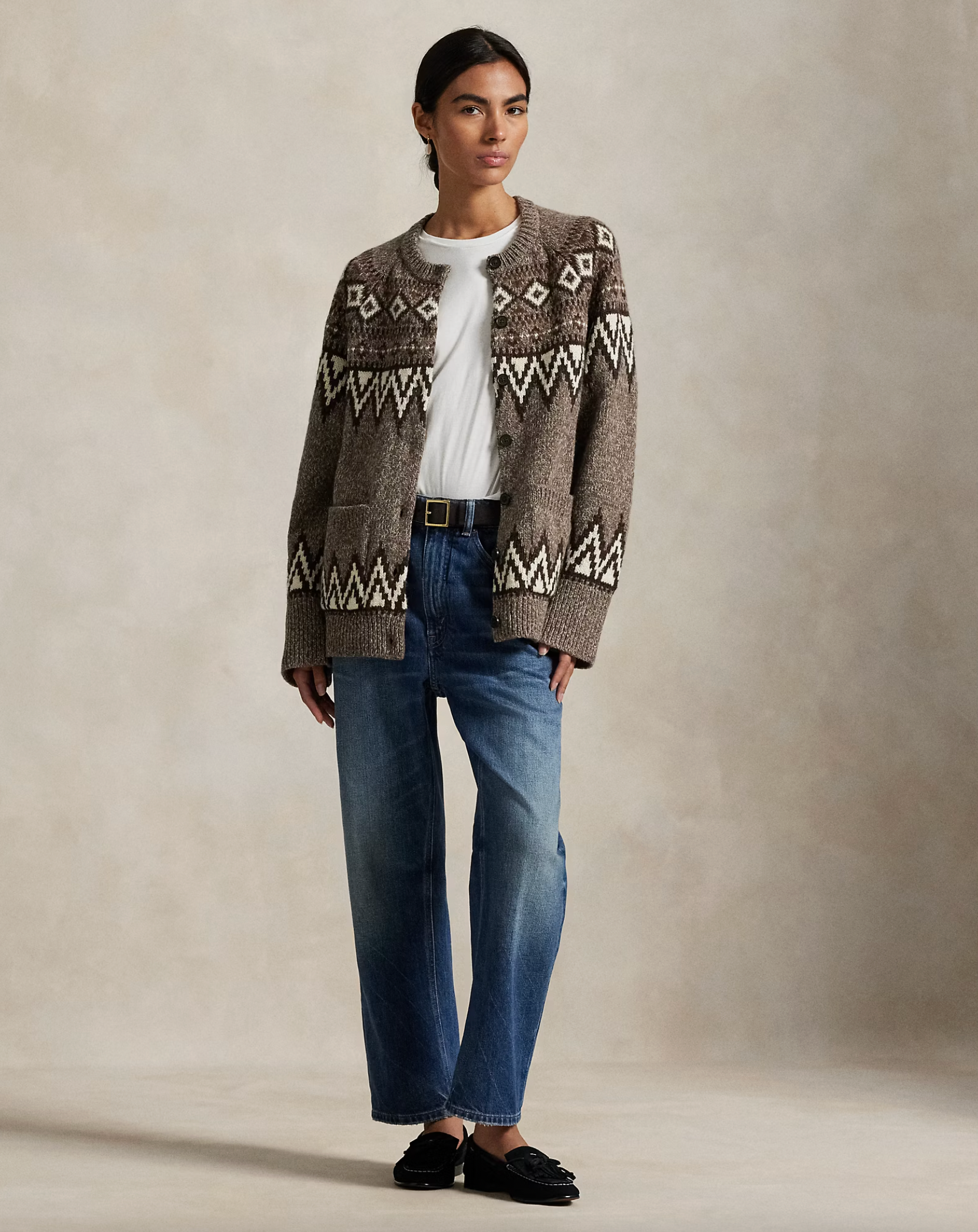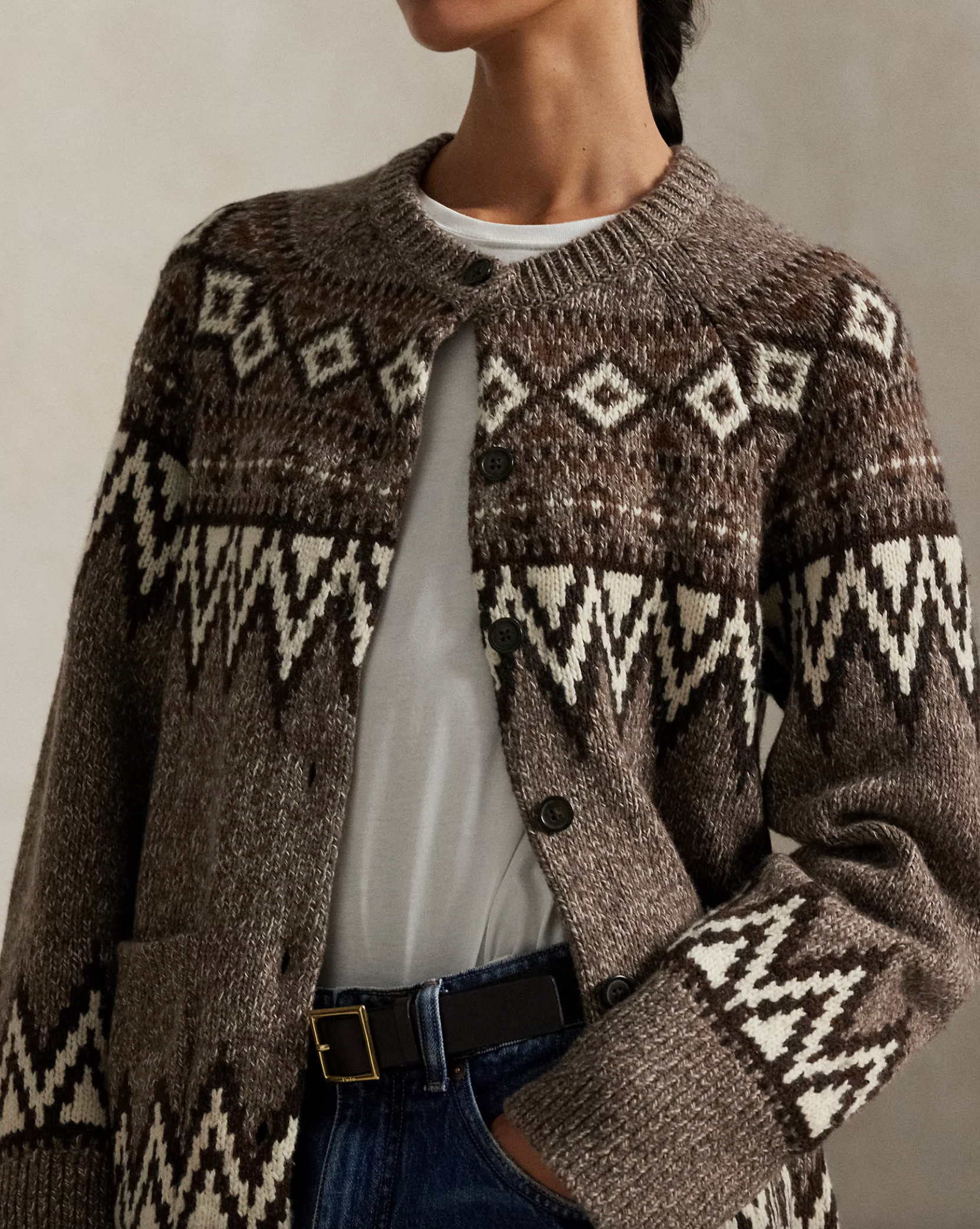 This buttoned cardigan is decorated with a Fair Isle-inspired motif, which is skilfully rendered using heavyweight wool blend yarns and a jacquard knitting technique.