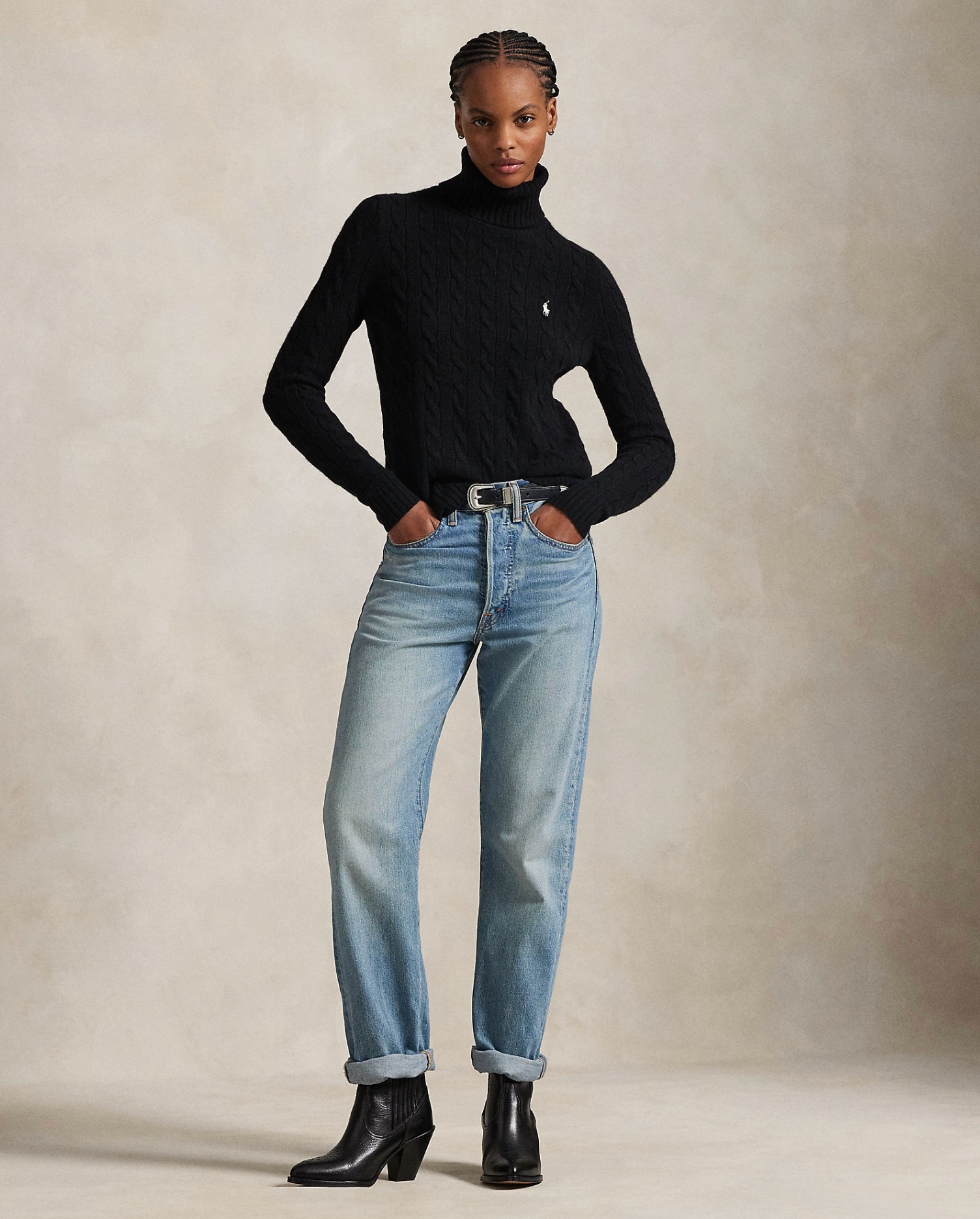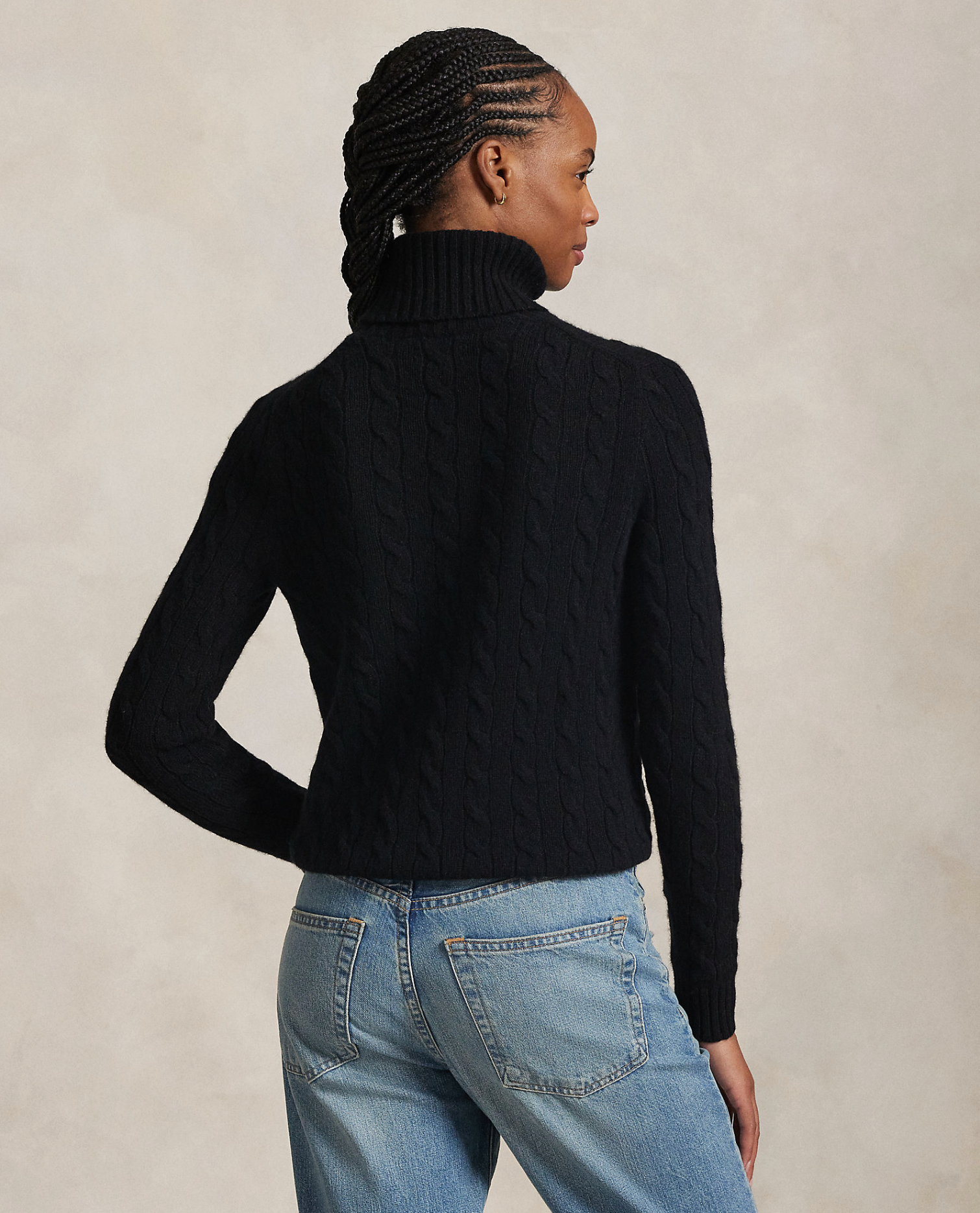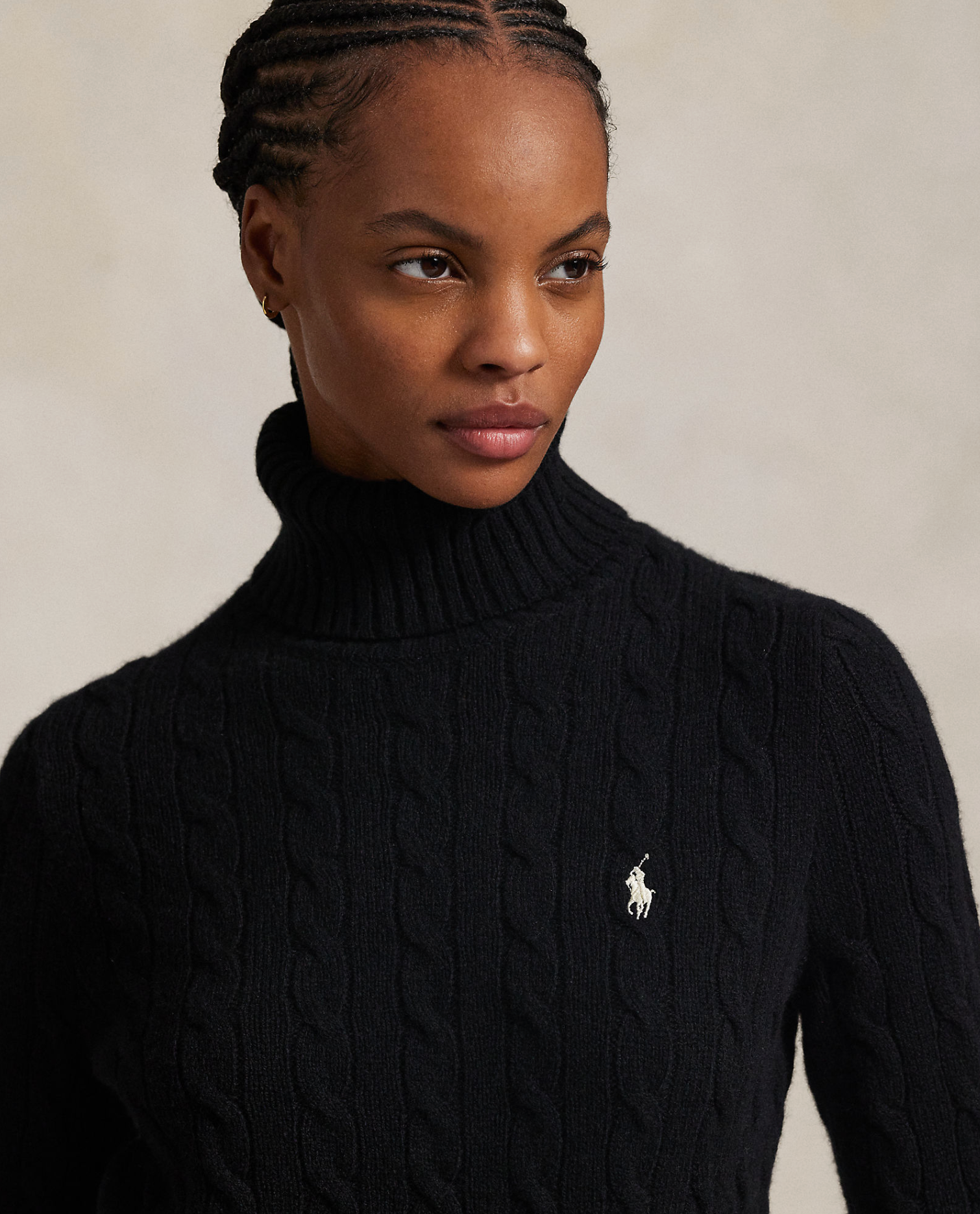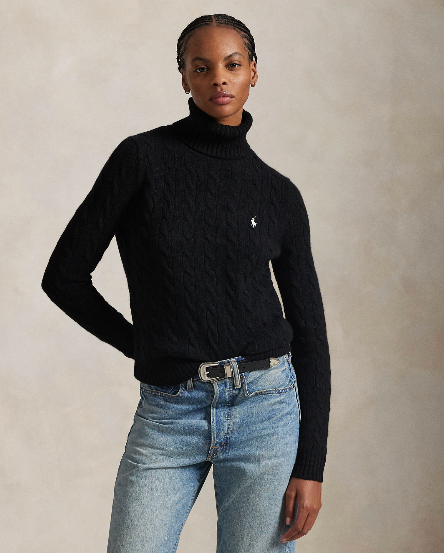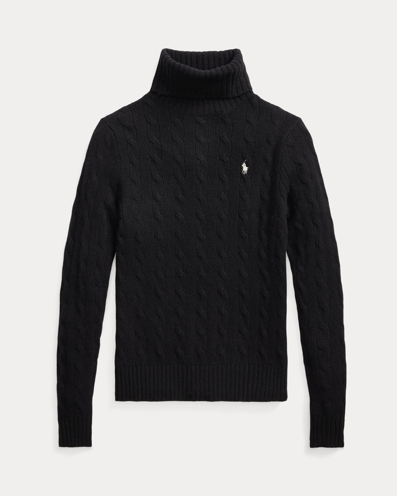 Polo's signature cable-knit construction lends soft texture to this wool-and-cashmere turtleneck sweater. Our embroidered Pony accents the chest.